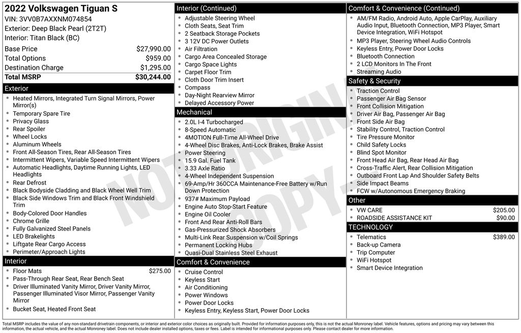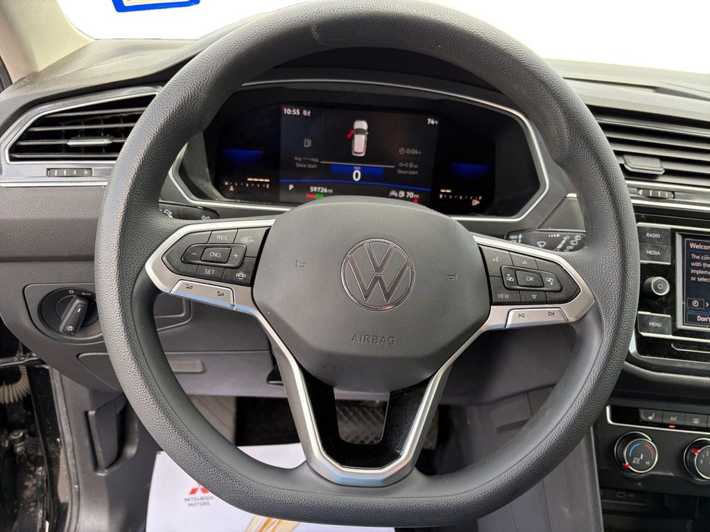 2022 Volkswagen Tiguan 2.0T S Certified. Deep Black 2.0T S AWD 8-Speed Automatic with Tiptronic 2.0L TSI DOHC Volkswagen Certified, AWD, 2-Row Rubber Monster Mats w/Logo Kit (Set of 4), 3.33 Axle Ratio, 4-Wheel Disc Brakes, 4-Wheel Independent Suspension, 6 Speakers, ABS brakes, Air Conditioning, Alloy wheels, AM/FM radio, Brake assist, Bumpers: body-color, Cloth Seating Surfaces, Compass, Delay-off headlights, Driver door bin, Driver vanity mirror, Dual front impact airbags, Dual front side impact airbags, Electronic Stability Control, Emergency communication system: Car-Net, Exterior Parking Camera Rear, Forward collision: FCW w/Autonomous Emergency Braking mitigation, Four wheel independent suspension, Front anti-roll bar, Front Bucket Seats, Front Center Armrest, Front reading lights, Fully automatic headlights, Heated door mirrors, Heated Front Bucket Seats, Heated front seats, Heavy Duty Trunk Liner w/VW CarGo Blocks, Illuminated entry, Leather Shift Knob, Low tire pressure warning, Occupant sensing airbag, Outside temperature display, Overhead airbag, Overhead console, Panic alarm, Passenger door bin, Passenger vanity mirror, Power door mirrors, Power steering, Power windows, Radio data system, Radio: Composition Color AM/FM, Rear anti-roll bar, Rear reading lights, Rear seat center armrest, Rear window defroster, Rear window wiper, Remote keyless entry, Roadside Assistance Kit, Roof rack: rails only, Speed control, Speed-sensing steering, Split folding rear seat, Spoiler, Steering wheel mounted audio controls, Tachometer, Telescoping steering wheel, Tilt steering wheel, Traction control, Trip computer, Turn signal indicator mirrors, Variably intermittent wipers, VW Car-Net Safe & Secure 5-Yr Prepaid Subscription, VW Care, Wheels: 17" 2-Tone Machined Twin 5-Spoke Alloy, AWD.