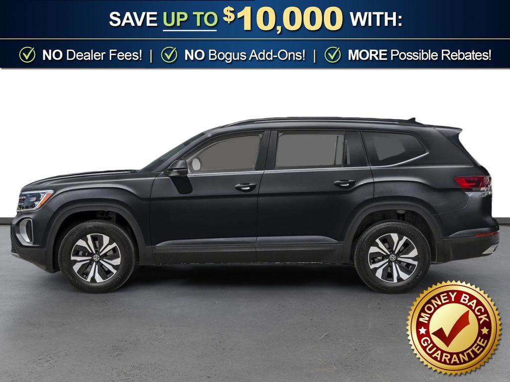 Deep Black Pearl 2026 Volkswagen Atlas 2.0T SE w/Technology NVT FWD 8-Speed Automatic with Tiptronic 2.0L TSI 3rd row seats: split-bench, 4-Wheel Disc Brakes, 4-Wheel Independent Suspension, 6 Speakers, ABS brakes, Air Conditioning, Alloy wheels, AM/FM radio: SiriusXM with 360L, Auto High-beam Headlights, Auto-dimming Rear-View mirror, Automatic temperature control, Brake assist, Bumpers: body-color, Compass, Delay-off headlights, Driver door bin, Driver vanity mirror, Dual front impact airbags, Dual front side impact airbags, Electronic Stability Control, Emergency communication system: VW Car-Net Safe & Secure 5-year, Exterior Parking Camera Rear, Four wheel independent suspension, Front anti-roll bar, Front Bucket Seats, Front Center Armrest, Front dual zone A/C, Front fog lights, Front reading lights, Fully automatic headlights, Garage door transmitter: HomeLink, Heated and Actively Ventilated Front Bucket Seats, Heated door mirrors, Heated front seats, Heated steering wheel, Illuminated entry, Low tire pressure warning, Occupant sensing airbag, Outside temperature display, Overhead airbag, Overhead console, Panic alarm, Passenger door bin, Passenger vanity mirror, Perforated V-Tex Leatherette Seating Surfaces, Power door mirrors, Power driver seat, Power Liftgate, Power steering, Power windows, Radio data system, Radio: MIB3 Composition Media, Rain sensing wipers, Rear air conditioning, Rear anti-roll bar, Rear reading lights, Rear seat center armrest, Rear window defroster, Rear window wiper, Remote keyless entry, Security system, Speed control, Speed-sensing steering, Split folding rear seat, Spoiler, Steering wheel mounted audio controls, Tachometer, Telescoping steering wheel, Tilt steering wheel, Traction control, Trip computer, Turn signal indicator mirrors, Variably intermittent wipers, Ventilated front seats, Wheels: 20" 2-Tone Machined Alloy.