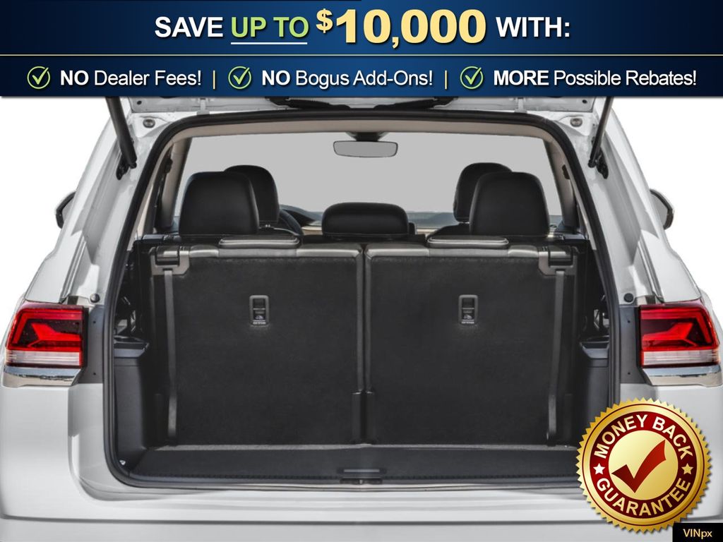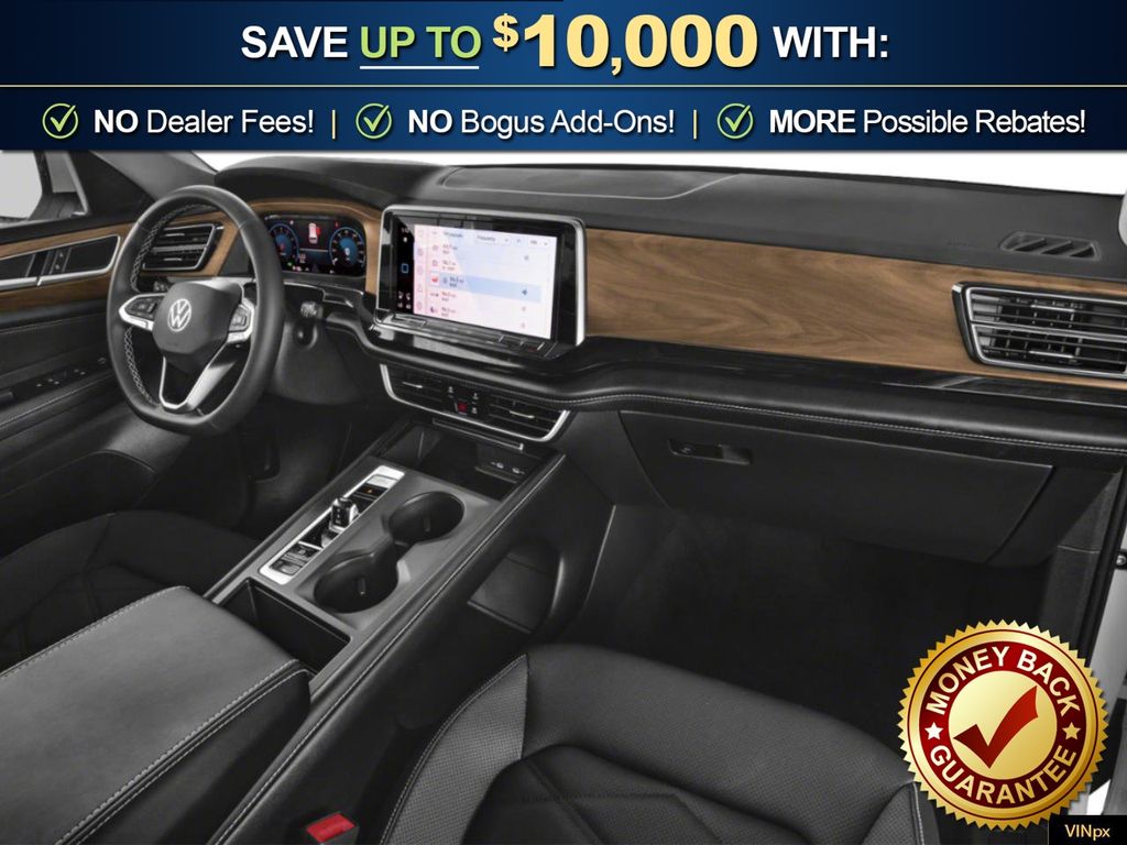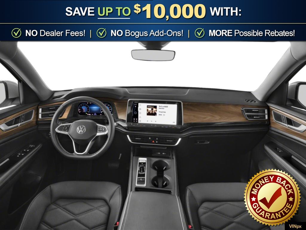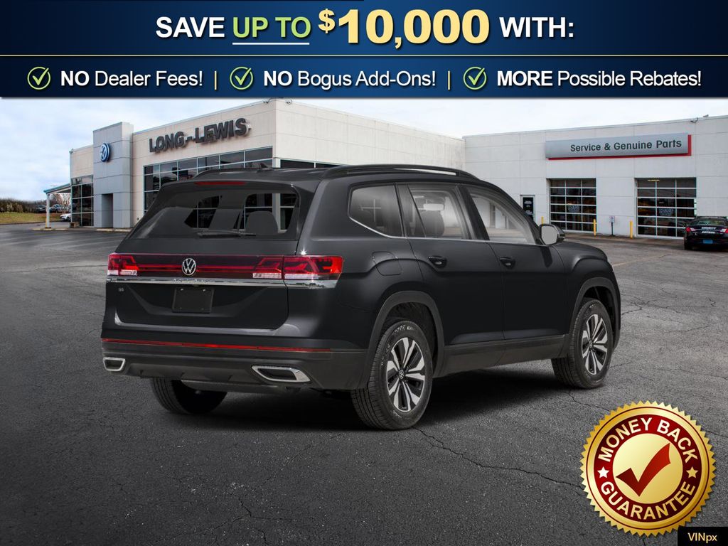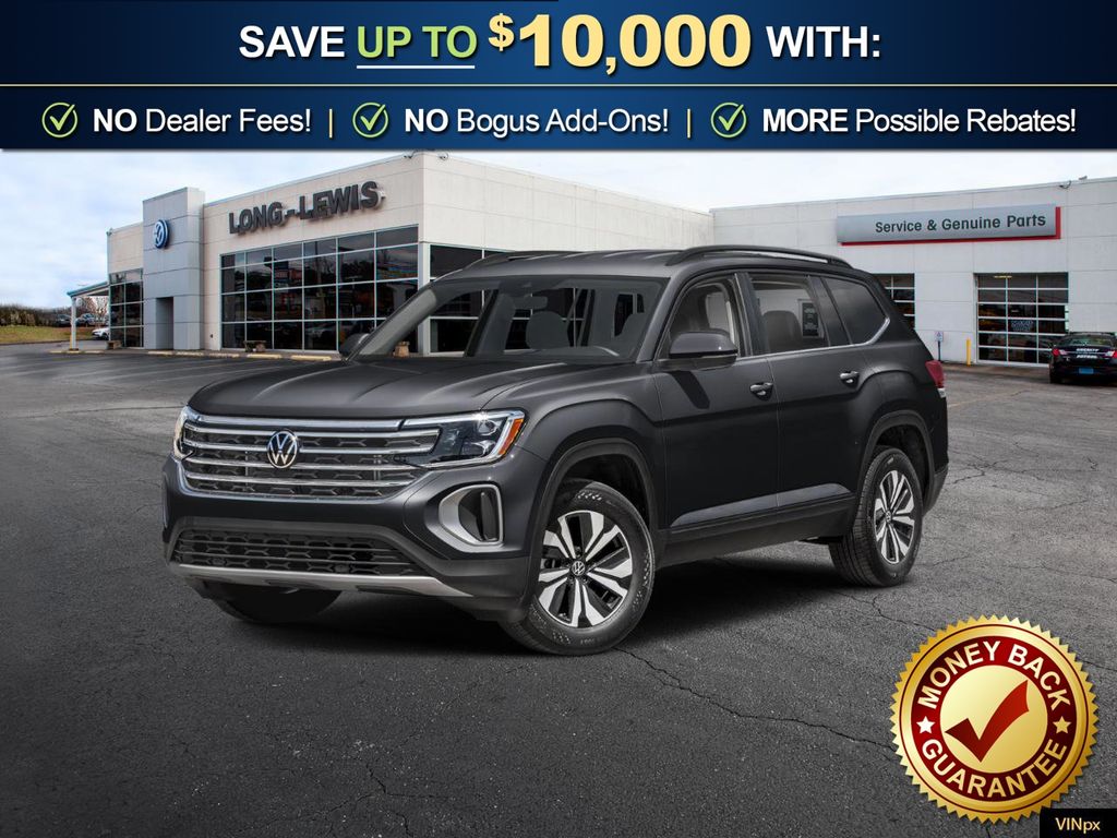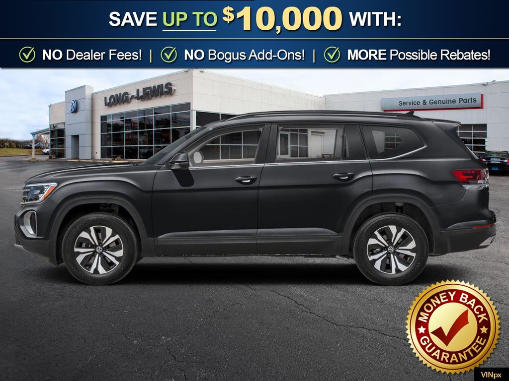 Deep Black Pearl 2026 Volkswagen Atlas 2.0T SE w/Technology NVT FWD 8-Speed Automatic with Tiptronic 2.0L TSI 3rd row seats: split-bench, 4-Wheel Disc Brakes, 4-Wheel Independent Suspension, 6 Speakers, ABS brakes, Air Conditioning, Alloy wheels, AM/FM radio: SiriusXM with 360L, Auto High-beam Headlights, Auto-dimming Rear-View mirror, Automatic temperature control, Brake assist, Bumpers: body-color, Compass, Delay-off headlights, Driver door bin, Driver vanity mirror, Dual front impact airbags, Dual front side impact airbags, Electronic Stability Control, Emergency communication system: VW Car-Net Safe & Secure 5-year, Exterior Parking Camera Rear, Four wheel independent suspension, Front anti-roll bar, Front Bucket Seats, Front Center Armrest, Front dual zone A/C, Front fog lights, Front reading lights, Fully automatic headlights, Garage door transmitter: HomeLink, Heated and Actively Ventilated Front Bucket Seats, Heated door mirrors, Heated front seats, Heated steering wheel, Illuminated entry, Low tire pressure warning, Occupant sensing airbag, Outside temperature display, Overhead airbag, Overhead console, Panic alarm, Passenger door bin, Passenger vanity mirror, Perforated V-Tex Leatherette Seating Surfaces, Power door mirrors, Power driver seat, Power Liftgate, Power steering, Power windows, Radio data system, Radio: MIB3 Composition Media, Rain sensing wipers, Rear air conditioning, Rear anti-roll bar, Rear reading lights, Rear seat center armrest, Rear window defroster, Rear window wiper, Remote keyless entry, Security system, Speed control, Speed-sensing steering, Split folding rear seat, Spoiler, Steering wheel mounted audio controls, Tachometer, Telescoping steering wheel, Tilt steering wheel, Traction control, Trip computer, Turn signal indicator mirrors, Variably intermittent wipers, Ventilated front seats, Wheels: 20" 2-Tone Machined Alloy.