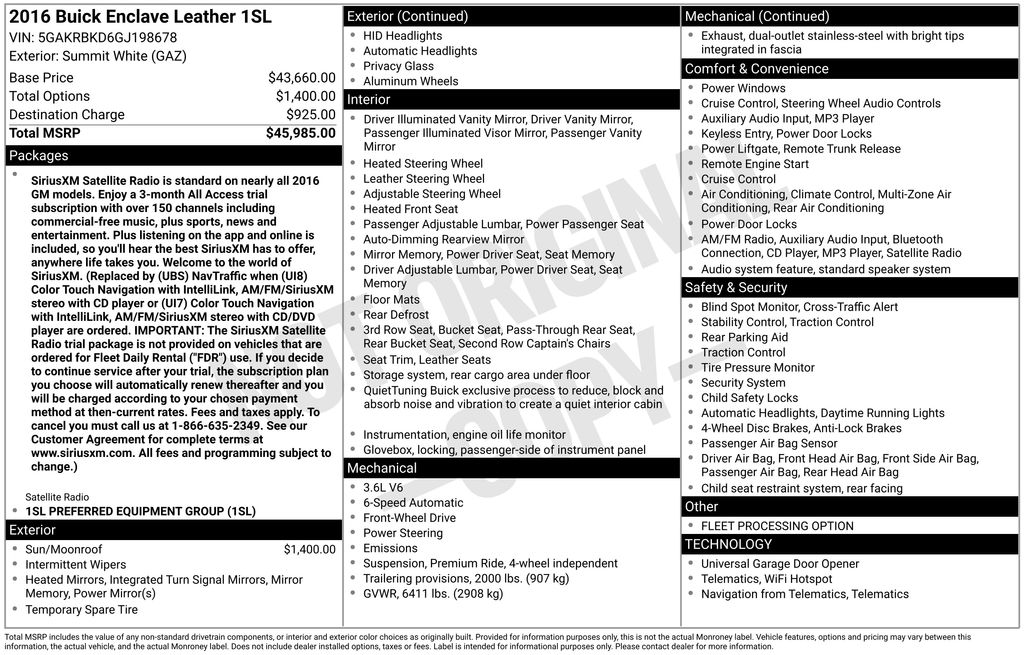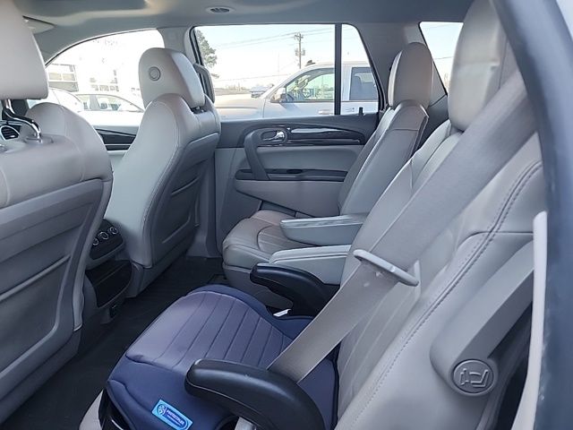 2016 Buick Enclave Leather Group Summit White Leather Group FWD 6-Speed Automatic Electronic with Overdrive 3.6L V6 SIDI VVT FWD, 3.16 Axle Ratio, 3rd row seats: split-bench, 4-Wheel Disc Brakes, 6 Speakers, 7-Passenger Seating, 8-Way Power Driver Seat Adjuster, 8-Way Power Passenger Seat Adjuster, ABS brakes, Air Conditioning, Alloy wheels, AM/FM radio: SiriusXM, Auto-dimming Rear-View mirror, Automatic temperature control, Brake assist, Bumpers: body-color, CD player, Compass, Delay-off headlights, Driver door bin, Driver vanity mirror, Dual front impact airbags, Dual front side impact airbags, Electronic Stability Control, Emergency communication system: OnStar Guidance, Exterior Parking Camera Rear, Four wheel independent suspension, Front anti-roll bar, Front Bucket Seats, Front Center Armrest w/Storage, Front dual zone A/C, Front reading lights, Fully automatic headlights, Garage door transmitter, Heated door mirrors, Heated Driver & Front Passenger Seats, Heated front seats, Heated Steering Wheel, Heated steering wheel, High intensity discharge headlights: Bi-Xenon, Illuminated entry, Leather steering wheel, Low tire pressure warning, Memory seat, Memory Settings, Occupant sensing airbag, Outside temperature display, Overhead airbag, Panic alarm, Passenger door bin, Passenger vanity mirror, Perforated Leather-Appointed Seat Trim, Power door mirrors, Power driver seat, Power Liftgate, Power passenger seat, Power steering, Power Tilt-Sliding Moonroof, Power windows, Preferred Equipment Group 1SL, Radio data system, Radio: Color Touch AM/FM/CD w/IntelliLink, Rear air conditioning, Rear anti-roll bar, Rear Parking Sensors, Rear reading lights, Rear window defroster, Rear window wiper, Remote keyless entry, Roof rack: rails only, Security system, Side Blind Zone Alert w/Cross Traffic Alert, SiriusXM Satellite Radio, Speed control, Speed-sensing steering, Spoiler, Steering wheel mounted audio controls, Tachometer, Telescoping steering wheel, Tilt steering wheel, Traction control, Trip computer, Turn signal indicator mirrors, Variably intermittent wipers, Voltmeter, Wheels: 19" 10-Spoke Aluminum, FWD.