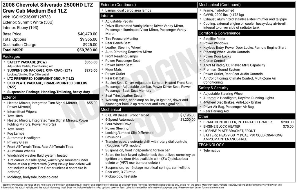 2008 Chevrolet Silverado 2500HD LTZ Summit White LTZ 4WD Allison 1000 6-Speed Automatic Duramax 6.6L V8 Turbodiesel Duramax 6.6L V8 Turbodiesel, Allison 1000 6-Speed Automatic, 4WD, Ebony Leather, 3.73 Rear Axle Ratio, 4-Wheel Disc Brakes, a 730 CCA Heavy-Duty Dual Battery for those cold mornings, ABS brakes, Air Conditioning, AM/FM radio: XM, AM/FM Stereo w/MP3 CD Player/XM Satellite, Bumpers: chrome, CD player, Color-Keyed Carpeted Floor Covering, Delay-off headlights, Driver door bin, Dual front impact airbags, Electric Rear-Window Defogger, Electronic Cruise Control w/Set & Resume Speed, Emergency communication system: OnStar Safe & Sound, Engine Block Heater, Front anti-roll bar, Front License Plate Bracket, Front reading lights, Front wheel independent suspension, Fully automatic headlights, Heavy-Duty Handling/Trailering Suspension Package, Heavy-Duty Rear Automatic Locking Differential, Heavy-Duty Trailering Equipment, Illuminated entry, Integrated Trailer Brake Controller, Low tire pressure warning, Overhead console, Panic alarm, Passenger cancellable airbag, Passenger door bin, Passenger vanity mirror, Power Door Locks, Power steering, Radio data system, Rear reading lights, Rear seat center armrest, Rear step bumper, Remote keyless entry, Security system, Skid Plate Package, Solar-Ray Deep-Tinted Glass, Spare Tire Lock, Split folding rear seat, Tachometer, Tilt steering wheel, Variably intermittent wipers, Voltmeter, XM Satellite Radio, Duramax 6.6L V8 Turbodiesel, Allison 1000 6-Speed Automatic, 4WD, Ebony Leather.