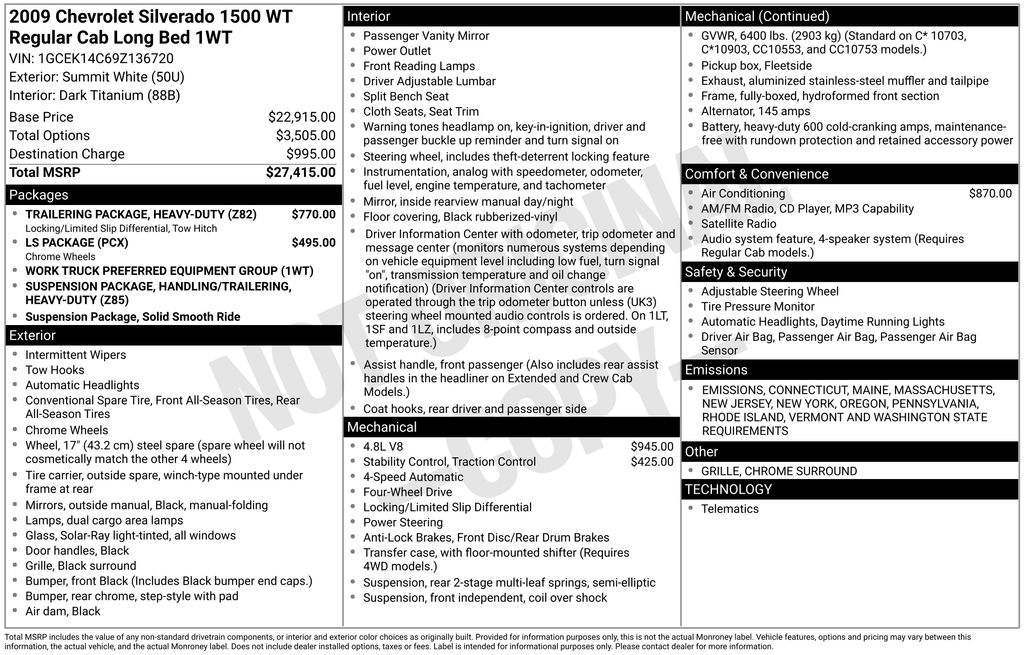 2009 Chevrolet Silverado 1500 Work Truck Summit White (Fleet) Work Truck 4WD 4-Speed Automatic with Overdrive Vortec 4.8L V8 SFI Vortec 4.8L V8 SFI, 4-Speed Automatic with Overdrive, 4WD, Dark Titanium Cloth, 17" x 7.5" 6-Lug Chrome-Styled Steel Wheels, 17" x 7.5" 6-Lug Painted Steel Wheels, 3.42 Rear Axle Ratio, 3.73 Rear Axle Ratio, 4 Speakers, ABS brakes, AM/FM radio: XM, AM/FM Stereo w/MP3 Compatible CD Player, CD player, Chrome Grille Surround, Delay-off headlights, Driver door bin, Driver-Side Manual Lumbar Control Seat Adjuster, Dual front impact airbags, Emergency communication system: OnStar Safe & Sound, Front 40/20/40 Split-Bench Seat, Front anti-roll bar, Front Center Armrest w/Storage, Front Chrome Bumper, Front reading lights, Front wheel independent suspension, Fully automatic headlights, Heavy-Duty Auxiliary External Transmission Oil Cooler, Heavy-Duty Handling/Trailering Suspension Package, Heavy-Duty Rear Automatic Locking Differential, Heavy-Duty Trailering Package, Low tire pressure warning, LS Package, Occupant sensing airbag, Overhead console, Passenger door bin, Passenger vanity mirror, Power steering, Radio data system, Rear step bumper, Single-Zone Manual Front Climate Control, Solid Smooth Ride Suspension Package, StabiliTrak Stability Control System, Tachometer, Tilt steering wheel, Variably intermittent wipers, Vinyl Seat Trim, Work Truck Equipment Group, XM Radio, Vortec 4.8L V8 SFI, 4-Speed Automatic with Overdrive, 4WD, Dark Titanium Cloth.