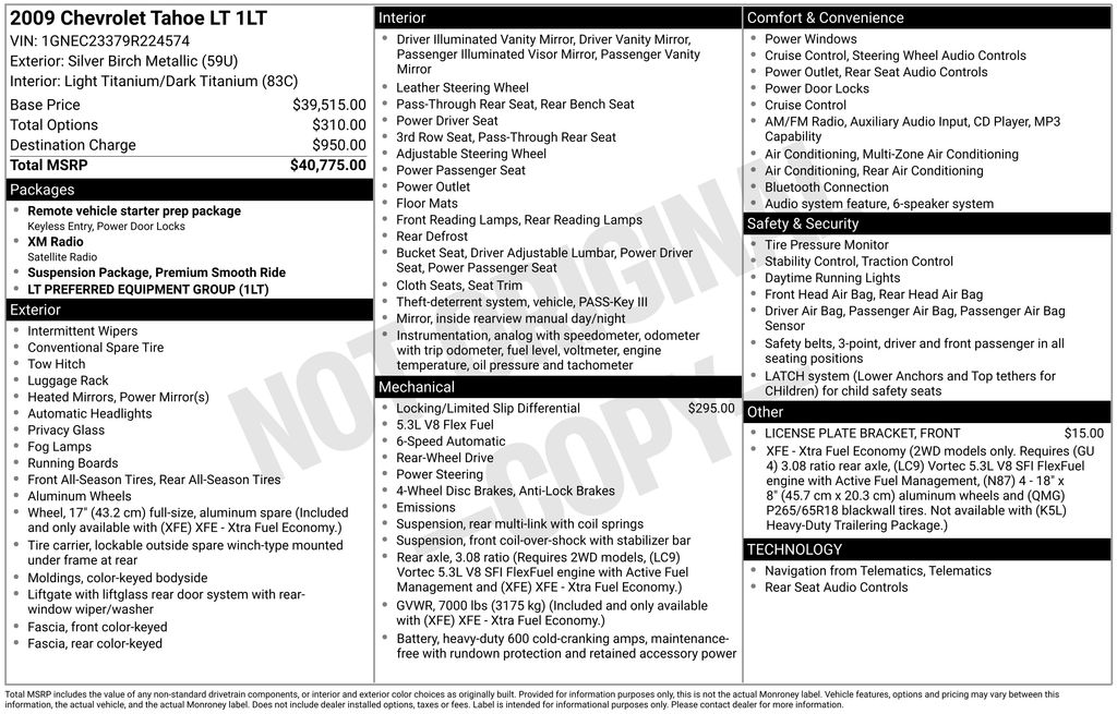 2009 Chevrolet Tahoe LT Silver Birch Metallic LT RWD 6-Speed Automatic Electronic with Overdrive Vortec 5.3L V8 SFI Flex Fuel Light Titanium/Dark Titanium Cloth, 3rd row seats: split-bench, 4-Wheel Disc Brakes, 6 Speakers, 6-Way Power Driver Seat Adjuster, ABS brakes, Air Conditioning, Alloy wheels, AM/FM radio: XM, Automatic Tri-Zone Air Conditioning, Bodyside moldings, Bumpers: body-color, CD player, Color-Keyed Door Handles, Compass, Delay-off headlights, Driver door bin, Driver Manual Lumbar Control, Driver vanity mirror, Dual front impact airbags, Electronic Stability Control, Emergency communication system: OnStar Directions & Connections, Floor Console, Front anti-roll bar, Front Bucket Seats, Front Center Armrest, Front dual zone A/C, Front fog lights, Front Halogen Fog Lamps, Front License Plate Bracket, Front reading lights, Front Reclining Bucket Seats, Front wheel independent suspension, Fully automatic headlights, Heated door mirrors, Heavy-Duty Rear Locking Differential, Illuminated entry, Low tire pressure warning, Occupant sensing airbag, OnStar 1-Year Directions & Connections Plan, Outside temperature display, Overhead airbag, Overhead console, Panic alarm, Passenger door bin, Passenger vanity mirror, Power door mirrors, Power driver seat, Power Front Passenger Seat Adjuster, Power Heated Manual-Folding Outside Mirrors, Power passenger seat, Power steering, Power windows, Premium Smooth Ride Suspension Package, Radio data system, Rear air conditioning, Rear anti-roll bar, Rear audio controls, Rear Audio System Controls, Rear reading lights, Rear seat center armrest, Rear window defroster, Rear window wiper, Remote keyless entry, Remote Vehicle Starter System, Roof rack, Roof-Mounted Black Luggage Rack Center Rails, Security system, Speed control, Split folding rear seat, Spoiler, Steering wheel mounted audio controls, Tachometer, Tilt steering wheel, Traction control, Trip computer, Ultrasonic Rear Parking Assist, Universal Home Remote, Variably intermittent wipers, Voltmeter, XM Radio, Light Titanium/Dark Titanium Cloth.