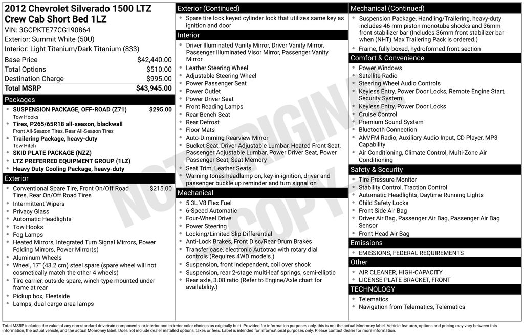2012 Chevrolet Silverado 1500 LTZ Summit White LTZ 4WD 6-Speed Automatic Electronic with Overdrive Vortec 5.3L V8 SFI VVT Flex Fuel 6-Speed Automatic Electronic with Overdrive, 4WD, Light Titanium/Dark Titanium Leather, 10-Way Power Driver's Seat Adjuster, 10-Way Power Front Passenger Seat Adjuster, 18" x 8" Aluminum Wheels, 18" x 8" Chrome-Clad Aluminum Wheels, 7 Speakers, ABS brakes, Air Conditioning, Alloy wheels, AM/FM radio: SiriusXM, AM/FM Stereo w/CD Player & MP3 Playback, Auto-dimming door mirrors, Auto-dimming Rear-View mirror, Automatic temperature control, Bluetooth® For Phone, Body-Colored Bodyside Moldings, Body-Colored Grille w/Unique Chrome Insert, Body-Colored Power Heated Outside Rear-View Mirrors, Bodyside moldings, Bose Premium Audio Speaker System, Bumpers: body-color, CD player, Color-Keyed Carpeting w/Rubberized Vinyl Floormats, Color-Keyed Door Handles, Compass, Delay-off headlights, Driver & Front Passenger Illuminated Visor Mirrors, Driver door bin, Driver vanity mirror, Dual front impact airbags, Dual front side impact airbags, Dual-Zone Automatic Climate Control, Electric Rear-Window Defogger, Electronic Autotrac Transfer Case, Electronic Stability Control, Emergency communication system: OnStar Directions & Connections, Floor Console w/Dual Cup Holders, Front anti-roll bar, Front Bucket Seats, Front Center Armrest, Front dual zone A/C, Front fog lights, Front Full-Feature Bucket Seats, Front Halogen Fog Lamps, Front License Plate Bracket, Front reading lights, Front wheel independent suspension, Fully automatic headlights, Heated door mirrors, Heated front seats, Heavy Duty Cooling Package, Heavy-Duty Air-to-Oil External Engine Oil Cooler, Heavy-Duty Auxiliary External Transmission Oil Cooler, Heavy-Duty Handling/Trailering Suspension Package, Heavy-Duty Rear Automatic Locking Differential, Heavy-Duty Trailering Package, Illuminated entry, Inside Auto-Dimming Rear-View Mirror, Leather-Appointed Front Seat Trim, Leather-Wrapped Steering Wheel, Low tire pressure warning, LTZ Equipment Group, Memory seat, Occupant sensing airbag, Off-Road Suspension Package, Outside temperature display, Overhead airbag, Overhead console, Panic alarm, Passenger door bin, Passenger vanity mirror, Power Door Locks w/Remote Keyless Entry, Power door mirrors, Power driver seat, Power passenger seat, Power steering, Power windows, Power Windows w/Driver & Front Passenger Express-Down, Radio data system, Rear reading lights, Rear seat center armrest, Rear step bumper, Rear window defroster, Remote keyless entry, Remote Keyless Entry w/2 Transmitters, Remote Vehicle Starter System, Security system, SIRIUSXM Satellite Radio, Skid Plate Package, Solar-Ray Deep-Tinted Glass, Speed control, Split folding rear seat, Steering Wheel Mounted Audio Controls, Steering wheel mounted audio controls, Tachometer, Tilt steering wheel, Traction control, Trip computer, Turn signal indicator mirrors, Variably intermittent wipers, Voltmeter, 6-Speed Automatic Electronic with Overdrive, 4WD, Light Titanium/Dark Titanium Leather.