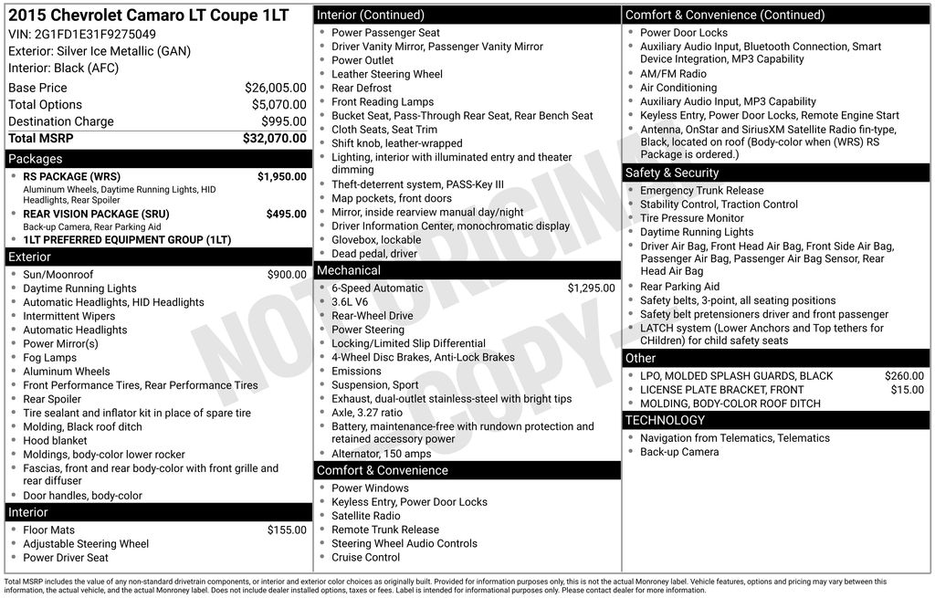 2015 Chevrolet Camaro 1LT Silver Ice Metallic 1LT RWD 6-Speed Automatic with TapShift 3.6L V6 DGI DOHC VVT 18" Painted Aluminum Wheels, 2 Front Cup Holders, 20" x 8" Front & 20" x 9" Rear Aluminum Wheels, 3-Spoke Leather-Wrapped Steering Wheel, 4-Wheel Antilock 4-Wheel Disc Brakes, 4-Wheel Disc Brakes, 6 Speakers, 6-Speaker Audio System Feature, 6-Way Power Driver Adjuster w/Power Recline, 6-Way Power Fr Passenger Adjuster w/Power Recline, ABS brakes, Air Conditioning, All-Weather Floor Mats, Alloy wheels, AM/FM radio: SiriusXM, Analog Instrumentation, Black Molded Splash Guards (LPO), Body-Color Roof Ditch Molding, Brake assist, Bumpers: body-color, Carpeted Front Floor Mats, Compass, Delay-off headlights, Driver door bin, Driver vanity mirror, Dual front impact airbags, Dual front side impact airbags, Electric Rear-Window Defogger, Electronic Cruise Control, Electronic Stability Control, Emergency communication system: OnStar Directions & Connections, Four wheel independent suspension, Front anti-roll bar, Front Bucket Seats, Front Center Armrest, Front fog lights, Front License Plate Bracket, Front reading lights, Front Sport Bucket Seats, Fully automatic headlights, High-Intensity Discharge Headlamps, Illuminated entry, LATCH System, Leather Shift Knob, Leather-Wrapped Shift Knob, Low tire pressure warning, Maintenance-Free Battery, Manual Rake & Telescopic Steering Column, Occupant sensing airbag, OnStar 6 Months Directions & Connections Plan, Outside temperature display, Overhead airbag, Panic alarm, Passenger door bin, Passenger vanity mirror, Power door mirrors, Power driver seat, Power passenger seat, Power Programmable Door Locks, Power steering, Power Sunroof w/Express-Open & Venting, Power windows, Preferred Equipment Group 1LT, Premium audio system: Chevrolet MyLink, Radio data system, Radio: AM/FM Stereo w/Color Touch, Rear anti-roll bar, Rear Spoiler, Rear Vision Camera, Rear Vision Package, Rear window defroster, Remote Keyless Entry, Remote keyless entry, Remote Vehicle Starter System, RS Package, Security system, Separate Daytime Running Lamps, SiriusXM Satellite Radio, Speed control, Speed-sensing steering, Sport Cloth Seat Trim, StabiliTrak, Stainless-Steel Dual-Outlet Exhaust, Steering Wheel Mounted Audio Controls, Steering wheel mounted audio controls, Tachometer, Telescoping steering wheel, Tilt steering wheel, Tire Sealant & Inflator Kit, Traction control, Trip computer, Ultrasonic Rear Park Assist, USB Port Audio System Feature, Variably intermittent wipers.