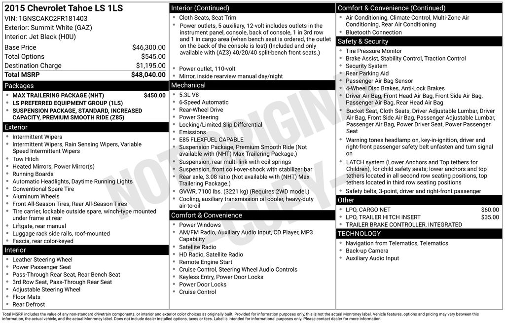 2015 Chevrolet Tahoe LS Summit White LS RWD 6-Speed Automatic Electronic with Overdrive EcoTec3 5.3L V8 Jet Black Cloth, 18" x 8.5" Aluminum Wheels, 2nd Row 60/40 Split-Folding Manual Bench, 3rd Row Manual 60/40 Split-Folding Fold Flat Bench, 3rd row seats: split-bench, 4-Wheel Disc Brakes, 6 Speakers, 6-Speaker Audio System Feature, ABS brakes, Air Conditioning, Alloy wheels, AM/FM radio: SiriusXM, AM/FM Stereo w/CD Player, Automatic temperature control, Bluetooth® For Phone, Brake assist, Bumpers: body-color, Cargo Net (LPO) (DISC), CD player, Compass, Delay-off headlights, Driver door bin, Driver Inboard & Front Passenger Airbags, Driver vanity mirror, Dual front impact airbags, Dual front side impact airbags, Electronic Stability Control, Emergency communication system: OnStar Directions & Connections, Extended-Range Remote Keyless Entry, Exterior Parking Camera Rear, Floor Console, Front anti-roll bar, Front Bucket Seats, Front Center Armrest, Front dual zone A/C, Front High-Back Reclining Bucket Seats, Front reading lights, Front wheel independent suspension, Fully automatic headlights, Heated door mirrors, Illuminated entry, Integrated Trailer Brake Controller, Low tire pressure warning, Max Trailering Package, Occupant sensing airbag, Outside temperature display, Overhead airbag, Overhead console, Panic alarm, Passenger door bin, Passenger vanity mirror, Power door mirrors, Power driver seat, Power passenger seat, Power steering, Power windows, Preferred Equipment Group 1LS, Premium Cloth Seat Trim, Premium Smooth Ride Suspension Package, Rain sensing wipers, Rear air conditioning, Rear anti-roll bar, Rear Park Assist w/Audible Warning, Rear reading lights, Rear seat center armrest, Rear window defroster, Rear window wiper, Remote keyless entry, Roof rack: rails only, Security system, Single-Slot CD/MP3 Player, SiriusXM Satellite Radio, Speed control, Speed-sensing steering, Split folding rear seat, Spoiler, Standard Suspension Package, Steering wheel mounted audio controls, Tachometer, Tilt steering wheel, Traction control, Trailer Hitch Insert (LPO), Trip computer, Variably intermittent wipers, Voltmeter, Jet Black Cloth.