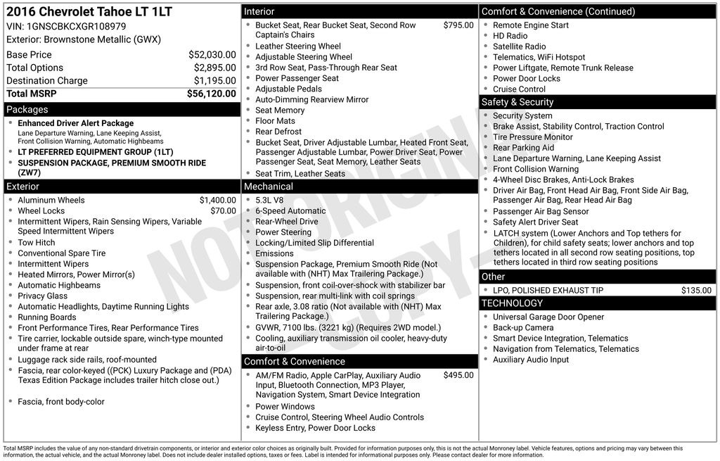 2016 Chevrolet Tahoe LT Brownstone Metallic LT RWD 6-Speed Automatic Electronic with Overdrive EcoTec3 5.3L V8 Cocoa/Dune Leather, 18" x 8.5" Aluminum Wheels, 1st & 2nd Row Color-Keyed Carpeted Floor Mats, 2nd Row 60/40 Split-Folding Manual Bench, 2nd Row Manual Bucket Seats, 3.08 Rear Axle Ratio, 3rd Row Manual 60/40 Split-Folding Fold Flat Bench, 3rd row seats: split-bench, 4-Wheel Antilock Disc Brakes, 4-Wheel Disc Brakes, 5 12-Volt Auxiliary Power Outlets, 6-Way Power Front Passenger Seat Adjuster, 9 Speakers, ABS brakes, Adjustable pedals, Air Conditioning, Alloy wheels, AM/FM radio: SiriusXM, Apple CarPlay, Auto High-beam Headlights, Auto-Dimming Inside Rear-View Mirror, Auto-dimming Rear-View mirror, Automatic temperature control, Black Assist Steps, Bose Premium 9-Speaker System, Brake assist, Bumpers: body-color, CD player, Color-Keyed Carpeting Floor Covering, Compass, Delay-off headlights, Driver door bin, Driver Inboard & Front Passenger Airbags, Driver vanity mirror, Dual front impact airbags, Dual front side impact airbags, Electronic Cruise Control w/Set & Resume Speed, Electronic Stability Control, Emergency communication system: OnStar, Enhanced Driver Instrument Information Display, Extended-Range Remote Keyless Entry, Exterior Parking Camera Rear, Floor Console, Forward Collision Alert Sensor Indicator, Front anti-roll bar, Front Bucket Seats, Front Center Armrest, Front dual zone A/C, Front Heated Reclining Bucket Seats, Front reading lights, Front wheel independent suspension, Fully automatic headlights, Garage door transmitter, Heated door mirrors, Heated front seats, Illuminated entry, IntelliBeam Headlamps, Lane Departure Warning System, Lane Keep Assist, Leather-Appointed Seat Trim, Leather-Wrapped Steering Wheel, Low tire pressure warning, Memory seat, Memory Settings, Occupant sensing airbag, OnStar Basic Plan For 5 Years, Outside temperature display, Overhead airbag, Overhead console, Panic alarm, Passenger door bin, Passenger vanity mirror, Pedal memory, Polished Exhaust Tip, Power door mirrors, Power driver seat, Power Liftgate, Power passenger seat, Power steering, Power windows, Power-Adjustable Accelerator & Brake Pedals, Preferred Equipment Group 1LT, Premium audio system: Chevrolet MyLink, Premium Smooth Ride Suspension Package, Radio: Chevrolet MyLink AM/FM Stereo, Radio: Chevrolet MyLink w/Navigation/AM/FM Stereo, Rain sensing wipers, Rear air conditioning, Rear anti-roll bar, Rear Park Assist w/Audible Warning, Rear reading lights, Rear seat center armrest, Rear window defroster, Rear window wiper, Remote keyless entry, Roof rack: rails only, Roof-Mounted Luggage Rack Side Rails, Safety Alert Driver Seat, Security system, Set of 4 Wheel Locks (LPO), Single-Slot CD/MP3 Player, SiriusXM Satellite Radio, Speed control, Speed-sensing steering, Split folding rear seat, Spoiler, Steering wheel mounted audio controls, Tachometer, Telescoping steering wheel, Tilt steering wheel, Traction control, Trip computer, Unauthorized Entry Electrical Theft Deterrent Sys., Universal Home Remote, Variably intermittent wipers, Voltmeter, Wheels: 20" x 9" Polished-Aluminum, Cocoa/Dune Leather.