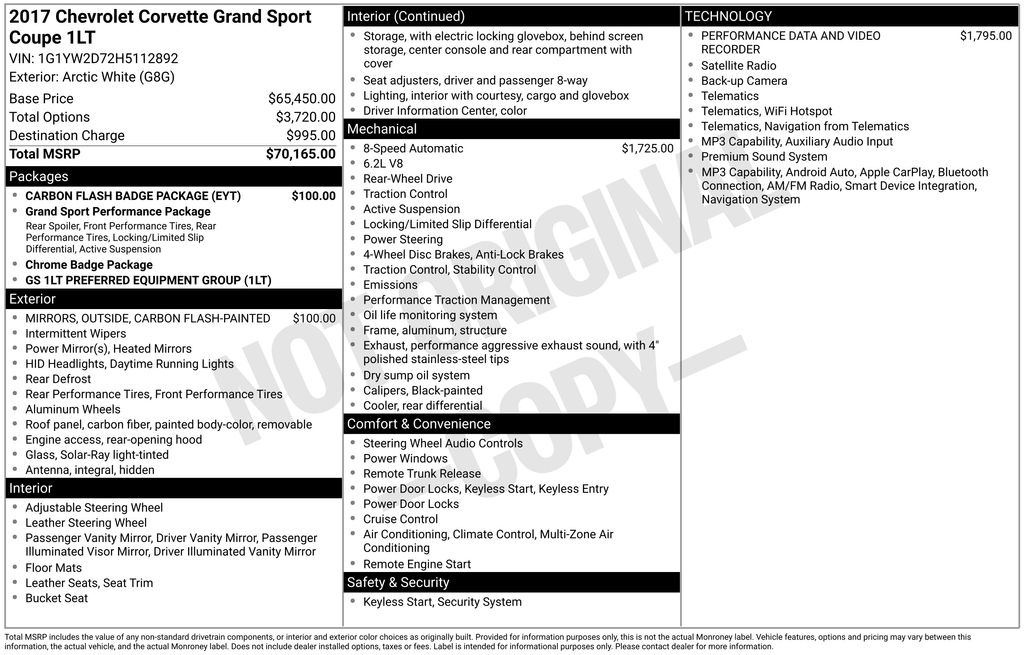 2017 Chevrolet Corvette Grand Sport 1LT Arctic White Grand Sport 1LT RWD 8 Speed Paddle Shift with Automatic Modes 6.2L V8 2.73 Limited Slip Performance Rear Axle Ratio, 4-Wheel Disc Brakes, 8-Way Driver & Passenger Seat Adjusters, 9 Speakers, ABS brakes, Adaptive suspension, Air Conditioning, Alloy wheels, AM/FM radio: SiriusXM, Apple CarPlay/Android Auto, Automatic temperature control, Bose Premium 9-Speaker Audio System Feature, Bumpers: body-color, Carbon Flash Badge Package, Carbon Flash-Painted Outside Mirrors, Compass, Delay-off headlights, Driver door bin, Driver vanity mirror, Dual front impact airbags, Dual front side impact airbags, Electronic Stability Control, Emergency communication system, Exterior Parking Camera Rear, Four wheel independent suspension, Front anti-roll bar, Front Bucket Seats, Front Center Armrest, Front dual zone A/C, Front reading lights, Fully automatic headlights, GT Bucket Seats, Heads-Up Display, Heated door mirrors, High-Intensity Discharge Headlights, Illuminated entry, Leather Shift Knob, Leather steering wheel, Low tire pressure warning, Occupant sensing airbag, Outside temperature display, Painted Body-Color Carbon Fiber Removable Roof Panel, Panic alarm, Passenger door bin, Passenger vanity mirror, Performance Data & Video Recorder, Power door mirrors, Power driver seat, Power passenger seat, Power steering, Power windows, Preferred Equipment Group 1LT, Premium audio system: Chevrolet MyLink, Radio data system, Radio: Chevrolet MyLink w/Navigation, Rear anti-roll bar, Rear window defroster, Remote keyless entry, Remote Vehicle Starter System, Speed control, Speed-sensing steering, Spoiler, Sport steering wheel, Steering wheel mounted audio controls, Tachometer, Telescoping steering wheel, Tilt steering wheel, Traction control, Trip computer, Variably intermittent wipers, Voltmeter, Wheels: 19" x 10" Fr & 20" x 12" Rr Grand Sport Pearl.