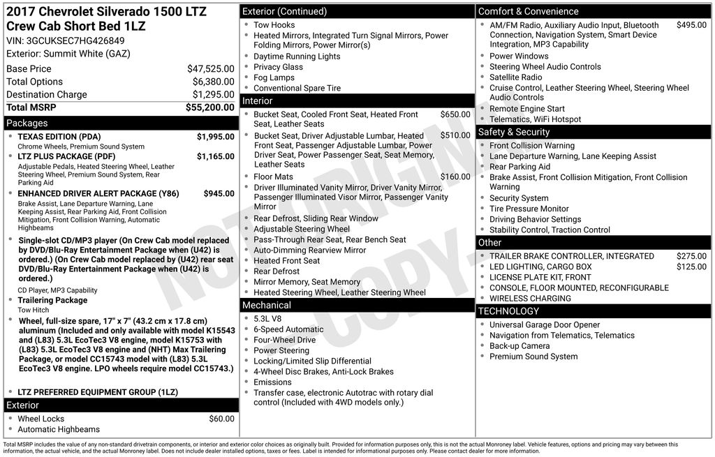 2017 Chevrolet Silverado 1500 LTZ 1LZ Summit White LTZ 1LZ 4WD 6-Speed Automatic Electronic with Overdrive EcoTec3 5.3L V8 6-Speed Automatic Electronic with Overdrive, 4WD, Jet Black Leather, 110-Volt AC Power Outlet, 150 Amp Alternator, 3.42 Rear Axle Ratio, 4-Wheel Disc Brakes, 4.2" Diagonal Color Display Driver Info Center, 40/20/40 Front Split Bench Seat, 6 Speaker Audio System, 6 Speakers, ABS brakes, Air Conditioning, Alloy wheels, AM/FM radio: SiriusXM, Auto-dimming door mirrors, Auto-Dimming Inside Rear-View Mirror, Auto-dimming Rear-View mirror, Automatic temperature control, Auxiliary External Transmission Oil Cooler, Bluetooth® For Phone, Bodyside moldings, Bose Speaker System, Brake assist, CD player, Chrome Bodyside Moldings, Chrome Cap Power-Adjustable Heated Outside Mirrors, Chrome Door Handles, Chrome Mirror Caps, Color-Keyed Carpeting w/Rubberized Vinyl Floor Mats, Compass, Deep-Tinted Glass, Delay-off headlights, Driver & Front Passenger Illuminated Vanity Mirrors, Driver door bin, Driver vanity mirror, Dual front impact airbags, Dual front side impact airbags, Dual-Zone Automatic Climate Control, Electric Rear-Window Defogger, Electronic Stability Control, Emergency communication system: OnStar Guidance, Enhanced Driver Alert Package, Exterior Parking Camera Rear, EZ Lift & Lower Tailgate, Floor Mounted Console, Forward Collision Alert, Front & Rear All-Weather Floor Mats, Front anti-roll bar, Front Center Armrest w/Storage, Front Chrome Bumper, Front dual zone A/C, Front fog lights, Front Frame-Mounted Black Recovery Hooks, Front Full Feature Power Reclining Bucket Seats, Front License Plate Kit, Front reading lights, Front wheel independent suspension, Fully automatic headlights, Garage door transmitter, HD Radio, Heated & Vented Front Seating, Heated door mirrors, Heated Driver & Front Passenger Seats, Heated front seats, Heavy-Duty Rear Locking Differential, Illuminated entry, Integrated Trailer Brake Controller, IntelliBeam Automatic High Beam On/Off Headlight, Lane Keep Assist, Leather Appointed Seat Trim, Leather Wrapped Heated Steering Wheel, Leather Wrapped Steering Wheel w/Cruise Controls, LED Cargo Box Lighting, LED Taillamps w/Signature, Low Speed Forward Automatic Braking, Low tire pressure warning, LTZ Plus Package, Manual Tilt/Telescoping Steering Column, Memory seat, Occupant sensing airbag, OnStar 3 Months Guidance Plan, OnStar w/4G LTE, Outside temperature display, Overhead airbag, Overhead console, Panic alarm, Passenger door bin, Passenger vanity mirror, Power Adjustable Pedals, Power door mirrors, Power driver seat, Power passenger seat, Power Sliding Rear Window, Power steering, Power windows, Power Windows w/Driver Express Up, Premium audio system: Chevrolet MyLink, Radio data system, Radio: AM/FM 8" Diagonal Clr Touch Nav, Radio: AM/FM 8" Diagonal Color Touch Screen, Rear 60/40 Folding Bench Seat (Folds Up), Rear Chrome Bumper, Rear reading lights, Rear seat center armrest, Rear step bumper, Rear Vision Camera, Rear Wheelhouse Liners, Rear window defroster, Remote Keyless Entry, Remote keyless entry, Remote Locking Tailgate, Remote Vehicle Starter System, Security system, Single Slot CD/MP3 Player, SiriusXM Satellite Radio, Speed control, Speed-sensing steering, Split folding rear seat, Spray-On Pickup Box Bed Liner, Steering Wheel Audio Controls, Steering wheel mounted audio controls, Tachometer, Telescoping steering wheel, Theft Deterrent System (Unauthorized Entry), Thin Profile LED Fog Lamps, Tilt steering wheel, Traction control, Trailering Package, Trip computer, Turn signal indicator mirrors, Ultrasonic Front & Rear Park Assist, Universal Home Remote, Variably intermittent wipers, Voltmeter, Wheel Locks (Set of 4) (LPO), Wheels: 20" x 9" Chrome, Wireless Charging, 6-Speed Automatic Electronic with Overdrive, 4WD, Jet Black Leather.