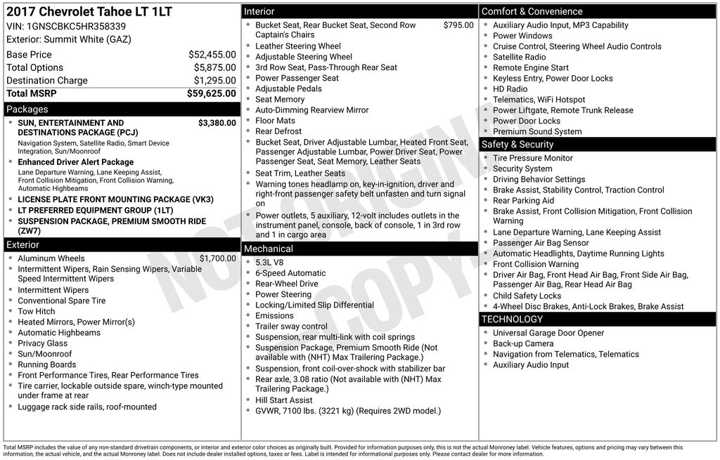 2017 Chevrolet Tahoe LT Summit White LT RWD 6-Speed Automatic Electronic with Overdrive EcoTec3 5.3L V8 Cocoa/Dune Leather, 18" x 8.5" Aluminum Wheels, 1st & 2nd Row Color-Keyed Carpeted Floor Mats, 2nd Row 60/40 Split-Folding Manual Bench, 2nd Row Manual Bucket Seats, 3.08 Rear Axle Ratio, 3rd Row Manual 60/40 Split-Folding Fold Flat Bench, 3rd row seats: split-bench, 4-Wheel Antilock Disc Brakes w/Brake Assist, 4-Wheel Disc Brakes, 5 12-Volt Auxiliary Power Outlets, 6-Way Power Front Passenger Seat Adjuster, 9 Speakers, ABS brakes, Adjustable pedals, Air Conditioning, Alloy wheels, AM/FM radio: SiriusXM, Apple CarPlay/Android Auto, Auto High-beam Headlights, Auto-Dimming Inside Rear-View Mirror, Auto-dimming Rear-View mirror, Automatic temperature control, Black Assist Steps, Bose Premium 9-Speaker System, Brake assist, Bumpers: body-color, Cargo Net, CD player, Color-Keyed Carpeting Floor Covering, Compass, Delay-off headlights, Driver door bin, Driver Inboard & Front Passenger Airbags, Driver vanity mirror, Dual front impact airbags, Dual front side impact airbags, Electronic Cruise Control w/Set & Resume Speed, Electronic Stability Control, Emergency communication system: OnStar Guidance, Enhanced Driver Alert Package (Y86), Enhanced Driver Information Center, Extended-Range Remote Keyless Entry, Exterior Parking Camera Rear, Floor Console, Forward Collision Alert Sensor Indicator, Front anti-roll bar, Front Bucket Seats, Front Center Armrest, Front dual zone A/C, Front Heated Reclining Bucket Seats, Front reading lights, Front wheel independent suspension, Fully automatic headlights, Garage door transmitter, Heated door mirrors, Heated front seats, Illuminated entry, IntelliBeam Headlamps, Lane Keep Assist, Leather-Appointed Seat Trim, Leather-Wrapped Steering Wheel, License Plate Front Mounting Package, Low Speed Forward Automatic Braking, Low tire pressure warning, Memory seat, Memory Settings, NavTraffic, Occupant sensing airbag, OnStar Basic Plan For 5 Years, Outside temperature display, Overhead airbag, Overhead console, Panic alarm, Passenger door bin, Passenger vanity mirror, Pedal memory, Power door mirrors, Power driver seat, Power Liftgate, Power passenger seat, Power steering, Power Sunroof, Power windows, Power-Adjustable Accelerator & Brake Pedals, Preferred Equipment Group 1LT, Premium audio system: Chevrolet MyLink, Premium Smooth Ride Suspension Package, Radio: Chevrolet MyLink AM/FM Stereo, Radio: Chevrolet MyLink w/Nav/AM/FM Stereo, Rain sensing wipers, Rear air conditioning, Rear anti-roll bar, Rear Park Assist w/Audible Warning, Rear reading lights, Rear Seat Blu-Ray/DVD Entertainment System, Rear seat center armrest, Rear window defroster, Rear window wiper, Remote keyless entry, Remote Vehicle Start, Roof rack: rails only, Roof-Mounted Luggage Rack Side Rails, Security system, Single-Slot CD/MP3 Player, SiriusXM Satellite Radio, Speed control, Speed-sensing steering, Split folding rear seat, Spoiler, Steering wheel mounted audio controls, Sun, Entertainment & Destinations Package, Tachometer, Telescoping steering wheel, Tilt steering wheel, Traction control, Trip computer, Universal Home Remote, Variably intermittent wipers, Voltmeter, Wheels: 20" x 9" Polished-Aluminum, Cocoa/Dune Leather.