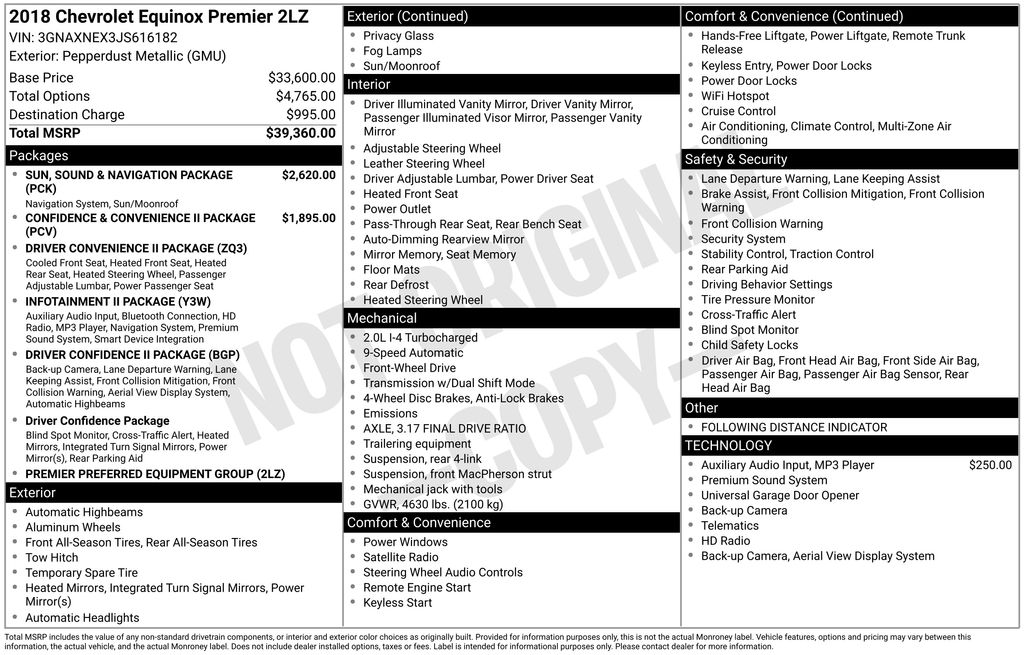2018 Chevrolet Equinox Premier Pepperdust Metallic Premier FWD 9-Speed Automatic with Overdrive 2.0L Turbocharged 2 Rear USB Charging-Only Ports, 2 USB Data Ports, 2 USB Ports & Auxiliary Input Jack, 3.17 Final Drive Axle Ratio, 4-Wheel Antilock 4-Wheel Disc Brakes, 4-Wheel Disc Brakes, 6 Speaker Audio System Feature, 6 Speakers, 8-Way Power Driver Seat Adjuster, 8-Way Power Front Passenger Seat Adjuster, ABS brakes, Air Conditioning, Alloy wheels, AM/FM radio: SiriusXM, Apple CarPlay/Android Auto, Auto-dimming door mirrors, Auto-dimming Rear-View mirror, Automatic temperature control, Bird's Eye View Surround Vision, Bluetooth® For Phone, Body-Color Trailer Hitch Close-Out Cover, Bose Premium 7-Speaker Audio System Feature, Brake assist, Bumpers: body-color, Compass, Confidence & Convenience II Package, Delay-off headlights, Driver Confidence II Package, Driver Convenience II Package, Driver door bin, Driver vanity mirror, Dual front impact airbags, Dual front side impact airbags, Dual Stainless-Steel Exhaust w/Bright Tips, Electronic Stability Control, Emergency communication system: OnStar and Chevrolet connected services capable, Exterior Parking Camera Rear, Factory Installed Trailer Hitch, Following Distance Indicator, Forward Collision Alert, Four wheel independent suspension, Front anti-roll bar, Front Bucket Seats, Front Center Armrest, Front dual zone A/C, Front fog lights, Front Passenger 4-Way Manual Seat Adjuster, Front reading lights, Fully automatic headlights, Garage door transmitter, HD Radio, Heated door mirrors, Heated Driver & Front Passenger Seats, Heated front seats, Heated Rear Seats, Heated Steering Wheel, Illuminated entry, Infotainment II Package, IntelliBeam Auto High Beam Headlamp Control, Lane Keep Assist w/Lane Departure Warning, Leather Shift Knob, Low Speed Forward Automatic Braking, Low tire pressure warning, Memory seat, Occupant sensing airbag, Outside temperature display, Overhead airbag, Overhead console, Panic alarm, Passenger door bin, Passenger vanity mirror, Perforated Leather-Appointed Seat Trim, Power door mirrors, Power driver seat, Power Liftgate, Power steering, Power Sunroof, Power windows, Preferred Equipment Group 2LZ, Premium audio system: Chevrolet MyLink, Radio data system, Radio: 8" Chevrolet MyLink AM/FM Stereo, Radio: 8" Chevrolet MyLink AM/FM Stereo w/Nav, Rear anti-roll bar, Rear reading lights, Rear seat center armrest, Rear window defroster, Rear window wiper, Remote keyless entry, Roof rack: rails only, Security system, SiriusXM Satellite Radio, Speed control, Speed-sensing steering, Split folding rear seat, Spoiler, Steering wheel mounted audio controls, Sun, Sound & Navigation Package, Tachometer, Telescoping steering wheel, Tilt steering wheel, Traction control, Trailering Equipment, Trip computer, Turn signal indicator mirrors, Universal Tablet Holder (LPO), Variably intermittent wipers, Ventilated Driver Seat, Ventilated Front Passenger Seat, Wheels: 19" Ultra Bright Machined.