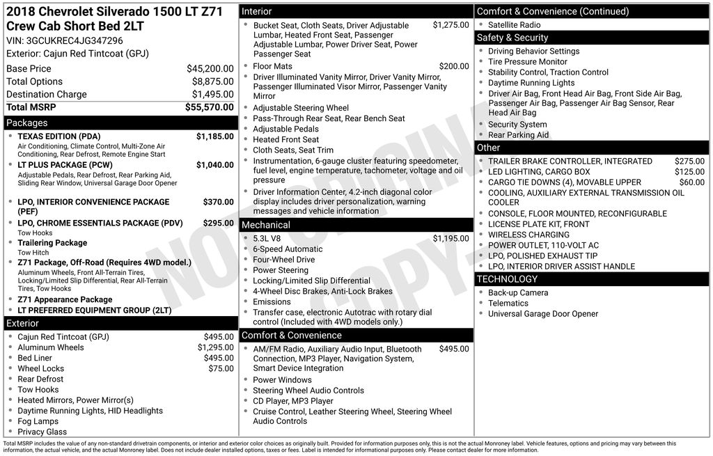 2018 Chevrolet Silverado 1500 LT LT2 Cajun Red Tintcoat LT LT2 4WD 6-Speed Automatic Electronic with Overdrive EcoTec3 5.3L V8 6-Speed Automatic Electronic with Overdrive, 4WD, Jet Black Cloth, 10-Way Power Driver's Seat Adjuster, 110-Volt AC Power Outlet, 150 Amp Alternator, 4 Movable Upper Cargo Tie Downs, 4-Wheel Disc Brakes, 4.2" Diagonal Color Display Driver Info Center, 40/20/40 Front Split Bench Seat, 6 Speaker Audio System, 6 Speakers, ABS brakes, Air Conditioning, All-Weather Floor Liner (LPO), Alloy wheels, AM/FM radio: SiriusXM, Auxiliary External Transmission Oil Cooler, Bluetooth® For Phone, Body Color Bodyside Moldings, Body-Color Door Handles, Body-Color Mirror Caps, Body-Color Power Adjustable Heated Outside Mirrors, Bodyside moldings, Brake assist, CD player, Chevrolet Connected Access, Chevrolet w/4G LTE, Chrome Essentials Package (LPO), Chrome Recovery Hooks, Cloth Seat Trim, Color-Keyed Carpeting w/Rubberized Vinyl Floor Mats, Compass, Console Insert Organizer Tray (LPO), Deep-Tinted Glass, Delay-off headlights, Driver & Front Passenger Illuminated Vanity Mirrors, Driver door bin, Driver vanity mirror, Dual front impact airbags, Dual front side impact airbags, Dual-Zone Automatic Climate Control, Electric Rear-Window Defogger, Electronic Stability Control, Exterior Parking Camera Rear, EZ Lift & Lower Tailgate, Floor Mounted Console, Front anti-roll bar, Front Center Armrest w/Storage, Front Chrome Bumper, Front License Plate Kit, Front Power Reclining Bucket Seats, Front reading lights, Front wheel independent suspension, Fully automatic headlights, HD Radio, Heated door mirrors, Heated Driver & Front Passenger Seats, Heavy-Duty Rear Locking Differential, High-Intensity Discharge Headlights, Illuminated entry, Integrated Trailer Brake Controller, Interior Convenience Package (LPO), Interior Driver Assist Handle (LPO), Leather Wrapped Steering Wheel w/Cruise Controls, LED Cargo Box Lighting, Low tire pressure warning, LT Plus Package, Manual Tilt Wheel Steering Column, Manual Tilt/Telescoping Steering Column, Occupant sensing airbag, OnStar & Chevrolet Connected Services Capable, Outside temperature display, Overhead airbag, Overhead console, Panic alarm, Passenger door bin, Passenger vanity mirror, Polished Exhaust Tip, Power Adjustable Pedals, Power door mirrors, Power Sliding Rear Window, Power steering, Power windows, Power Windows w/Driver Express Up, Premium audio system: Chevrolet MyLink, Radio data system, Radio: AM/FM 8" Diagonal Clr Touch Nav, Radio: AM/FM 8" Diagonal Color Touch Screen, Rear 60/40 Folding Bench Seat (Folds Up), Rear Chrome Bumper, Rear reading lights, Rear seat center armrest, Rear step bumper, Rear Under-Seat Composite Storage Bin (LPO), Rear Wheelhouse Liners, Remote Keyless Entry, Remote keyless entry, Remote Locking Tailgate, Remote Vehicle Starter System, Single Slot CD/MP3 Player, SiriusXM Satellite Radio, Speed control, Speed-sensing steering, Split folding rear seat, Spray-On Pickup Box Bed Liner, Steering Wheel Audio Controls, Steering wheel mounted audio controls, Tachometer, Texas Edition, Texas Edition Badging, Theft Deterrent System (Unauthorized Entry), Thin Profile LED Fog Lamps, Tilt steering wheel, Traction control, Trailering Package, Trip computer, Ultrasonic Rear Park Assist, Universal Home Remote, Variably intermittent wipers, Voltmeter, Wheel Locks (Set of 4) (LPO), Wheels: 20" x 9" Polished-Aluminum, Wireless Charging, 6-Speed Automatic Electronic with Overdrive, 4WD, Jet Black Cloth.