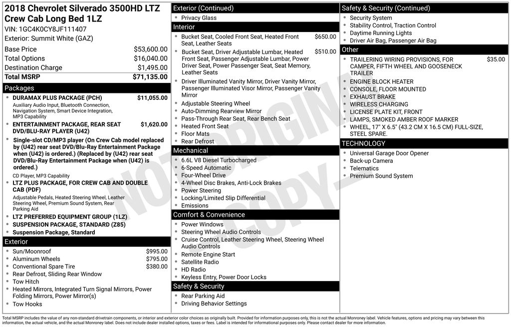 2018 Chevrolet Silverado 3500HD LTZ Summit White LTZ 4WD Allison 1000 6-Speed Automatic Duramax 6.6L V8 Turbodiesel Allison 1000 6-Speed Automatic, 4WD, Jet Black Leather, 110-Volt AC Power Outlet, 150 Amps Alternator, 4-Wheel Disc Brakes, 4.2" Diagonal Color Display Driver Info Center, 6 Speakers, 6-Speaker Audio System, ABS brakes, Air Conditioning, AM/FM radio, Auto-Dimming Inside Rear-View Mirror, Auto-dimming Rear-View mirror, Automatic temperature control, Bodyside moldings, Bose 6 Speaker Sound System, Brake assist, Bumpers: chrome, CD player, Chevrolet Connected Access, Chevrolet w/4G LTE, Chrome Bodyside Moldings, Chrome Door Handles, Chrome Power-Adjustable Heated Outside Mirrors, Color-Keyed Carpeting Floor Covering, Compass, Deep-Tinted Glass, Delay-off headlights, Digital Steering Assist, Driver & Front Passenger Visors, Driver door bin, Driver vanity mirror, Dual front impact airbags, Dual-Zone Automatic Climate Control, Duramax Plus Package, Electric Rear-Window Defogger, Electronic Shift Transfer Case, Electronic Stability Control, Emergency communication system, Engine Block Heater, Exhaust Brake, Exterior Parking Camera Rear, EZ-Lift & Lower Tailgate, Floor Mounted Console, Front 40/20/40 Split Bench Seat, Front anti-roll bar, Front Center Armrest w/Storage, Front dual zone A/C, Front fog lights, Front Full Feature Bucket Seats, Front Halogen Fog Lamps, Front License Plate Kit, Front reading lights, Front wheel independent suspension, Fully automatic headlights, Garage door transmitter, HD Radio, Heated & Vented Front Seating, Heated door mirrors, Heated Driver & Front Passenger Seats, Heated front seats, Illuminated entry, Integrated Trailer Brake Controller, Leather Wrapped Heated Steering Wheel, Leather-Appointed Seat Trim, Leather-Wrapped Steering Wheel, LTZ Plus Package, Manual Tilt-Wheel/Telescoping Steering Column, Memory seat, Occupant sensing airbag, OnStar & Chevrolet Connected Services Capable, Outside temperature display, Overhead console, Panic alarm, Passenger door bin, Passenger vanity mirror, Power Adjustable Pedals, Power door mirrors, Power driver seat, Power passenger seat, Power Sliding Rear Window w/Defogger, Power steering, Power Sunroof, Power Windows, Power windows, Preferred Equipment Group 1LZ, Premium audio system: Chevrolet MyLink, Radio: Chevrolet MyLink Audio System, Radio: Chevrolet MyLink w/Navigation, Rear 60/40 Folding Bench Seat (Folds Up), Rear reading lights, Rear seat center armrest, Rear Seat Entertainment Package, Rear step bumper, Rear window defroster, Remote Keyless Entry, Remote keyless entry, Remote Locking Tailgate, Remote Vehicle Starter System, Security system, Single-Slot CD/MP3 Player, SiriusXM Satellite Radio, Speed control, Speed-sensing steering, Split folding rear seat, Standard Suspension Package, Steering Wheel Audio Controls, Steering wheel mounted audio controls, Tachometer, Telescoping steering wheel, Tilt steering wheel, Traction control, Trailering Equipment, Trip computer, Turn signal indicator mirrors, Ultrasonic Front & Rear Park Assist, Unauthorized Entry Theft-Deterrent System, Universal Home Remote, Variably intermittent wipers, Voltmeter, Wireless Charging, Allison 1000 6-Speed Automatic, 4WD, Jet Black Leather.