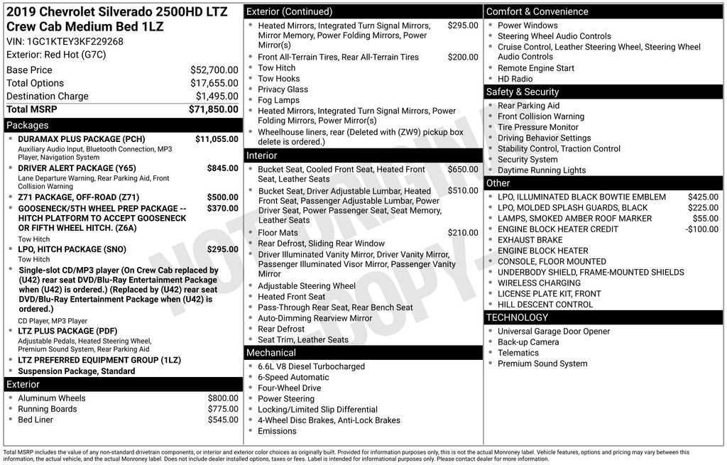2019 Chevrolet Silverado 2500HD LTZ Red Hot LTZ 4WD Allison 1000 6-Speed Automatic Duramax 6.6L V8 Turbodiesel Allison 1000 6-Speed Automatic, 4WD, Jet Black Leather, 110-Volt AC Power Outlet, 18" Chromed Aluminum Wheels, 4-Wheel Disc Brakes, 4.2" Diagonal Color Display Driver Info Center, 6 Speakers, 6-Speaker Audio System, 6" Rectangular Chromed Assist Steps (LPO), ABS brakes, Air Conditioning, All-Weather Floor Liner (LPO), Alloy wheels, AM/FM radio: SiriusXM, Auto-dimming door mirrors, Auto-Dimming Inside Rear-View Mirror, Auto-dimming Rear-View mirror, Automatic temperature control, Black Molded Splash Guards (LPO), Bodyside moldings, BOSE Sound w/6 Speaker System, Brake assist, Bumpers: chrome, CD player, Chevrolet 4G LTE, Chevrolet Connected Access, Chrome Bodyside Moldings, Chrome Door Handles, Chrome Mirror Caps, Chrome Power-Adjustable Heated Trailering Mirrors, Chrome wheels, Color-Keyed Carpeting Floor Covering, Compass, Deep-Tinted Glass, Delay-off headlights, Digital Steering Assist, Driver & Front Passenger Vanity Mirror Visors, Driver Alert Package, Driver door bin, Driver vanity mirror, Dual front impact airbags, Dual front side impact airbags, Dual-Zone Automatic Climate Control, Duramax Plus Package, Electric Rear-Window Defogger, Electronic Shift Transfer Case, Electronic Stability Control, Engine Block Heater, Exhaust Brake, Exterior Parking Camera Rear, Floor Mounted Console, Forward Collision Alert, Front 40/20/40 Split Bench Seat, Front anti-roll bar, Front Center Armrest w/Storage, Front dual zone A/C, Front fog lights, Front Halogen Fog Lamps, Front License Plate Kit, Front reading lights, Front wheel independent suspension, Fully automatic headlights, Garage door transmitter, Gooseneck/5th Wheel Prep Package, HD Radio, Heated & Vented Front Seating, Heated door mirrors, Heated Driver & Front Passenger Seating, Heated Front Full Feature Bucket Seats, Heated front seats, Heated Leather Wrapped Steering Wheel, Heated Power-Adjustable Outside Mirrors, Hill Descent Control, Hitch Package (LPO), Illuminated Black Bowtie Emblem (LPO), Illuminated entry, Integrated Trailer Brake Controller, Lane Departure Warning System, Leather Appointed Seat Trim, Leather-Wrapped Steering Wheel, Low tire pressure warning, LTZ Plus Package, Manual Tilt-Wheel/Telescoping Steering Column, Memory seat, Occupant sensing airbag, Off-Road Z71 Package, OnStar & Chevrolet Connected Services Capable, Outside temperature display, Overhead airbag, Overhead console, Panic alarm, Passenger door bin, Passenger vanity mirror, Power door mirrors, Power driver seat, Power passenger seat, Power Sliding Rear Window w/Defogger, Power steering, Power windows, Power-Adjustable Pedals, Preferred Equipment Group 1LZ, Premium audio system: Chevrolet Infotainment System, Radio: Chevrolet Infotainment System, Radio: Chevrolet Infotainment System w/Navigation, Rear 60/40 Folding Bench Seat (Folds Up), Rear reading lights, Rear seat center armrest, Rear step bumper, Rear Wheelhouse Liners, Rear window defroster, Remote Keyless Entry, Remote keyless entry, Remote Locking Tailgate, Remote Vehicle Starter System, Security system, Single Slot CD/MP3 Player, SiriusXM Radio, Smoked Amber Roof Marker Lamps, Speed control, Speed-sensing steering, Split folding rear seat, Spray-On Pickup Box Bed Liner w/Bowtie Logo, Standard Suspension Package, Steering Wheel Audio Controls, Steering wheel mounted audio controls, Tachometer, Telescoping steering wheel, Tilt steering wheel, Traction control, Trailering Equipment, Trip computer, Turn signal indicator mirrors, Ultrasonic Front & Rear Park Assist, Unauthorized Entry Theft-Deterrent System, Universal Home Remote, Variably intermittent wipers, Voltmeter, Wheels: 20" 6-Spoke Polished Aluminum, Wireless Charging, Allison 1000 6-Speed Automatic, 4WD, Jet Black Leather.