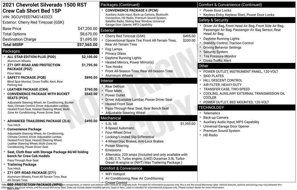 2021 Chevrolet Silverado 1500 RST Cherry Red Tintcoat RST 4WD 8-Speed Automatic EcoTec3 5.3L V8 8-Speed Automatic, 4WD, Gideon/Very Dark Atmosphere Leather, 10-Way Power Driver Seat w/Lumbar, 12-Volt Rear Auxiliary Power Outlet, 120-Volt Bed Mounted Power Outlet, 120-Volt Instrument Panel Power Outlet, 170 Amp Alternator, 2 USB Ports, 2 USB Ports (First Row), 220 Amp Alternator, 3.23 Rear Axle Ratio, 4-Wheel Disc Brakes, 4.2" Diagonal Color Display Driver Info Center, 40/20/40 Front Split-Bench Seat, 4G LTE Wi-Fi Hot Spot Capable, 6 Speakers, 6-Speaker Audio System, ABS brakes, Advanced Trailering Package, Advanced Trailering System, Air Conditioning, All Star Edition Plus, All-Star Edition, All-Weather Floor Liner (LPO) (AAK), Alloy wheels, AM/FM radio: SiriusXM, Apple CarPlay/Android Auto, Auto-Locking Rear Differential, Automatic temperature control, Auxiliary External Transmission Oil Cooler, Bed Protection Package, Bluetooth® For Phone, Body Color Grille, Brake assist, Bumpers: body-color, Chevrolet Connected Access Capable, Chevytec Spray-On Black Bedliner, Cloth Rear Seat w/Storage Package, Cloth Seat Trim, Color-Keyed Carpeting Floor Covering, Compass, Convenience Package, Convenience Package II, Convenience Package w/Buckets Seats, Deep-Tinted Glass, Delay-off headlights, Driver door bin, Driver vanity mirror, Dual Exhaust w/Polished Outlets, Dual front impact airbags, Dual front side impact airbags, Dual-Zone Automatic Climate Control, Electric Rear-Window Defogger, Electrical Lock Control Steering Column, Electronic Cruise Control, Electronic Stability Control, External Engine Oil Cooler, EZ Lift Power Lock & Release Tailgate, Floor Mounted Center Console, Front anti-roll bar, Front Bucket Seats, Front Center Armrest w/Storage, Front dual zone A/C, Front fog lights, Front Frame-Mounted Black Recovery Hooks, Front LED Fog Lamps, Front reading lights, Front Rubberized Vinyl Floor Mats, Front wheel independent suspension, Fully automatic headlights, HD Radio, HD Rear Vision Camera, Heated door mirrors, Heated Driver & Front Outboard Passenger Seats, Heated front seats, Heated Steering Wheel, Heated steering wheel, Heavy Duty Suspension, Heavy-Duty Air Filter, High Gloss Black Mirror Caps, Hill Descent Control, Hitch Guidance, Hitch Guidance w/Hitch View, Illuminated entry, Integrated Trailer Brake Controller, Keyless Open & Start, Lane Change Alert w/Side Blind Zone Alert, Leather Package, Leather Wrapped Steering Wheel, Leather-Appointed Front Seat Trim, LED Cargo Area Lighting, Low tire pressure warning, Manual Tilt/Telescoping Steering Column, Occupant sensing airbag, Off-Road Suspension, OnStar & Chevrolet Connected Services Capable, Outside temperature display, Overhead airbag, Overhead console, Panic alarm, Passenger door bin, Passenger vanity mirror, Perimeter Lighting, Power Door Locks, Power door mirrors, Power driver seat, Power Front Windows w/Driver Express Up/Down, Power Front Windows w/Passenger Express Down, Power Rear Windows w/Express Down, Power Sliding Rear Window w/Rear Defogger, Power steering, Power windows, Preferred Equipment Group 1SP, Premium audio system: Chevrolet Infotainment 3, Premium Bose 7-Speaker Sound System, Radio data system, Radio: Chevrolet Infotainment 3 Plus System, Radio: Chevrolet Infotainment 3 System, Rear 60/40 Folding Bench Seat (Folds Up), Rear Cross Traffic Alert, Rear Dual USB Charging-Only Ports, Rear reading lights, Rear Rubberized-Vinyl Floor Mats, Rear seat center armrest, Rear step bumper, Rear Vision Camera, Rear Wheelhouse Liners, Rear window defroster, Remote keyless entry, Remote Vehicle Starter System, Safety Package, Security system, SiriusXM Radio, SiriusXM w/360L, Speed control, Speed-sensing steering, Split folding rear seat, Standard Tailgate, Steering Wheel Audio Controls, Steering wheel mounted audio controls, Tachometer, Telescoping steering wheel, Theft Deterrent System (Unauthorized Entry), Tilt steering wheel, Traction control, Trailering Package,