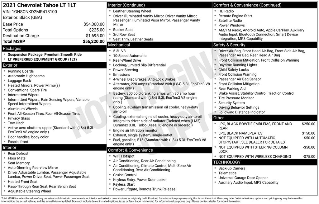 2021 Chevrolet Tahoe LT Black LT RWD 10-Speed Automatic with Overdrive EcoTec3 5.3L V8 Gideon/Very Dark Atmosphere Leather, 10-Way Power Driver & Passenger Seat Adjusters, 1st & 2nd Row Color-Keyed Carpeted Floor Mats, 2 USB Data Ports, 3.23 Rear Axle Ratio, 3rd row seats: split-bench, 4-Wheel Disc Brakes, 9 Speakers, ABS brakes, Air Conditioning, Alloy wheels, AM/FM radio: SiriusXM with 360L, Apple CarPlay/Android Auto, Auto High-beam Headlights, Auto-Dimming Inside Rear-View Mirror, Auto-dimming Rear-View mirror, Automatic temperature control, Black Name Plates (LPO), Bose 9-Speaker Stereo Audio System Feature, Brake assist, Bright Front & Rear Door Sill Plates, Bumpers: body-color, Color-Keyed Carpeting Floor Covering, Compass, Delay-off headlights, Driver & Front Outboard Passenger Airbags, Driver door bin, Driver vanity mirror, Dual front impact airbags, Dual front side impact airbags, Electronic Stability Control, Emergency communication system: OnStar and Chevrolet connected services capable, Floor Console w/Storage Area, Four wheel independent suspension, Front & Rear Black Bowtie Emblems (LPO), Front anti-roll bar, Front Bucket Seats, Front Center Armrest, Front dual zone A/C, Front High-Back Reclining Bucket Seats, Front reading lights, Fully automatic headlights, Garage door transmitter, Hands-Free Rear Power Programmable Liftgate, HD Radio, Heated door mirrors, Heated Driver & Front Passenger Seats, Heated front seats, Illuminated entry, Infotainment Display, Leather Seat Trim, Leather steering wheel, Leather-Wrapped Steering Wheel, LED Daytime Running Lamps, Low tire pressure warning, Memory seat, Memory Settings for Driver, Not Equipped w/Automatic Stop/Start, Not Equipped w/Steering Column Lock, Not Equipped w/Wireless Charging, Occupant sensing airbag, Outside temperature display, Overhead airbag, Overhead console, Panic alarm, Passenger door bin, Passenger vanity mirror, Power door mirrors, Power driver seat, Power Liftgate, Power passenger seat, Power steering, Power windows, Preferred Equipment Group 1LT, Premium audio system: Chevrolet Infotainment 3, Premium Smooth Ride Suspension, Radio: Chevrolet Infotainment 3 Plus System, Rain sensing wipers, Rear air conditioning, Rear anti-roll bar, Rear reading lights, Rear seat center armrest, Rear window defroster, Rear window wiper, Remote keyless entry, Remote Start, Roof rack: rails only, Security system, SiriusXM Radio w/360L, Speed control, Speed-sensing steering, Split folding rear seat, Spoiler, Steering wheel mounted audio controls, Tachometer, Telescoping steering wheel, Tilt steering wheel, Traction control, Trip computer, Universal Home Remote, Variably intermittent wipers, Voltmeter, Wheels: 18" x 8.5" Bright Silver Painted Aluminum, Gideon/Very Dark Atmosphere Leather.