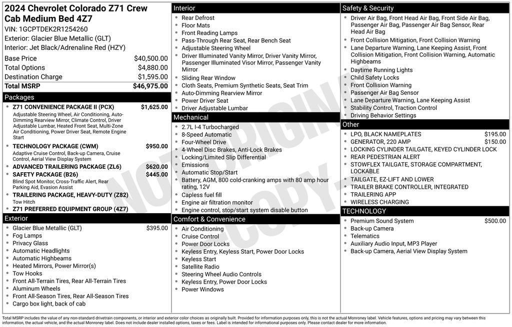 2024 Chevrolet Colorado Z71 Glacier Blue Metallic Z71 4WD 8-Speed Automatic 2.7L I4 Turbocharged DOHC 16V LEV3-ULEV50 310hp 4WD, 220 Amp Generator, 3.42 Rear Axle Ratio, 4-Way Manual Passenger Seat Adjuster, 4-Wheel Disc Brakes, 6 Speakers, 6-Speaker Audio System Feature, 6-Way Manual Driver Seat Adjuster, 8-Way Power Driver Seat Adjuster, ABS brakes, Adaptive Cruise Control, Advanced Trailering Package, Air Conditioning, Alloy wheels, AM/FM radio: SiriusXM, Apple CarPlay/Android Auto, Auto High-beam Headlights, Automatic Emergency Braking, Black Nameplates (LPO), Blind Zone Steering Assist w/Trailering, Bose Premium 7-Speaker Audio System Feature, Brake assist, Bumpers: body-color, Chevy Safety Assist, Cloth/Evotex Seat Trim, Compass, Delay-off headlights, Driver door bin, Driver vanity mirror, Dual front impact airbags, Dual front side impact airbags, Dual-Zone Automatic Air Conditioning, Electronic Automatic Cruise Control, Electronic Stability Control, EZ-Lift & Lower Tailgate, Following Distance Indicator, Forward Collision Alert, Front anti-roll bar, Front Bucket Seats, Front Center Armrest, Front fog lights, Front Passenger Seatback Map Pocket, Front Pedestrian & Bicyclist Braking, Front reading lights, Front wheel independent suspension, HD Surround Vision, Heated door mirrors, Heated Driver & Front Passenger Seats, Heavy-Duty Trailering Package, Illuminated entry, Inside Rear-View Auto-Dimming Mirror, Integrated Trailer Brake Controller, IntelliBeam Automatic High Beam On/Off, Lane Keep Assist w/Lane Departure Warning, Low tire pressure warning, Navigation System, Occupant sensing airbag, Outside temperature display, Overhead airbag, Overhead console, Panic alarm, Passenger door bin, Passenger vanity mirror, Power door mirrors, Power Driver Lumbar Control Seat Adjuster, Power steering, Power windows, Preferred Equipment Group 4Z7, Radio data system, Radio: 11.3" Diagonal Advanced Color LCD Display, Rear Cross Traffic Braking, Rear Park Assist, Rear Pedestrian Alert, Rear reading lights, Rear step bumper, Rear window defroster, Rear-Window Electric Defogger, Remote keyless entry, Remote Vehicle Starter System, Safety Package, Security system, SiriusXM Radio, Speed control, Speed-sensing steering, Split folding rear seat, Steering Wheel Mounted Audio Controls, Steering wheel mounted audio controls, StowFlex Tailgate Storage Compartment, Tachometer, Tailgate Keyed Cylinder Lock, Technology Package, Tilt & Telescoping Steering Column, Tilt steering wheel, Traction control, Trailering App, Trip computer, Variably intermittent wipers, Wheels: 18" x 8.5" Android Dark Full Gloss Aluminum, Wireless Charging, Wireless Phone Projection, Z71 Convenience Package II, 4WD.