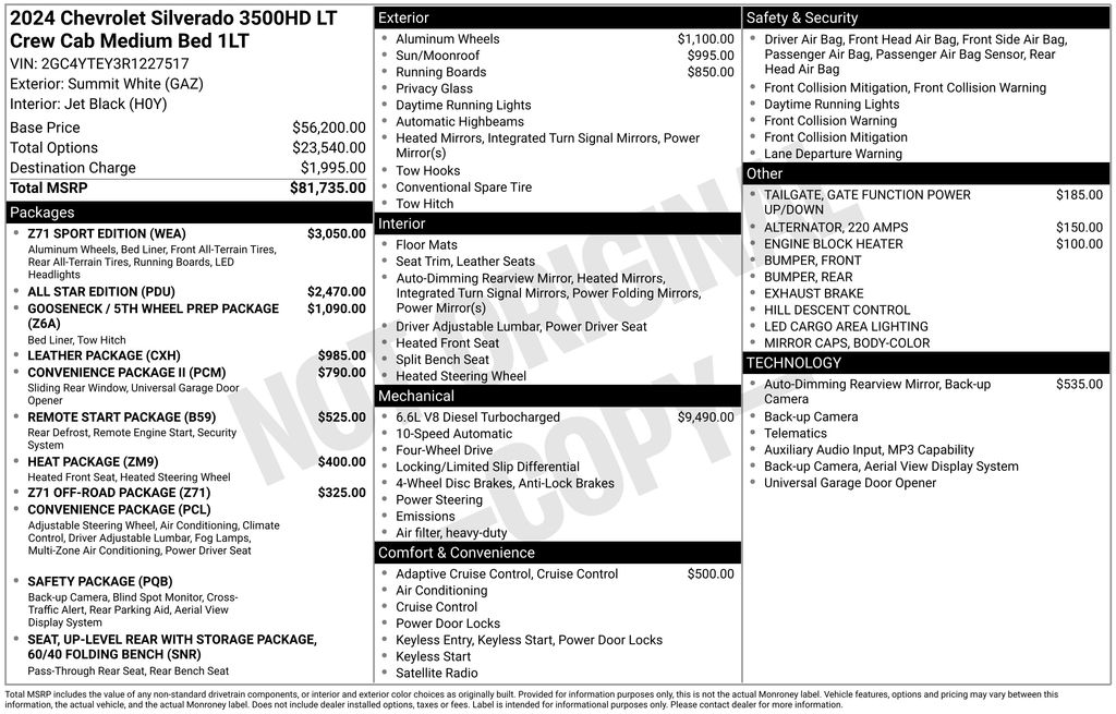 2024 Chevrolet Silverado 3500HD LT Summit White LT 4WD 10-Speed Automatic Duramax 6.6L V8 Turbodiesel 10-Speed Automatic, 4WD, Black Leather, 10-Way Power Driver Seat Adjuster w/Lumbar, 120-Volt Bed Mounted Power Outlet, 120-Volt Interior Power Outlet, 170 Amp Alternator, 2-Speed Electronic Shift Transfer Case, 220 Amp Alternator, 4-Way Manual Driver Seat Adjuster, 4-Way Manual Passenger Seat Adjuster, 4-Wheel Disc Brakes, 4" Round Black Assist Steps (LPO), 6 Speakers, 6-Speaker Audio System Feature, ABS brakes, Adaptive Cruise Control, Air Conditioning, All Star Edition, Alloy wheels, AM/FM radio: SiriusXM with 360L, Animated LED Projector Headlamps, Apple CarPlay/Android Auto, Auto High-beam Headlights, Auto-Dimming Inside Rear-View Mirror, Auto-Dimming Inside Rearview Mirror w/Camera, Bed View Camera w/2 Trailer Camera Provisions, Black Mirror Caps, Bluetooth® For Phone, Body-Color Mirror Caps, Brake assist, Bumpers: chrome, Chevrolet Connected Access Capable, Chevytec Spray-On Black Bedliner, Cloth Rear Seat w/Storage Package, Cloth Seat Trim, Color-Keyed Carpeting Floor Covering, Compass, Compass Located In Instrument Cluster, Convenience Package, Convenience Package II, Deep-Tinted Glass, Delay-off headlights, Driver door bin, Driver vanity mirror, Dual front impact airbags, Dual front side impact airbags, Dual Rear USB Ports (Charge Only), Dual-Zone Automatic Climate Control, Durabed Pickup Bed, Electric Rear-Window Defogger, Electronic Stability Control, Engine Block Heater, Exhaust Brake, EZ Lift Power Lock & Release Tailgate, Front 40/20/40 Split-Bench Seats w/Lockable Storage, Front anti-roll bar, Front Center Armrest w/Storage, Front LED Fog Lamps, Front reading lights, Front Rubberized Vinyl Floor Mats, Front wheel independent suspension, Fully automatic headlights, Gloss Black Front Bumper, Gloss Black Rear Bumper, Gooseneck/5th Wheel Prep Package, Halogen Reflector Headlamps, HD Rear Vision Camera, HD Surround Vision, Heat Package, Heated door mirrors, Heated Driver & Front Outboard Passenger Seats, Heated Steering Wheel, Heavy-Duty 80 Amp-Hr Battery, Hill Descent Control, Hitch Guidance w/Hitch View, Illuminated entry, In-Vehicle Trailering App System, Keyless Open & Start, Leather Package, LED Cargo Area Lighting, Low tire pressure warning, Manual Tilt-Wheel Steering Column, Manual Tilt-Wheel/Telescoping Steering Column, Occupant sensing airbag, OnStar & Chevrolet Connected Services Capable, Outside Power-Adjustable Mirrors, Outside temperature display, Overhead airbag, Overhead console, Panic alarm, Passenger door bin, Passenger vanity mirror, Perimeter Lighting, Power Door Locks, Power door mirrors, Power Front Windows w/Driver Express Up/Down, Power Front Windows w/Passenger Express Down, Power Rear Windows w/Express Down, Power Sliding Rear Window w/Defogger, Power steering, Power Sunroof, Power Tailgate, Power windows, Power-Adjustable Outside Mirrors, Preferred Equipment Group 1LT, Premium audio system: Chevrolet Infotainment 3 Premium, Push Button Start, Radio: Chevrolet Infotainment 3 Premium System, Rear 60/40 Folding Bench Seat (Folds Up), Rear Cross Traffic Alert, Rear reading lights, Rear Rubberized-Vinyl Floor Mats, Rear step bumper, Remote keyless entry, Remote Start Package, Remote Vehicle Starter System, Safety Package, SiriusXM w/360L, Speed control, Split folding rear seat, Standard Tailgate, Steering Wheel Audio Controls, Steering wheel mounted audio controls, Steering Wheel Mounted Electronic Cruise Control, Suspension Package, Tachometer, Tilt steering wheel, Traction control, Trailer Camera Provisions, Trailer Side Blind Zone Alert, Trip computer, Turn signal indicator mirrors, Ultrasonic Rear Park Assist, Unauthorized Entry Theft-Deterrent System, Universal Home Remote, Up-Level Rear Seat w/Storage Package, Variably intermittent wipers, Voltmeter, Wheels: 18" 6-Spoke Machined Aluminum, Wheels: 20" High-Gloss Black Painted, Wi-Fi Hotspot Capable, Winter Grille Cover, Wrapped Steering Whe
