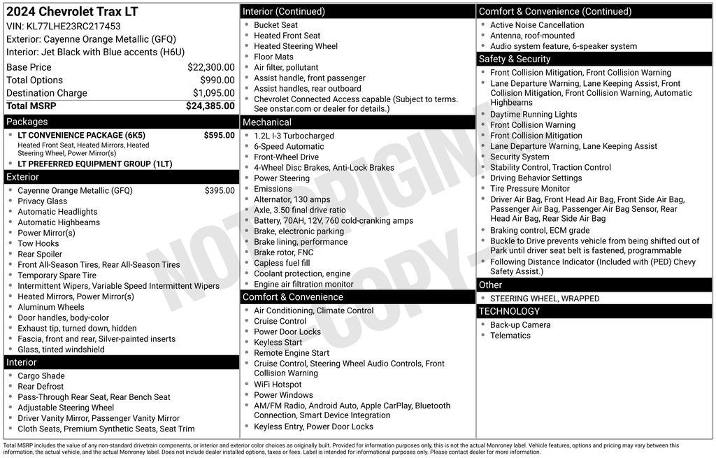 2024 Chevrolet Trax LT Cayenne Orange Metallic LT FWD 6-Speed Automatic 1.2L Ecotec Turbo DOHC DI w/VVT 2-Way Adjustable Front Head Restraints, 3.50 Final Drive Axle Ratio, 4-Way Manual Front Passenger Seat Adjuster, 4-Wheel Disc Brakes, 6 Speakers, 6-Speaker Audio System Feature, 6-Way Manual Driver Seat Adjuster, ABS brakes, Air Conditioning, Alloy wheels, AM/FM radio: SiriusXM, Auto High-beam Headlights, Automatic temperature control, Brake assist, Bumpers: body-color, Cloth/Evotex Seat Trim, Compass, Delay-off headlights, Driver door bin, Driver vanity mirror, Dual front impact airbags, Dual front side impact airbags, Electronic Stability Control, Emergency communication system: OnStar and Chevrolet connected services capable, Exterior Parking Camera Rear, Front anti-roll bar, Front Bucket Seats, Front Center Armrest, Front reading lights, Front wheel independent suspension, Fully automatic headlights, Heated Driver & Front Passenger Seats, Heated Power-Adjustable Outside Mirrors, Heated Steering Wheel, Illuminated entry, Keyless Open, Low tire pressure warning, LT Convenience Package, Occupant sensing airbag, Outside temperature display, Overhead airbag, Overhead console, Panic alarm, Passenger door bin, Passenger vanity mirror, Power door mirrors, Power steering, Power windows, Preferred Equipment Group 1LT, Premium audio system: Chevrolet Infotainment 3, Radio data system, Radio: Audio System w/AM/FM, Rear window defroster, Rear window wiper, Remote keyless entry, Security system, SiriusXM, Speed control, Split folding rear seat, Spoiler, Steering wheel mounted audio controls, Tachometer, Telescoping steering wheel, Tilt steering wheel, Traction control, Trip computer, Variably intermittent wipers, Wheels: 17" Gray-Painted Machined Aluminum, Wrapped Steering Wheel.