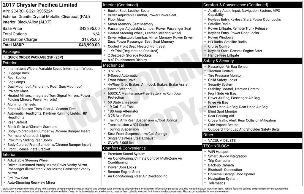 2017 Chrysler Pacifica Limited Granite Crystal Metallic Clearcoat Limited FWD 9-Speed Automatic 3.6L V6 24V VVT 1-Yr Trial (Registration Required), 13 Speakers, 3.25 Axle Ratio, 3rd row seats: split-bench, 4-Wheel Disc Brakes, 8.4" Touchscreen Display, ABS brakes, Air Conditioning, Alloy wheels, AM/FM radio: SiriusXM, Audio memory, Auto-dimming door mirrors, Auto-dimming Rear-View mirror, Automatic temperature control, Bodyside moldings, Brake assist, Bumpers: body-color, Compass, Delay-off headlights, Driver door bin, Driver vanity mirror, Driver's Seat Mounted Armrest, Dual front impact airbags, Dual front side impact airbags, Electronic Stability Control, Emergency communication system: Uconnect Access, Four wheel independent suspension, Front anti-roll bar, Front Bucket Seats, Front dual zone A/C, Front fog lights, Front reading lights, Fully automatic headlights, Garage door transmitter, GPS Antenna Input, GPS Navigation, HD Radio, Heated door mirrors, Heated front seats, Heated rear seats, Heated steering wheel, High-Intensity Discharge Headlights, Illuminated entry, Inflatable Spare Tire Kit w/Sealant, Integrated Voice Command w/Bluetooth, Knee airbag, Leather steering wheel, Low tire pressure warning, Memory seat, Navigation System, Occupant sensing airbag, Outside temperature display, Overhead airbag, Overhead console, Panic alarm, ParkView Rear Back-Up Camera, Passenger door bin, Passenger seat mounted armrest, Passenger vanity mirror, Power door mirrors, Power driver seat, Power Liftgate, Power moonroof, Power passenger seat, Power steering, Power windows, Premium Leather Trim Bucket Seats, Quick Order Package 25P (DISC), Radio data system, Radio: Uconnect 3C Nav w/8.4" Display, Rear air conditioning, Rear reading lights, Rear window defroster, Rear window wiper, Reclining 3rd row seat, Remote keyless entry, Roof rack, Security system, SiriusXM Satellite Radio, SiriusXM Traffic, SiriusXM Travel Link, Speed control, Split folding rear seat, Spoiler, Steering wheel mounted audio controls, Tachometer, Telescoping steering wheel, Tilt steering wheel, Touring Suspension, Traction control, Trip computer, Turn signal indicator mirrors, Uconnect Access, Vacuum Delete, Variably intermittent wipers, Ventilated front seats, Voltmeter, Wheels: 18" x 7.5" Aluminum Polished.