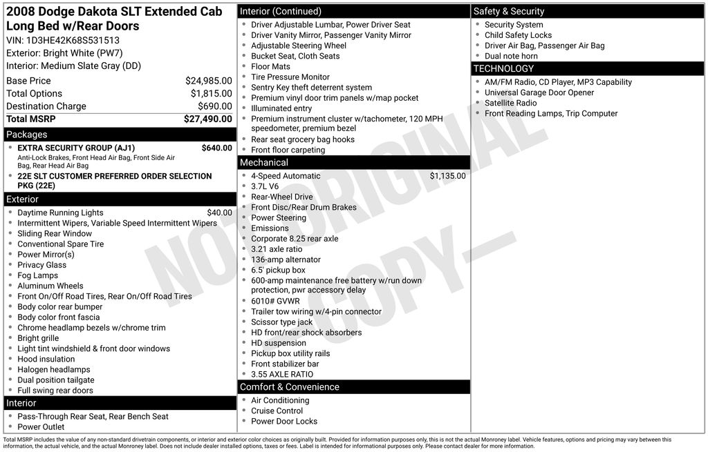 2008 Dodge Dakota SLT Bright White Clearcoat SLT RWD 4-Speed Automatic VLP 3.7L V6 16 x 8.0 Cast Aluminum Wheels, 4 Speakers, 4-Wheel Anti-Lock Brakes, ABS brakes, Air Conditioning, Alloy wheels, AM/FM CD MP3 w/SIRIUS Satellite, AM/FM radio: SIRIUS, Bumpers: body-color, CD player, Compass, Delay-off headlights, Driver door bin, Driver vanity mirror, Dual front impact airbags, Extra Security Group, Front anti-roll bar, Front Bucket Seats, Front Center Armrest, Front fog lights, Front reading lights, Front wheel independent suspension, Garage door transmitter, Heavy Duty Suspension, Illuminated entry, Low tire pressure warning, Occupant sensing airbag, Outside temperature display, Overhead console, Panic alarm, Passenger door bin, Passenger vanity mirror, Power door mirrors, Power driver seat, Power steering, Power windows, Premium Cloth Bucket Seats, Quick Order Package 22E, Radio data system, Rear step bumper, Remote keyless entry, Security system, SIRIUS Satellite Radio, Speed control, Split Rear 40/40 Folding Seat, Stain Repel Seat Fabric, Supplemental Side Airbags, Supplemental Side Curtain Front/Rear Airbags, Tachometer, Tilt steering wheel, Trip computer, Variably intermittent wipers.