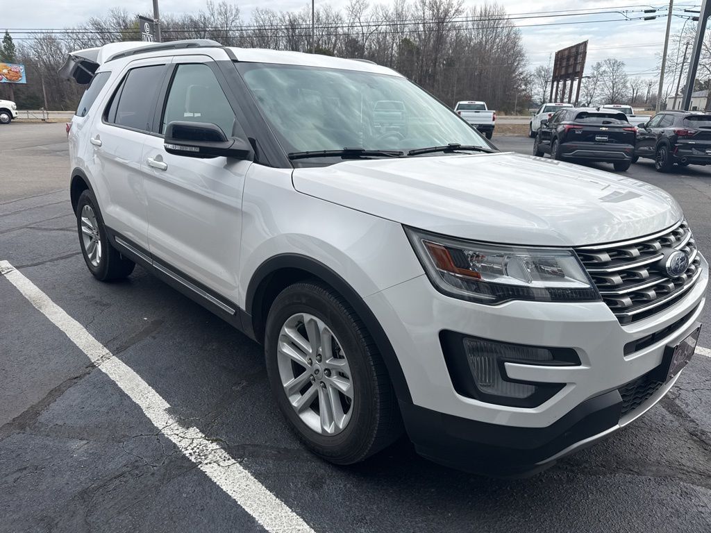 2017 Ford Explorer XLT White Platinum Clearcoat Metallic XLT FWD 6-Speed Automatic with Select-Shift 3.5L 6-Cylinder SMPI DOHC 18" Painted Aluminum Wheels, 3.39 Non-Limited-Slip Axle Ratio, 3rd row seats: split-bench, 4-Wheel Disc Brakes, 6 Speakers, ABS brakes, Air Conditioning, Alloy wheels, AM/FM radio: SiriusXM, Brake assist, Bumpers: body-color, CD player, Compass, Delay-off headlights, Driver door bin, Driver vanity mirror, Dual front impact airbags, Dual front side impact airbags, Electronic Stability Control, Emergency communication system: 911 Assist, Equipment Group 200A, Exterior Parking Camera Rear, Four wheel independent suspension, Front anti-roll bar, Front Bucket Seats, Front Center Armrest, Front fog lights, Front License Plate Bracket, Front reading lights, Fully automatic headlights, Heated door mirrors, Illuminated entry, Knee airbag, Leather steering wheel, Low tire pressure warning, Occupant sensing airbag, Outside temperature display, Overhead airbag, Overhead console, Panic alarm, Passenger door bin, Passenger vanity mirror, Power door mirrors, Power driver seat, Power passenger seat, Power steering, Power windows, Radio: AM/FM Stereo w/Single-CD/MP3 Capable, Rear air conditioning, Rear anti-roll bar, Rear Parking Sensors, Rear reading lights, Rear seat center armrest, Rear window defroster, Rear window wiper, Remote keyless entry, Roof rack: rails only, Security system, Speed control, Speed-sensing steering, Speed-Sensitive Wipers, Split folding rear seat, Spoiler, Steering wheel mounted audio controls, SYNC Communication & Entertainment System, Tachometer, Telescoping steering wheel, Tilt steering wheel, Traction control, Trip computer, Turn signal indicator mirrors, Variably intermittent wipers.