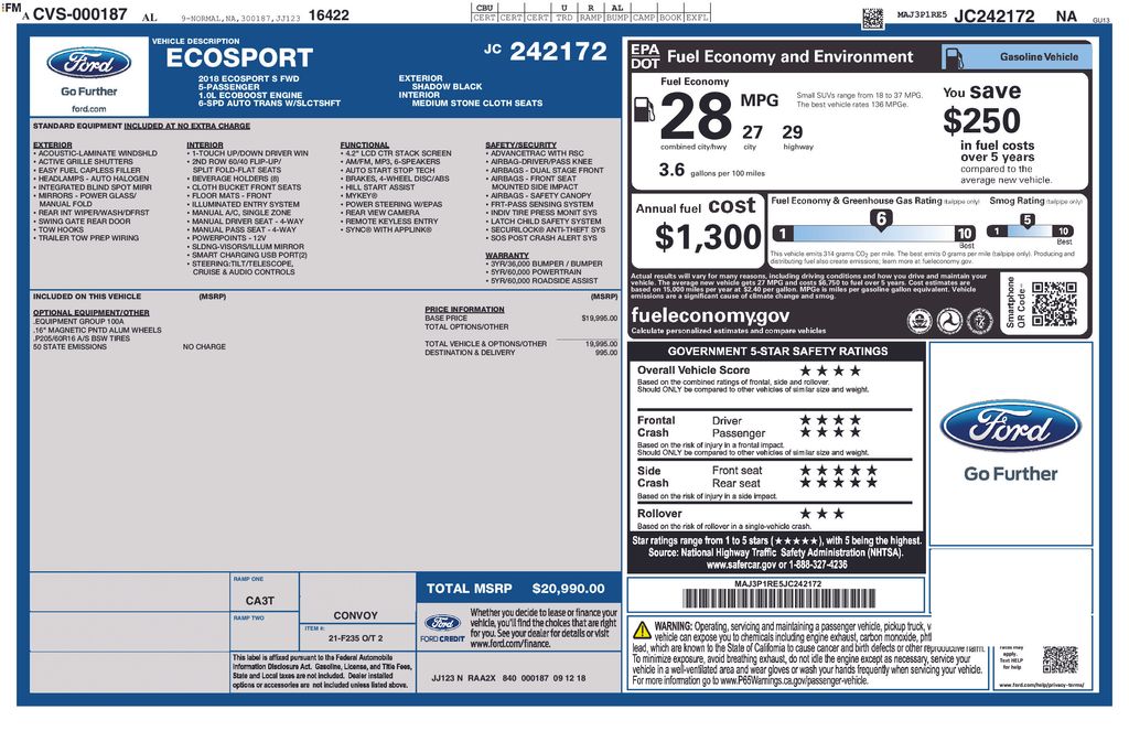 2018 Ford EcoSport S Shadow Black S FWD 6-Speed Automatic EcoBoost 1.0L I3 GTDi DOHC Turbocharged VCT 4-Wheel Disc Brakes, 6 Speakers, ABS brakes, Air Conditioning, Alloy wheels, AM/FM radio, Axle Ratio: 3.44, Brake assist, Bumpers: body-color, Cloth Front Bucket Seats, Compass, Delay-off headlights, Driver door bin, Driver vanity mirror, Dual front impact airbags, Dual front side impact airbags, Electronic Stability Control, Emergency communication system: 911 Assist, Equipment Group 100A, Exterior Parking Camera Rear, Front anti-roll bar, Front Bucket Seats, Front Center Armrest, Front reading lights, Front wheel independent suspension, Fully automatic headlights, Illuminated entry, Knee airbag, Low tire pressure warning, Occupant sensing airbag, Outside temperature display, Overhead airbag, Overhead console, Panic alarm, Passenger door bin, Passenger vanity mirror, Power door mirrors, Power steering, Power windows, Radio data system, Radio: AM/FM Stereo w/MP3 Capable, Rear seat center armrest, Rear side impact airbag, Rear window defroster, Rear window wiper, Remote keyless entry, Speed control, Speed-sensing steering, Split folding rear seat, Steering wheel mounted audio controls, SYNC Communications & Entertainment System, Tachometer, Telescoping steering wheel, Tilt steering wheel, Tire Inflator & Sealant Kit, Traction control, Trip computer, Variably intermittent wipers, Wheels: 16" Low-Gloss Magnetic-Painted.