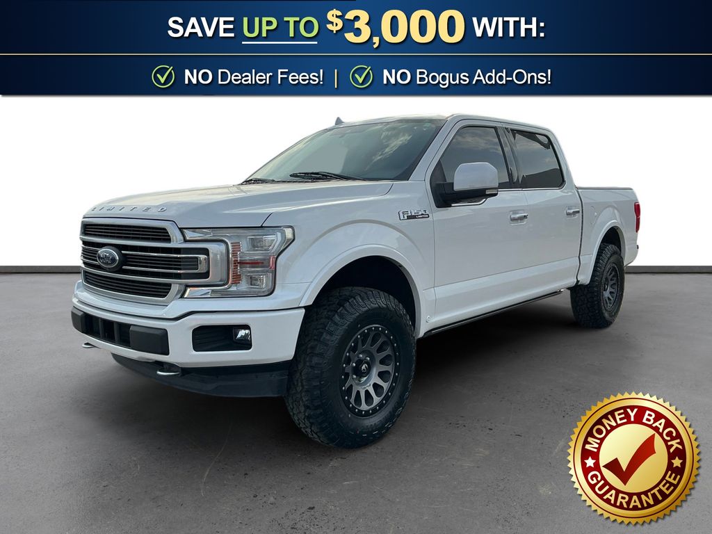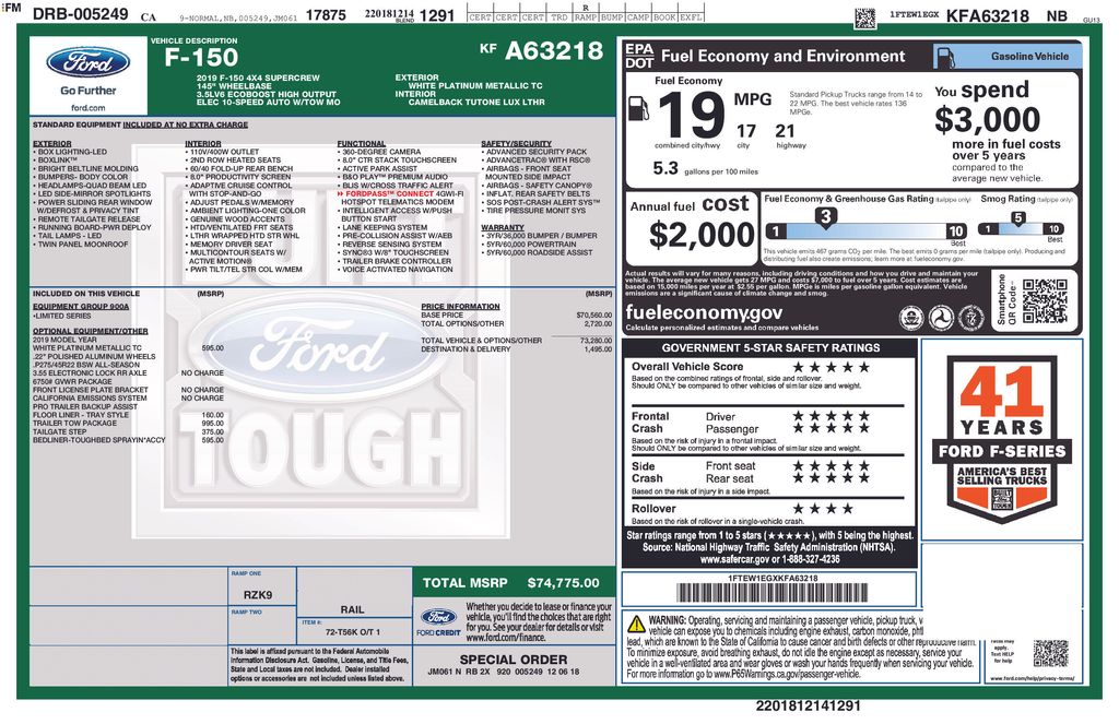 2019 Ford F-150 Limited White Platinum Clearcoat Metallic Limited 4WD 10-Speed Automatic 3.5L V6 EcoBoost 4WD, 10 Speakers, 22" Polished Aluminum Wheels, 4-Wheel Disc Brakes, ABS brakes, Adjustable pedals, Air Conditioning, Alloy wheels, AM/FM radio: SiriusXM, AppLink/Apple CarPlay and Android Auto, Auto High-beam Headlights, Auto tilt-away steering wheel, Auto-dimming door mirrors, Auto-dimming Rear-View mirror, Automatic temperature control, Brake assist, Bumpers: body-color, Class IV Trailer Hitch Receiver, Compass, Delay-off headlights, Driver door bin, Driver vanity mirror, Dual front impact airbags, Dual front side impact airbags, Electronic Locking w/3.55 Axle Ratio, Electronic Stability Control, Emergency communication system: SYNC 3 911 Assist, Engine Oil Cooler, Equipment Group 900A Base, Exterior Parking Camera Rear, Front anti-roll bar, Front Bucket Seats, Front Center Armrest, Front dual zone A/C, Front fog lights, Front License Plate Bracket, Front reading lights, Front wheel independent suspension, Fully automatic headlights, Garage door transmitter, Genuine wood door panel insert, GVWR: 6,750 lbs Payload Package, Heated door mirrors, Heated front seats, Heated rear seats, Heated steering wheel, Illuminated entry, Low tire pressure warning, Memory seat, Navigation System, Occupant sensing airbag, Outside temperature display, Overhead airbag, Overhead console, Panic alarm, Passenger door bin, Passenger vanity mirror, Pedal memory, Power door mirrors, Power driver seat, Power moonroof, Power passenger seat, Power steering, Power windows, Pro Trailer Backup Assist, Radio data system, Radio: B&O Sound System by Bang & Olufsen, Rain sensing wipers, Rear reading lights, Rear seat center armrest, Rear step bumper, Rear window defroster, Remote keyless entry, Security system, SiriusXM Radio, Speed control, Speed-sensing steering, Split folding rear seat, Steering wheel memory, Steering wheel mounted audio controls, SYNC 3, Tachometer, Tailgate Step w/Tailgate Lift Assist, Telescoping steering wheel, Tilt steering wheel, Tough Bed Spray-In Bedliner, Traction control, Trailer Tow Package, Tray Style Floor Liner, Trip computer, Turn signal indicator mirrors, Unique Leather Bucket Seats, Upgraded Front Stabilizer Bar, Variably intermittent wipers, Ventilated front seats, Voice-Activated Touchscreen Navigation, Voltmeter, 4WD.