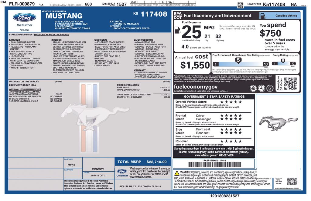 2019 Ford Mustang EcoBoost Magnetic EcoBoost RWD 10-Speed Automatic EcoBoost 2.3L I4 GTDi DOHC Turbocharged VCT 4-Wheel Disc Brakes, 6 Speakers, ABS brakes, Air Conditioning, Alloy wheels, AM/FM radio, AM/FM Stereo, Auto-dimming Rear-View mirror, Brake assist, Bumpers: body-color, Compass, Delay-off headlights, Driver door bin, Driver vanity mirror, Dual front impact airbags, Dual front side impact airbags, Electronic Stability Control, Emergency communication system: 911 Assist, Equipment Group 100A, Exterior Parking Camera Rear, Four wheel independent suspension, Front anti-roll bar, Front Bucket Seats, Front Center Armrest, Front reading lights, Fully automatic headlights, Illuminated entry, Knee airbag, Leather Shift Knob, Low tire pressure warning, Occupant sensing airbag, Outside temperature display, Overhead airbag, Overhead console, Panic alarm, Passenger door bin, Passenger vanity mirror, Power door mirrors, Power steering, Power windows, Radio data system, Rear anti-roll bar, Rear window defroster, Remote keyless entry, Security system, Speed control, Speed-sensing steering, Speed-Sensitive Wipers, Split folding rear seat, Steering wheel mounted audio controls, SYNC Communications & Entertainment System, Tachometer, Telescoping steering wheel, Tilt steering wheel, Traction control, Trip computer, Variably intermittent wipers, Voltmeter, Wheels: 17" Sparkle Silver-Painted Aluminum.