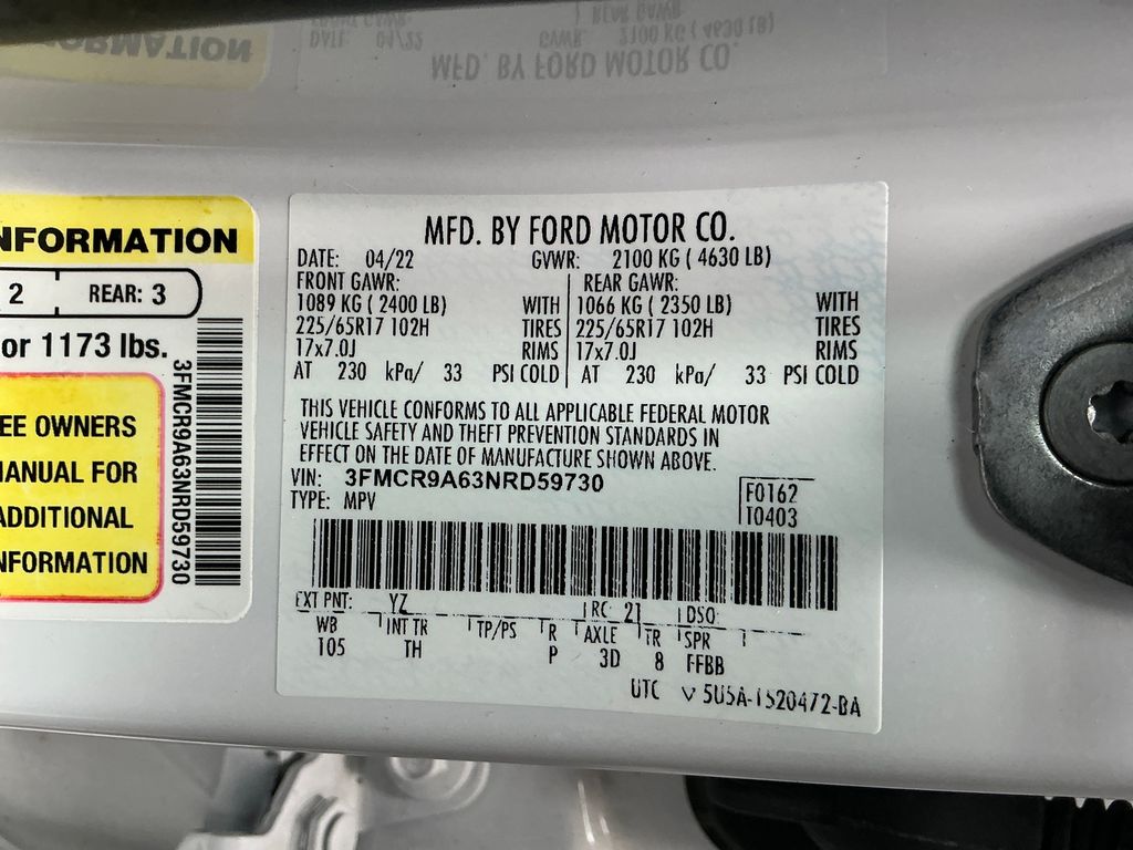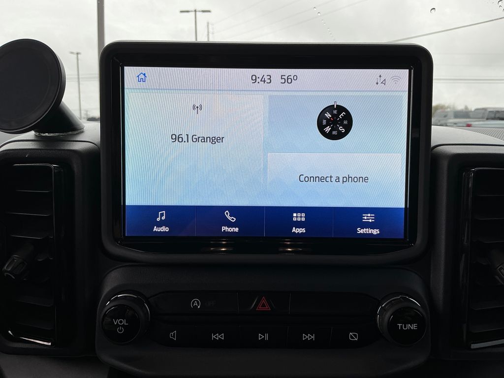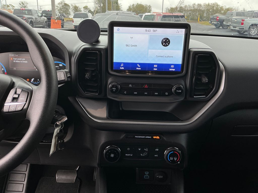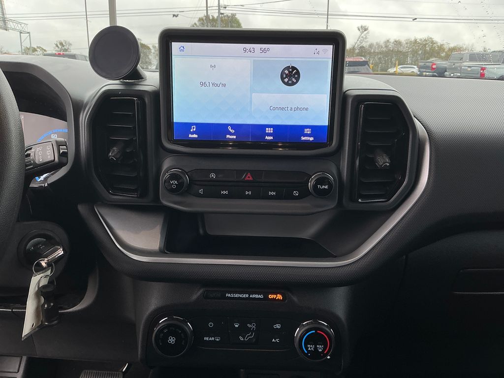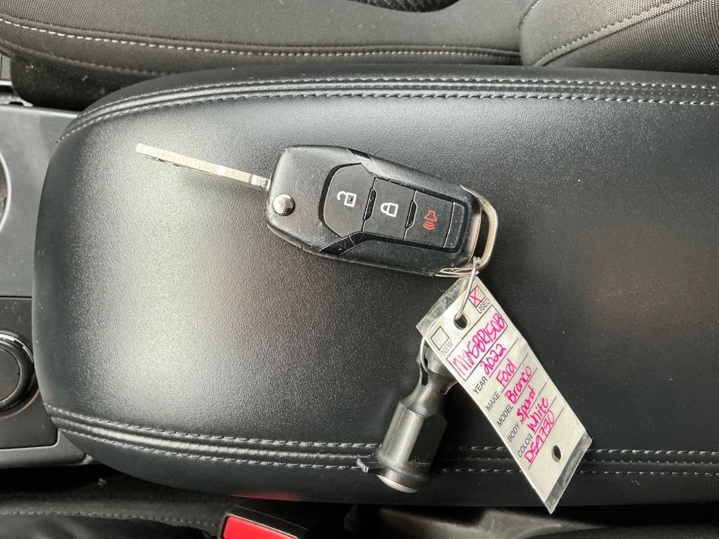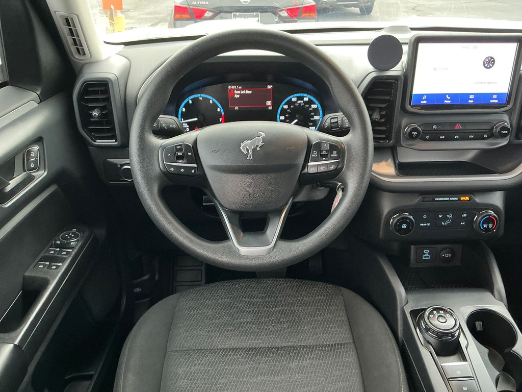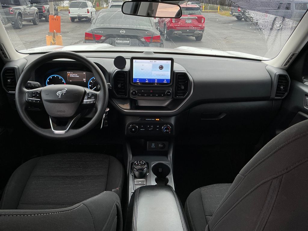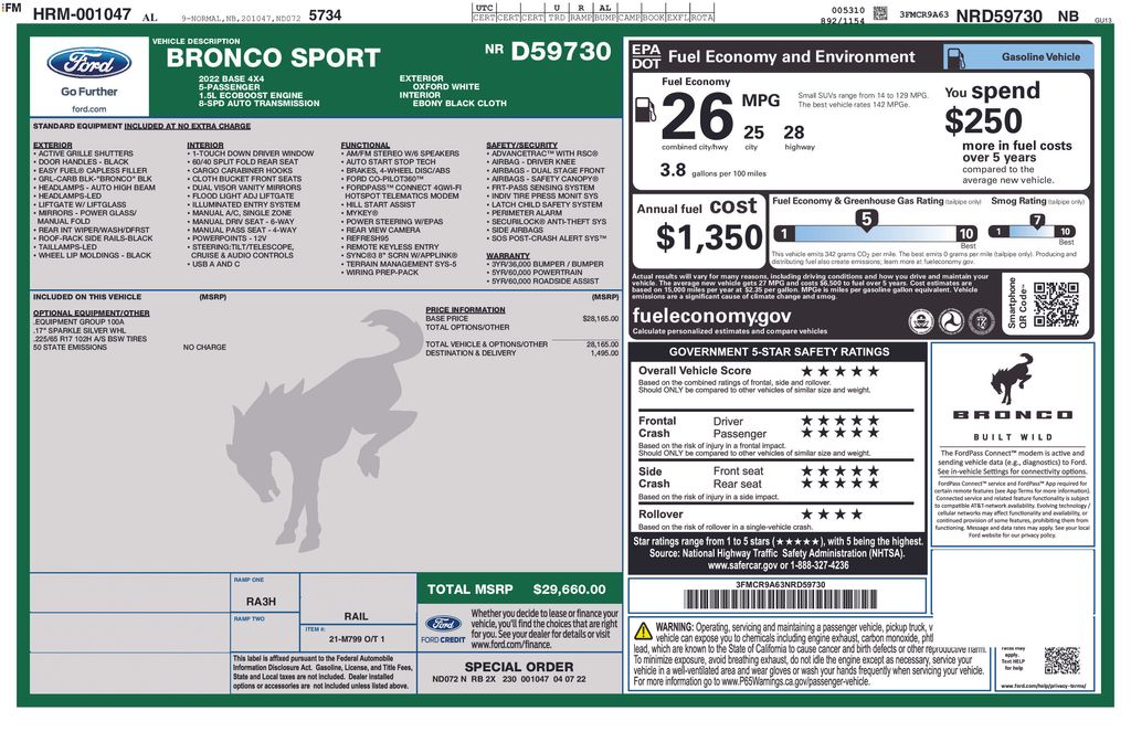 2022 Ford Bronco Sport Base Oxford White 4WD 8-Speed Automatic 1.5L EcoBoost 3.80 Axle Ratio, 4-Wheel Disc Brakes, 6 Speakers, ABS brakes, Air Conditioning, Alloy wheels, AM/FM radio, AM/FM Stereo, Auto High-beam Headlights, Brake assist, Cloth Front Bucket Seats, Compass, Delay-off headlights, Driver door bin, Driver vanity mirror, Dual front impact airbags, Dual front side impact airbags, Electronic Stability Control, Emergency communication system: SYNC 3 911 Assist, Equipment Group 100A, Exterior Parking Camera Rear, Four wheel independent suspension, Front anti-roll bar, Front Bucket Seats, Front Center Armrest, Front reading lights, Fully automatic headlights, Illuminated entry, Knee airbag, Low tire pressure warning, Occupant sensing airbag, Outside temperature display, Overhead airbag, Overhead console, Panic alarm, Passenger door bin, Passenger vanity mirror, Power door mirrors, Power steering, Power windows, Radio data system, Rear anti-roll bar, Rear reading lights, Rear window defroster, Rear window wiper, Remote keyless entry, Roof rack: rails only, Security system, Speed control, Speed-sensing steering, Speed-Sensitive Wipers, Split folding rear seat, Steering wheel mounted audio controls, SYNC 3 Communications & Entertainment System, SYNC 3/Apple CarPlay/Android Auto, Tachometer, Telescoping steering wheel, Tilt steering wheel, Traction control, Trip computer, Variably intermittent wipers, Wheels: 17" Sparkle Silver.
