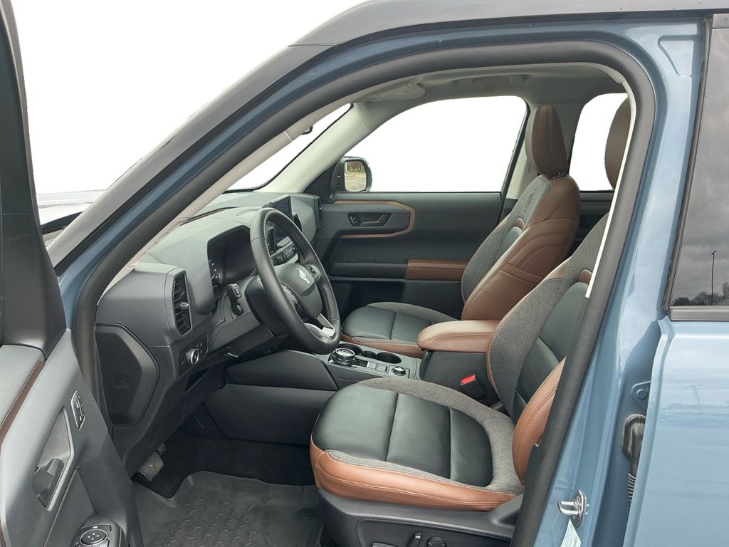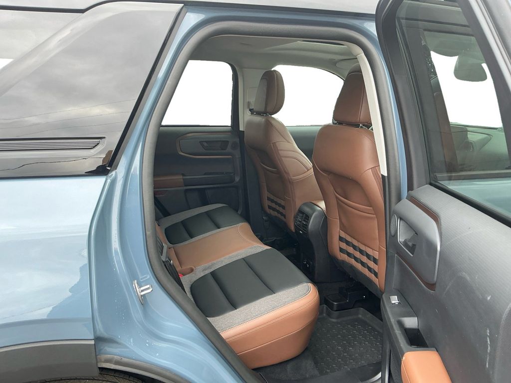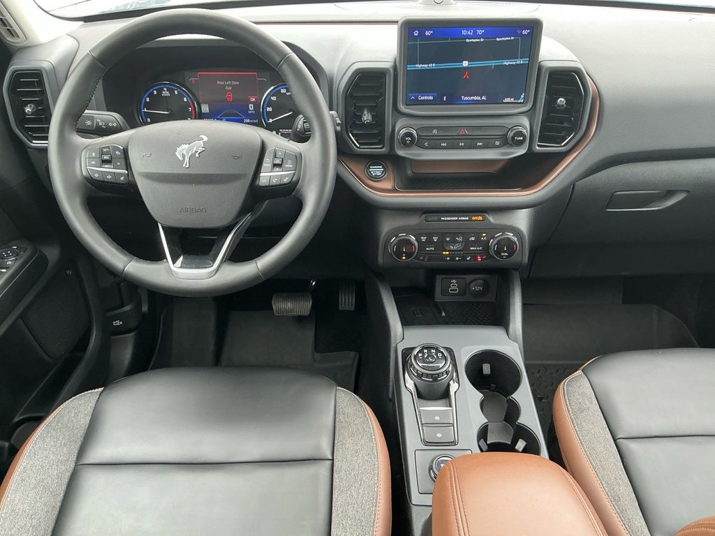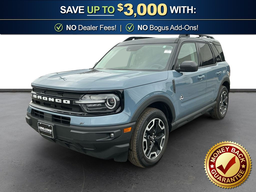 2024 Ford Bronco Sport Outer Banks Azure Gray Metallic Outer Banks 4WD 8-Speed Automatic 1.5L EcoBoost 3.80 Axle Ratio, 4-Wheel Disc Brakes, 6 Speakers, ABS brakes, Air Conditioning, Alloy wheels, AM/FM radio: SiriusXM, AM/FM Stereo, Auto High-beam Headlights, Auto-dimming Rear-View mirror, Automatic temperature control, Brake assist, Cargo Management System, Cargo Mat, Compass, Delay-off headlights, Driver door bin, Driver vanity mirror, Dual front impact airbags, Dual front side impact airbags, Electronic Stability Control, Emergency communication system: SYNC 3 911 Assist, Equipment Group 300A, Evasive Steering Assist, Ford Co-Pilot360 Assist+, Four wheel independent suspension, Front & Rear Floor Liners w/o Carpet Mats, Front anti-roll bar, Front Bucket Seats, Front Center Armrest, Front dual zone A/C, Front fog lights, Front License Plate Bracket, Front reading lights, Fully automatic headlights, HD Radio, Heated door mirrors, Heated front seats, Heated steering wheel, Illuminated entry, Intelligent Adaptive Cruise Control w/Stop & Go, Knee airbag, Low tire pressure warning, Memory seat, Occupant sensing airbag, Outside temperature display, Overhead airbag, Overhead console, Panic alarm, Passenger door bin, Passenger vanity mirror, Power door mirrors, Power driver seat, Power Moonroof, Power passenger seat, Power steering, Power windows, Premium-Trimmed Heated Sport Contour Bucket Seats, Radio data system, Rain sensing wipers, Rear anti-roll bar, Rear Parking Sensors, Rear reading lights, Rear seat center armrest, Rear window defroster, Rear window wiper, Remote keyless entry, Security system, SiriusXM, Speed control, Speed-sensing steering, Speed-Sensitive Wipers, Split folding rear seat, Steering wheel mounted audio controls, SYNC 3 Communications & Entertainment System, Tachometer, Tech Package, Telescoping steering wheel, Tilt steering wheel, Traction control, Trip computer, Universal Garage Door Opener (UGDO), Variably intermittent wipers, Voice-Activated Touchscreen Navigation System, Wheels: 18" Ebony Black-Painted Aluminum, Wireless Charging Pad.