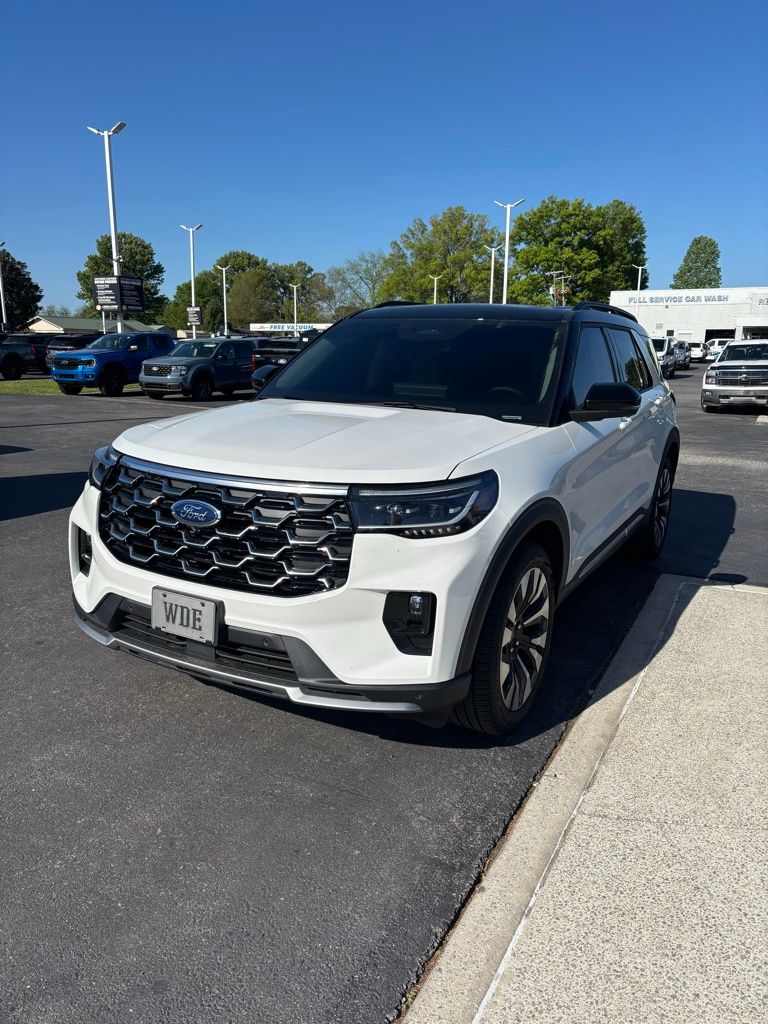 2026 Ford Explorer Platinum White Metallic Platinum 4WD 10-Speed Automatic 2.3L EcoBoost I-4 4WD, 14 Speakers, 3rd row seats: bench, 4-Wheel Disc Brakes, ABS brakes, ActiveX Trimmed Captain's Chairs, Air Conditioning, Alloy wheels, AM/FM radio: SiriusXM with 360L, Apple CarPlay/Android Auto, Auto High-beam Headlights, Auto-dimming door mirrors, Auto-dimming Rear-View mirror, Automatic temperature control, Black Painted Roof, BlueCruise Equipped (1-Time Purchase), Brake assist, Bumpers: body-color, Compass, Delay-off headlights, Driver door bin, Driver vanity mirror, Dual front impact airbags, Dual front side impact airbags, Electronic Stability Control, Emergency communication system: 911 Assist, Equipment Group 600A Standard Package, Exterior Parking Camera Rear, Four wheel independent suspension, Front and 2nd Rows Floor Liners with Carper Floor Mats, Front anti-roll bar, Front Bucket Seats, Front Center Armrest, Front dual zone A/C, Front fog lights, Front License Plate Bracket, Front reading lights, Fully automatic headlights, Garage door transmitter, Heated door mirrors, Heated front seats, Heated rear seats, Heated steering wheel, Illuminated entry, Knee airbag, Leather steering wheel, Low tire pressure warning, Lux Leather Package, Memory seat, Navigation System, Occupant sensing airbag, Outside temperature display, Overhead airbag, Overhead console, Panic alarm, Panoramic Fixed Glass Roof with Power Shade, Passenger door bin, Passenger vanity mirror, Platinum Badges on Front Row Seats, Power door mirrors, Power driver seat, Power Liftgate, Power passenger seat, Power steering, Power windows, Premium Leather Seating Surfaces Captain's Chairs, Quilting and Stitching on Door Panels, Quilting and Stitching on Seats, Radio data system, Radio: B&O Sound System by Bang & Olufsen with HD, Rain sensing wipers, Rear air conditioning, Rear anti-roll bar, Rear reading lights, Rear window defroster, Rear window wiper, Remote keyless entry, SecuriCode Keyless Entry Keypad, Security system, Speed control, Speed-sensing steering, Speed-Sensitive Wipers, Split folding rear seat, Spoiler, Steering wheel mounted audio controls, Tachometer, Telescoping steering wheel, Tilt steering wheel, Traction control, Trip computer, Turn signal indicator mirrors, Variably intermittent wipers, Ventilated front seats, Wheels: : 21" Bright Machined Aluminum w/Tarnish Dark Pockets, Wheels: 20" Luster Nickel-Painted Aluminum, 4WD.