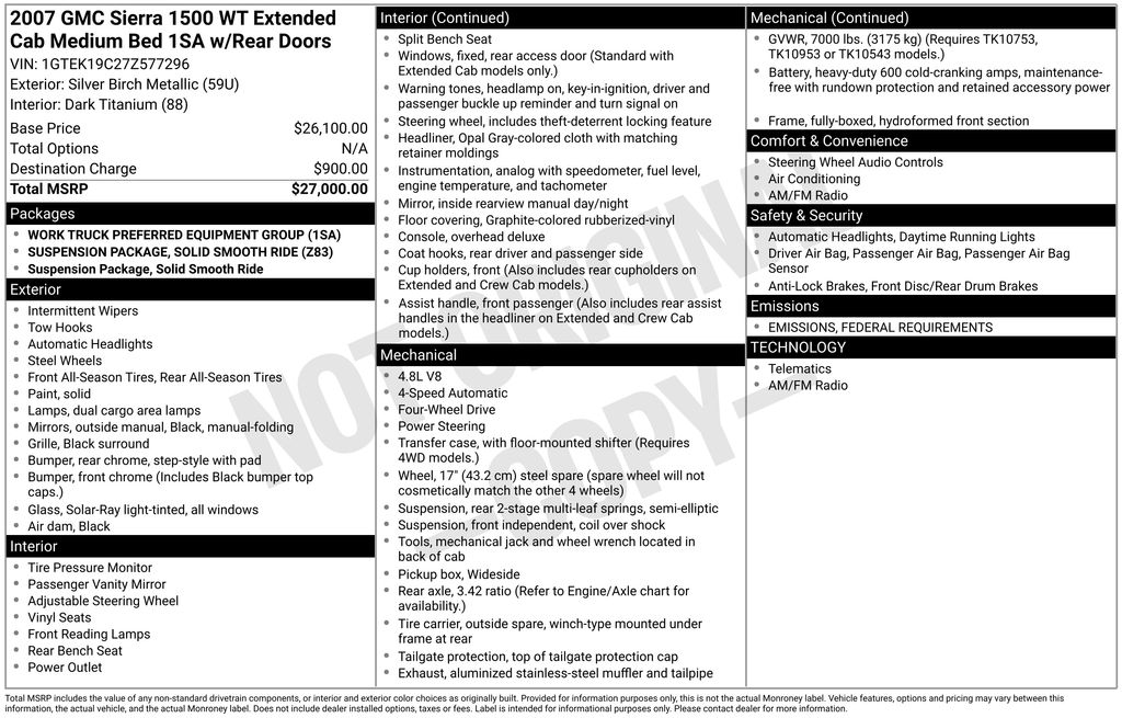 2007 GMC Sierra 1500 Work Truck Silver Birch Metallic Work Truck 4WD 4-Speed Automatic with Overdrive Vortec 4.8L V8 SFI Vortec 4.8L V8 SFI, 4-Speed Automatic with Overdrive, 4WD, Dark Titanium Vinyl, 17" x 7.5" 6-Lug Chrome-Styled Steel Wheels, 3.42 Rear Axle Ratio, 6 Speaker Audio System Feature, 6 Speakers, ABS brakes, Air Conditioning, AM/FM radio, Bumpers: chrome, Chrome Grille Surround, Color-Keyed Carpeting w/Rubberized Vinyl Floormats, Delay-off headlights, Driver-Side Manual Lumbar Control Seat Adjuster, Dual front impact airbags, Electric Rear-Window Defogger, Electronic Cruise Control w/Set & Resume Speed, Emergency communication system: OnStar, Front 40/20/40 Split-Bench Seat, Front anti-roll bar, Front Center Armrest w/Storage, Front Halogen Fog Lamps, Front reading lights, Front wheel independent suspension, Fully automatic headlights, Heavy-Duty Handling/Trailering Suspension Package, Low tire pressure warning, Occupant sensing airbag, Overhead console, Passenger vanity mirror, Power Door Locks, Power steering, Rear reading lights, Rear step bumper, Solar-Ray Deep-Tinted Glass, Spare Tire Lock, Tachometer, Tilt steering wheel, Variably intermittent wipers, Vortec 4.8L V8 SFI, 4-Speed Automatic with Overdrive, 4WD, Dark Titanium Vinyl.