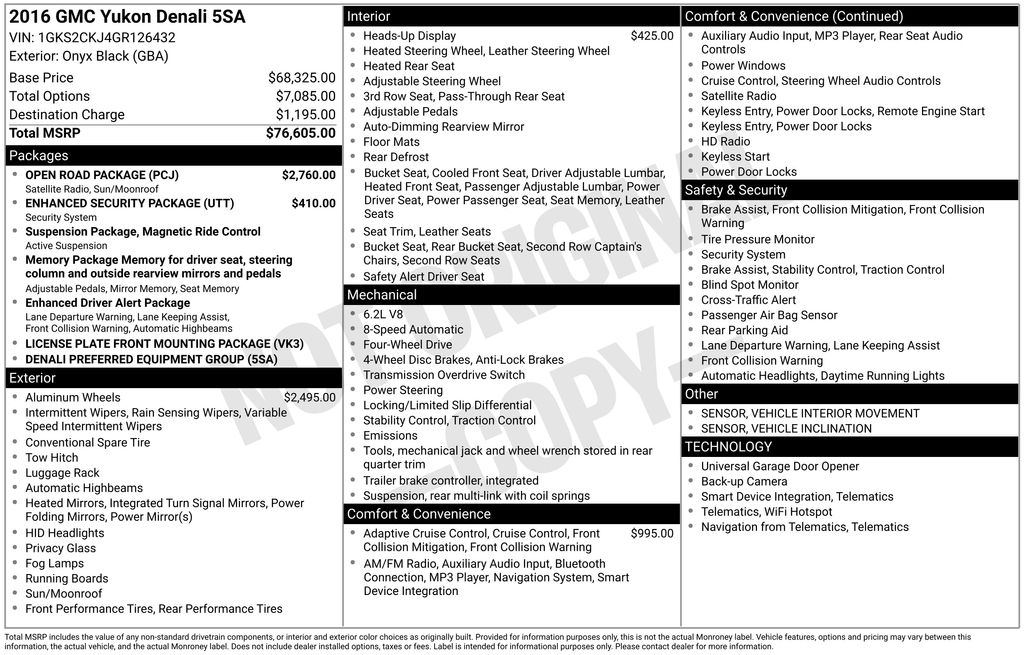 2016 GMC Yukon Denali Onyx Black Denali 4WD 8-Speed Automatic EcoTec3 6.2L V8 4WD, 10 Speakers, 17" Disc/Disc VAC Power Brakes, 3.23 Axle Ratio, 3rd row seats: split-bench, 4-Wheel Disc & 4-Wheel VAC Power Antilock Brakes, 4-Wheel Disc Brakes, 5 Auxiliary 12-volt Power Outlets, ABS brakes, Adaptive Cruise Control w/Front Automatic Braking, Adaptive suspension, Adjustable pedals, Air Conditioning, Alloy wheels, AM/FM radio: SiriusXM, AppLink/Apple CarPlay and Android Auto, Auto High-beam Headlights, Auto-dimming door mirrors, Auto-dimming Rear-View mirror, Automatic Collision Preparation, Automatic temperature control, Black Assist Steps w/Chrome Strip, Bodyside moldings, Bose Centerpoint Premium 10-Speaker Surround Sound, Brake assist, Bumpers: body-color, CD Player, CD player, Compass, Delay-off headlights, Driver door bin, Driver vanity mirror, Dual front impact airbags, Dual front side impact airbags, Electronic Stability Control, Emergency communication system: OnStar Guidance, Enhanced Driver Alert Package, Enhanced Security Package, Exterior Parking Camera Rear, Forward Collision Alert Sensor Indicator, Front anti-roll bar, Front Bucket Seats, Front Center Armrest, Front dual zone A/C, Front fog lights, Front reading lights, Front wheel independent suspension, Full-Feature Reclining Bucket Seats, Fully automatic headlights, Garage door transmitter, Genuine wood console insert, Genuine wood dashboard insert, Genuine wood door panel insert, Hands Free Power Liftgate, Head-Up Display, Heated & Cooled Driver & Front Passenger Seats, Heated door mirrors, Heated front seats, Heated Leather-Wrapped Steering Wheel, Heated rear seats, Heated steering wheel, High-Intensity Discharge Headlights, Illuminated entry, Inside Rear-View Auto-Dimming Mirror, Integrated Trailer Brake Controller, Intellibeam Automatic High Beam On/Off Headlamps, Lane Keep Assist, Leather Shift Knob, License Plate Front Mounting Package, Low tire pressure warning, Magnetic Ride Control Suspension Package, Memory Package, Memory seat, Navigation System, Occupant sensing airbag, OnStar Basic Plan For 5 Years, OnStar w/4G LTE, Open Road Package, Outside temperature display, Overhead airbag, Overhead console, Panic alarm, Passenger door bin, Passenger vanity mirror, Passive Entry System, Pedal memory, Perforated Leather-Appointed Seat Trim, Power door mirrors, Power driver seat, Power Liftgate, Power passenger seat, Power Release Second Row Bucket Seats, Power steering, Power Tilt & Telescopic Steering Column, Power Tilt-Sliding Sunroof w/Express-Open/Close, Power windows, Power-Adjustable Pedals For Accelerator & Brake, Preferred Equipment Group 5SA, Premium audio system: IntelliLink, Push Button Keyless Start, Radio: AM/FM w/Navigation, Rain sensing wipers, Rear air conditioning, Rear anti-roll bar, Rear Cross-Traffic Alert, Rear reading lights, Rear Seat Blu-Ray/DVD Entertainment System, Rear window defroster, Rear window wiper, Remote Keyless Entry, Remote keyless entry, Roof rack: rails only, Safety Alert Driver Seat, Security system, Side Blind Zone Alert w/Lane Change Alert, SiriusXM Satellite Radio, Speed control, Speed-sensing steering, Split folding rear seat, Spoiler, Steering wheel memory, Steering wheel mounted audio controls, Tachometer, Telescoping steering wheel, Theft-Deterrent Alarm System, Tilt steering wheel, Traction control, Trip computer, Turn signal indicator mirrors, Unauthorized Entry Electrical Theft Deterrent Sys., Universal Home Remote, Variably intermittent wipers, Vehicle Inclination Sensor, Vehicle Interior Movement Sensor, Ventilated front seats, Voltmeter, Wheels: 20" x 9" Ultra Bright Machined Aluminum, Wheels: 22" x 8.5" Aluminum w/Chrome Inserts, Wireless Charging, 4WD.