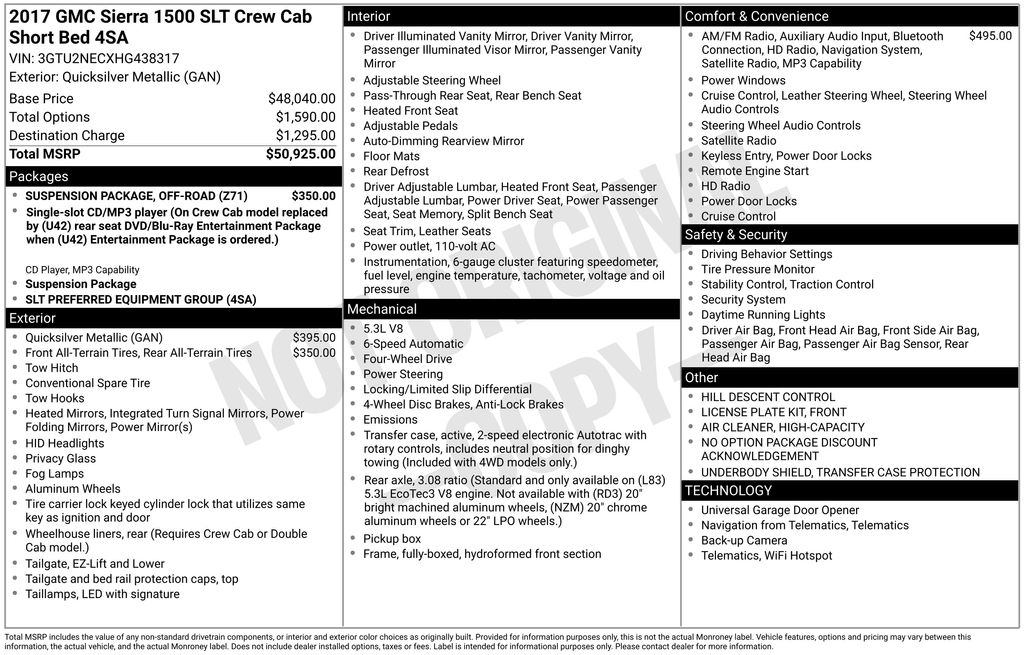 2017 GMC Sierra 1500 SLT Quicksilver Metallic SLT 4WD 6-Speed Automatic Electronic with Overdrive EcoTec3 5.3L V8 6-Speed Automatic Electronic with Overdrive, 4WD, Black Leather, 10-Way Power Driver's Seat Adjuster, 110-Volt AC Power Outlet, 150 Amp Alternator, 1st & 2nd Row Color-Keyed Carpeted Floor Mats, 2-Speed Active Electronic AutoTrac Transfer Case, 4-Wheel Disc Brakes, 4.2" Diagonal Color Display Driver Info Center, 40/20/40 Front Split Bench Seat, 6 Speakers, 6-Speaker Audio System, ABS brakes, Adjustable pedals, Air Conditioning, Alloy wheels, AM/FM radio, Auto-dimming door mirrors, Auto-Dimming Inside Rear-View Mirror, Auto-dimming Rear-View mirror, Automatic temperature control, Auxiliary External Transmission Oil Cooler, Bodyside moldings, Brake assist, Bumpers: chrome, CD player, Chrome Bodyside Moldings, Chrome Door Handles, Chrome Mirror Caps, Color-Keyed Carpeting, Compass, Deep-Tinted Glass, Delay-off headlights, Driver & Front Passenger Illuminated Vanity Mirrors, Driver door bin, Driver vanity mirror, Dual front impact airbags, Dual front side impact airbags, Dual-Zone Automatic Climate Control, Electric Rear-Window Defogger, Electronic Stability Control, Emergency communication system: OnStar Guidance, Exterior Parking Camera Rear, EZ Lift & Lower Tailgate, Front anti-roll bar, Front Center Armrest w/Storage, Front dual zone A/C, Front fog lights, Front Frame-Mounted Black Recovery Hooks, Front License Plate Kit, Front reading lights, Front wheel independent suspension, Fully automatic headlights, Garage door transmitter: HomeLink, HD Radio, Heated door mirrors, Heated Driver & Front Passenger Seats, Heated front seats, Heavy Duty Suspension, Heavy-Duty Rear Locking Differential, High-Intensity Discharge Headlights, Hill Descent Control, Illuminated entry, Leather Appointed Seat Trim, Leather Wrapped Steering Wheel w/Cruise Controls, LED Cargo Box Lighting, LED Tailamps w/Signature, Low tire pressure warning, Manual Tilt/Telescoping Steering Column, Memory seat, Occupant sensing airbag, Off-Road Suspension Package, OnStar 3 Month Guidance Plan, OnStar w/4G LTE, Outside temperature display, Overhead airbag, Overhead console, Panic alarm, Passenger door bin, Passenger vanity mirror, Power Adjustable Pedals, Power door mirrors, Power driver seat, Power Folding & Adjustable Heated Outside Mirrors, Power passenger seat, Power steering, Power windows, Power Windows w/Driver Express Up & Down, Preferred Equipment Group 4SA, Radio data system, Radio: AM/FM Stereo w/8" Diagonal Color Touch Nav., Radio: AM/FM Stereo w/8" Diagonal Color Touch Screen, Rear 60/40 Folding Bench Seat (Folds Up), Rear reading lights, Rear seat center armrest, Rear step bumper, Rear Vision Camera, Rear Wheelhouse Liners, Rear window defroster, Remote Keyless Entry, Remote keyless entry, Remote Vehicle Starter System, Security system, Single Slot CD/MP3 Player, SiriusXM Satellite Radio, Speed control, Speed-sensing steering, Split folding rear seat, Steering Wheel Audio Controls, Steering wheel mounted audio controls, Tachometer, Telescoping steering wheel, Theft Deterrent System (Unauthorized Entry), Thin Profile LED Fog Lamps, Tilt steering wheel, Traction control, Trailering Equipment, Trip computer, Turn signal indicator mirrors, Universal Home Remote, Variably intermittent wipers, Voltmeter, Wheels: 18" x 8.5" Polished Aluminum, 6-Speed Automatic Electronic with Overdrive, 4WD, Black Leather.