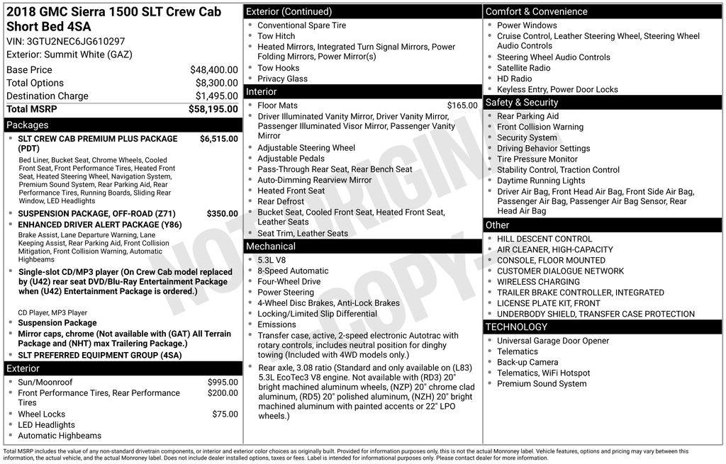 2018 GMC Sierra 1500 SLT Summit White SLT 4WD 8-Speed Automatic with Overdrive EcoTec3 5.3L V8 8-Speed Automatic with Overdrive, 4WD, Cocoa/Dune Leather, 10-Way Power Driver's Seat Adjuster, 110-Volt AC Power Outlet, 150 Amp Alternator, 1st & 2nd Row Color-Keyed Carpeted Floor Mats, 2-Speed Active Electronic AutoTrac Transfer Case, 20" x 9" Chrome Clad Aluminum Wheels, 4-Wheel Disc Brakes, 4.2" Diagonal Color Display Driver Info Center, 40/20/40 Front Split Bench Seat, 6 Speakers, 6-Speaker Audio System, 6" Rectangular Chromed Tubular Assist Steps, ABS brakes, Adjustable pedals, Air Conditioning, Alloy wheels, AM/FM radio: SiriusXM, Auto-dimming door mirrors, Auto-Dimming Inside Rear-View Mirror, Auto-dimming Rear-View mirror, Automatic temperature control, Auxiliary External Transmission Oil Cooler, Bodyside moldings, Bose Speaker System, Brake assist, Bumpers: chrome, CD player, Chrome Bodyside Moldings, Chrome Door Handles, Chrome Mirror Caps, Color-Keyed Carpeting, Compass, Deep-Tinted Glass, Delay-off headlights, Driver & Front Passenger Illuminated Vanity Mirrors, Driver door bin, Driver vanity mirror, Dual front impact airbags, Dual front side impact airbags, Dual-Zone Automatic Climate Control, Electric Rear-Window Defogger, Electronic Stability Control, Enhanced Driver Alert Package, Exterior Parking Camera Rear, EZ Lift & Lower Tailgate, Floor Mounted Console, Forward Collision Alert, Front & Rear All-Weather Floor Mats, Front anti-roll bar, Front Center Armrest w/Storage, Front dual zone A/C, Front fog lights, Front Frame-Mounted Black Recovery Hooks, Front Full Feature Power Reclining Bucket Seats, Front License Plate Kit, Front reading lights, Front wheel independent suspension, Fully automatic headlights, Garage door transmitter, GMC 4G LTE, GMC Connected Access, HD Radio, Heated & Ventilated Front Bucket Seats, Heated door mirrors, Heated Driver & Front Passenger Seats, Heated front seats, Heavy Duty Suspension, Heavy-Duty Rear Locking Differential, High-Intensity Discharge Headlights, High-Performance LED Headlamps, Hill Descent Control, Illuminated entry, Integrated Trailer Brake Controller, IntelliBeam Automatic High Beam On/Off Headlight, Lane Keep Assist, Leather Appointed Seat Trim, Leather Wrapped Heated Steering Wheel, Leather Wrapped Steering Wheel w/Cruise Controls, LED Cargo Box Lighting, LED Tailamps w/Signature, Low Speed Forward Automatic Braking, Low tire pressure warning, Manual Tilt/Telescoping Steering Column, Memory seat, Occupant sensing airbag, Off-Road Suspension Package, OnStar & GMC Connected Services Capable, Outside temperature display, Overhead airbag, Overhead console, Panic alarm, Passenger door bin, Passenger vanity mirror, Power Adjustable Pedals, Power door mirrors, Power driver seat, Power Folding & Adjustable Heated Outside Mirrors, Power passenger seat, Power Sliding Rear Window w/Defogger, Power steering, Power Sunroof, Power windows, Power Windows w/Driver Express Up & Down, Preferred Equipment Group 4SA, Premium audio system: GMC Infotainment System, Radio data system, Radio: AM/FM/GMC Infotainment & Navigation, Radio: AM/FM/GMC Infotainment System, Rear 60/40 Folding Bench Seat (Folds Up), Rear reading lights, Rear seat center armrest, Rear step bumper, Rear Wheelhouse Liners, Rear window defroster, Remote Keyless Entry, Remote keyless entry, Remote Locking Tailgate, Remote Vehicle Starter System, Security system, Single Slot CD/MP3 Player, SiriusXM Satellite Radio, SLT Crew Cab Premium Plus Package, Speed control, Speed-sensing steering, Split folding rear seat, Spray-On Pickup Box Bed Liner w/GMC Logo, Steering Wheel Audio Controls, Steering wheel mounted audio controls, Tachometer, Telescoping steering wheel, Theft Deterrent System (Unauthorized Entry), Thin Profile LED Fog Lamps, Tilt steering wheel, Traction control, Trailering Equipment, Trip computer, Turn signal indicator mirrors, Ultrasonic Front & Rear Park Assist, Universal Home Remote, Variably intermittent wipe