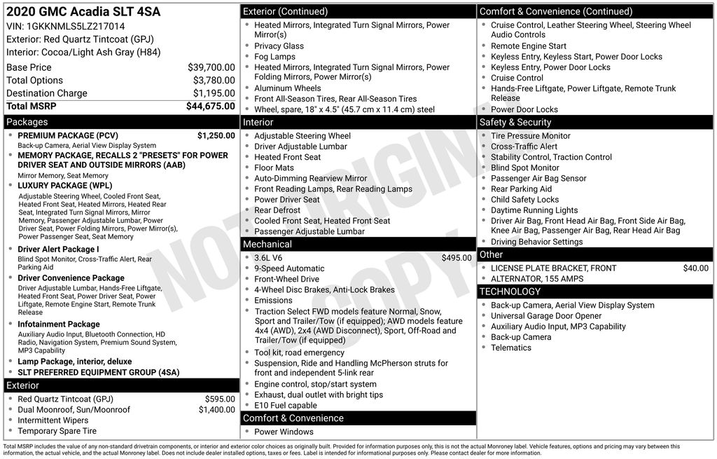 2020 GMC Acadia SLT Red Quartz Tintcoat SLT FWD 9-Speed Automatic 3.6L V6 SIDI FWD, Cocoa/Light Ash Gray Leather, 155 Amp Alternator, 18" Machined Aluminum Wheels, 3rd row seats: split-bench, 4-Way Manual Passenger Seat Adjuster, 4-Wheel Disc Brakes, 6 Speakers, 6-Passenger (2-2-2 Seating Configuration), 6-Speaker Audio System Feature, 8-Way Power Driver Seat Adjuster, 8-Way Power Passenger Seat Adjuster, ABS brakes, Air Conditioning, Alloy wheels, AM/FM radio: SiriusXM, Apple CarPlay/Android Auto, Auto-dimming door mirrors, Auto-dimming Rear-View mirror, Automatic temperature control, Brake assist, Bumpers: body-color, Compass, Delay-off headlights, Driver door bin, Driver vanity mirror, Dual front impact airbags, Dual front side impact airbags, Dual SkyScape 2-Panel Power Sunroof, Electronic Stability Control, Emergency communication system: OnStar and GMC connected services capable, Four wheel independent suspension, Front anti-roll bar, Front Bucket Seats, Front Center Armrest, Front dual zone A/C, Front fog lights, Front License Plate Bracket, Front reading lights, Fully automatic headlights, Garage door transmitter, HD Surround Vision, Heated & Ventilated Driver & Front Passenger Seats, Heated door mirrors, Heated Driver & Front Passenger Seats, Heated front seats, Heated Rear Outboard Seating Positions, Illuminated entry, Knee airbag, Low tire pressure warning, Luxury Package, Memory Package, Occupant sensing airbag, Outside temperature display, Overhead airbag, Overhead console, Panic alarm, Passenger door bin, Passenger vanity mirror, Perforated Leather-Appointed Seat Trim, Power door mirrors, Power Driver Lumbar Control Seat Adjuster, Power driver seat, Power Liftgate, Power Passenger Lumbar Control Seat Adjuster, Power steering, Power Tilt & Telescopic Steering Column, Power windows, Power-Adjustable Body-Color Outside Heated Mirrors, Preferred Equipment Group 4SA, Premium audio system: GMC Infotainment System, Premium Package, Radio data system, Radio: AM/FM 8" Diagonal Multi-Touch Nav (DISC), Radio: AM/FM 8" Diagonal Multi-Touch Navigation, Rear air conditioning, Rear anti-roll bar, Rear reading lights, Rear window defroster, Rear window wiper, Remote keyless entry, Roof rack: rails only, Security system, SiriusXM Radio, SiriusXM w/360L, Speed control, Speed-sensing steering, Spoiler, Steering wheel mounted audio controls, Tachometer, Telescoping steering wheel, Tilt steering wheel, Traction control, Trip computer, Turn signal indicator mirrors, Variably intermittent wipers, Voltmeter, FWD, Cocoa/Light Ash Gray Leather.