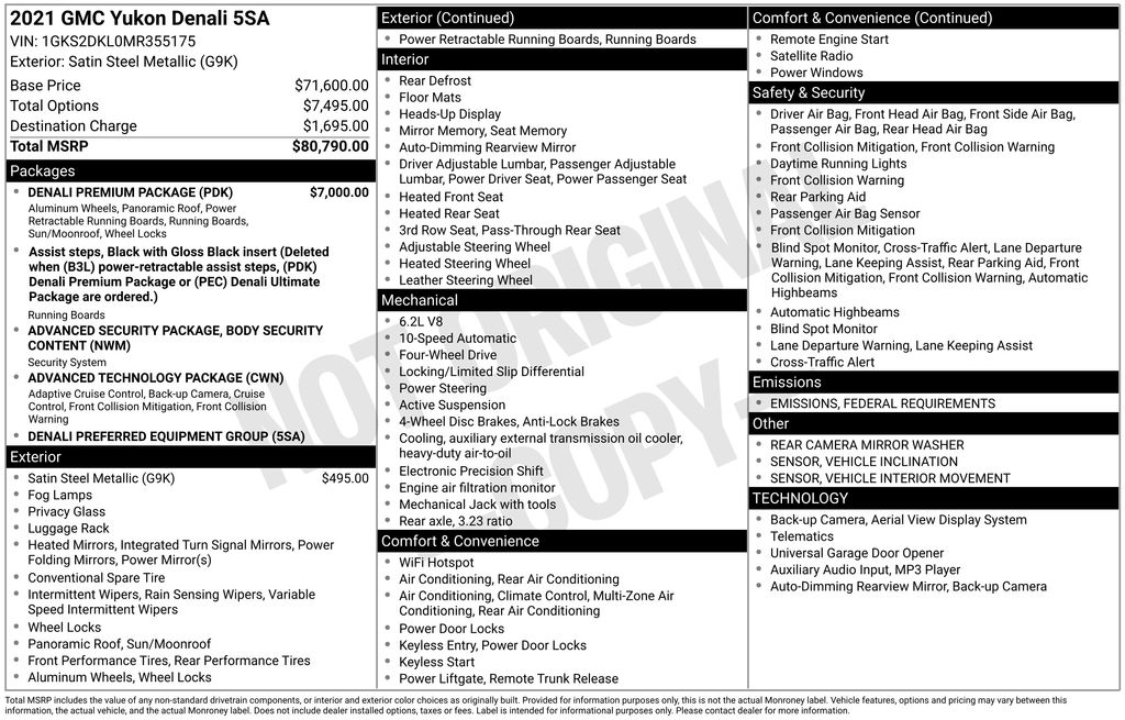 2021 GMC Yukon Denali Satin Steel Metallic Denali 4WD 10-Speed Automatic with Overdrive EcoTec3 6.2L V8 4WD, 12-Way Power Seat Adjusters, 14 Speakers, 15" Diagonal Multi-Color Head-Up Display, 2 Presets For Outside Rearview Mirrors, 3.23 Rear Axle Ratio, 3rd Row 60/40 Power-Folding Split-Bench Seat, 3rd row seats: split-bench, 4-Wheel Disc Brakes, ABS brakes, Adaptive Cruise Control, Adaptive suspension, Advanced Security Package, Advanced Technology Package, Air Conditioning, Alloy wheels, AM/FM radio: SiriusXM with 360L, Apple CarPlay/Android Auto, Auto High-beam Headlights, Auto-dimming door mirrors, Auto-dimming Rear-View mirror, Auto-leveling suspension, Automatic Emergency Braking, Automatic temperature control, Bodyside moldings, Bose 14-Speaker Surround w/CenterPoint, Brake assist, Bright Front & Rear Door Sill Plates, Bumpers: body-color, Chrome Door Handles w/Body-Color Strip, Compass, Delay-off headlights, Denali Premium Package, Driver door bin, Driver vanity mirror, Dual Exhaust System, Dual front impact airbags, Dual front side impact airbags, Dual-Pane Panoramic Power Sunroof, Electronic Stability Control, Emergency communication system: OnStar and GMC connected services capable, Enhanced Automatic Emergency Braking, Following Distance Indicator, Forward Collision Alert, Four wheel independent suspension, Front & Rear Park Assist, Front anti-roll bar, Front Bucket Seats, Front Center Armrest, Front dual zone A/C, Front fog lights, Front Pedestrian Braking, Front reading lights, Fully automatic headlights, Galvano Bodyside Moldings, Garage door transmitter, Glass Breakage Sensor, Hands-Free Power Programmable Rear Liftgate, HD Radio, HD Surround Vision, Heads-Up Display, Heated & Ventilated Driver & Front Passenger Seats, Heated 2nd Row Outboard Position Seats, Heated Automatic Steering Wheel, Heated door mirrors, Heated Driver & Front Passenger Seats, Heated front seats, Heated rear seats, Heated steering wheel, Hill Descent Control, Illuminated entry, Inside Rear-View Auto-Dimming Mirror, Inside Rearview Auto-Dimming Rear Camera Mirror, IntelliBeam Automatic High Beam On/Off, Lane Change Alert w/Side Blind Zone Alert, Lane Keep Assist w/Lane Departure Warning, Leather steering wheel, Low tire pressure warning, Magnetic Ride Control Suspension, Memory seat, Navigation System, Occupant sensing airbag, Outside Heated Power-Adjustable Mirrors, Outside temperature display, Overhead airbag, Overhead console, Panic alarm, Passenger door bin, Passenger vanity mirror, Perforated Leather Seating Surfaces, Power door mirrors, Power driver seat, Power Liftgate, Power passenger seat, Power Release 2nd Row Bucket Seats, Power steering, Power Tilt & Telescopic Steering Column, Power windows, Power-Retractable Assist Steps, Preferred Equipment Group 5SA, Radio: AM/FM/SiriusXM w/Navigation, Rain sensing wipers, Rear air conditioning, Rear anti-roll bar, Rear Camera Mirror Washer, Rear Cross Traffic Alert, Rear Pedestrian Alert, Rear reading lights, Rear window defroster, Rear window wiper, Remote keyless entry, Roof rack: rails only, Safety Alert Seat, Security system, SiriusXM w/360L, Speed control, Speed-sensing steering, Split folding rear seat, Spoiler, Steering wheel memory, Steering wheel mounted audio controls, Tachometer, Telescoping steering wheel, Theft-Deterrent Alarm System, Tilt steering wheel, Traction control, Trip computer, Turn signal indicator mirrors, Universal Home Remote, Variably intermittent wipers, Vehicle Inclination Sensor, Vehicle Interior Movement Sensor, Ventilated front seats, Voltmeter, Wheel Locks, Wheels: 20" x 9" 6-Spoke Polished Aluminum, Wheels: 22" x 9" Bright Machined Aluminum, 4WD.