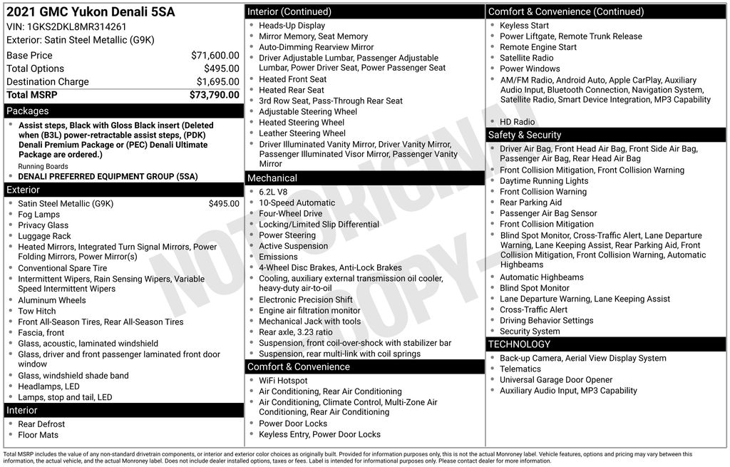 2021 GMC Yukon Denali Satin Steel Metallic Denali 4WD 10-Speed Automatic with Overdrive EcoTec3 6.2L V8 4WD, 12-Way Power Seat Adjusters, 14 Speakers, 15" Diagonal Multi-Color Head-Up Display, 2 Presets For Outside Rearview Mirrors, 3.23 Rear Axle Ratio, 3rd Row 60/40 Power-Folding Split-Bench Seat, 3rd row seats: split-bench, 4-Wheel Disc Brakes, ABS brakes, Adaptive suspension, Air Conditioning, Alloy wheels, AM/FM radio: SiriusXM with 360L, Apple CarPlay/Android Auto, Auto High-beam Headlights, Auto-dimming door mirrors, Auto-dimming Rear-View mirror, Auto-leveling suspension, Automatic Emergency Braking, Automatic temperature control, Bodyside moldings, Bose 14-Speaker Surround w/CenterPoint, Brake assist, Bright Front & Rear Door Sill Plates, Bumpers: body-color, Chrome Door Handles w/Body-Color Strip, Compass, Delay-off headlights, Driver door bin, Driver vanity mirror, Dual Exhaust System, Dual front impact airbags, Dual front side impact airbags, Electronic Stability Control, Emergency communication system: OnStar and GMC connected services capable, Following Distance Indicator, Forward Collision Alert, Four wheel independent suspension, Front & Rear Park Assist, Front anti-roll bar, Front Bucket Seats, Front Center Armrest, Front dual zone A/C, Front fog lights, Front Pedestrian Braking, Front reading lights, Fully automatic headlights, Galvano Bodyside Moldings, Garage door transmitter, Hands-Free Power Programmable Rear Liftgate, HD Radio, HD Surround Vision, Heads-Up Display, Heated & Ventilated Driver & Front Passenger Seats, Heated 2nd Row Outboard Position Seats, Heated Automatic Steering Wheel, Heated door mirrors, Heated Driver & Front Passenger Seats, Heated front seats, Heated rear seats, Heated steering wheel, Hill Descent Control, Illuminated entry, Inside Rear-View Auto-Dimming Mirror, IntelliBeam Automatic High Beam On/Off, Lane Change Alert w/Side Blind Zone Alert, Lane Keep Assist w/Lane Departure Warning, Leather steering wheel, Low tire pressure warning, Magnetic Ride Control Suspension, Memory seat, Navigation System, Occupant sensing airbag, Outside Heated Power-Adjustable Mirrors, Outside temperature display, Overhead airbag, Overhead console, Panic alarm, Passenger door bin, Passenger vanity mirror, Perforated Leather Seating Surfaces, Power door mirrors, Power driver seat, Power Liftgate, Power passenger seat, Power Release 2nd Row Bucket Seats, Power steering, Power Tilt & Telescopic Steering Column, Power windows, Preferred Equipment Group 5SA, Radio: AM/FM/SiriusXM w/Navigation, Rain sensing wipers, Rear air conditioning, Rear anti-roll bar, Rear Cross Traffic Alert, Rear Pedestrian Alert, Rear reading lights, Rear window defroster, Rear window wiper, Remote keyless entry, Roof rack: rails only, Safety Alert Seat, Security system, SiriusXM w/360L, Speed control, Speed-sensing steering, Split folding rear seat, Spoiler, Steering wheel memory, Steering wheel mounted audio controls, Tachometer, Telescoping steering wheel, Tilt steering wheel, Traction control, Trip computer, Turn signal indicator mirrors, Universal Home Remote, Variably intermittent wipers, Ventilated front seats, Voltmeter, Wheels: 20" x 9" 6-Spoke Polished Aluminum, 4WD.
