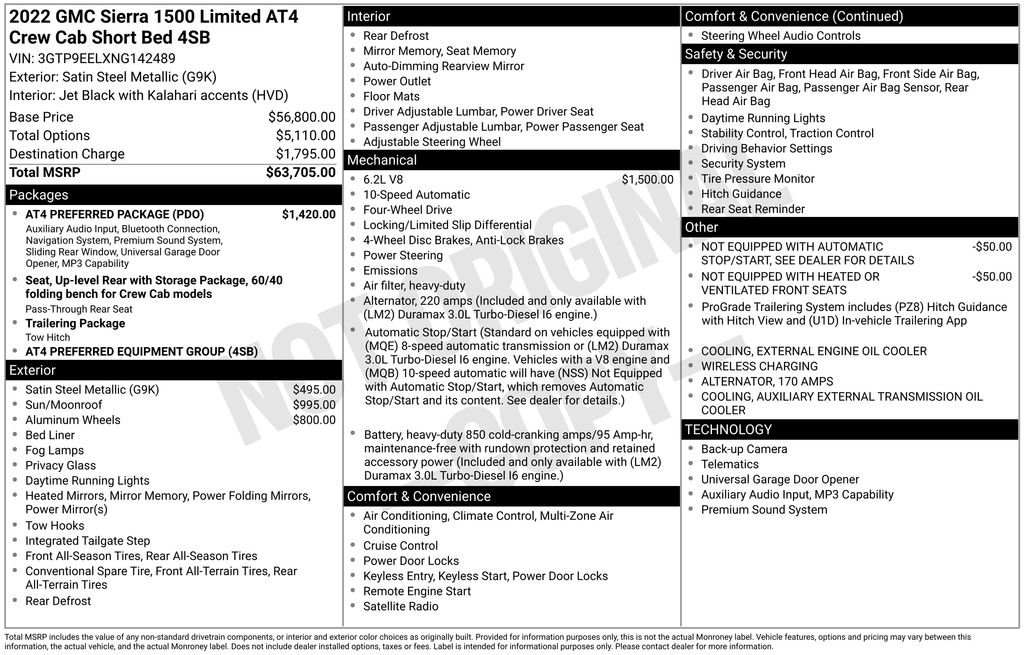 2022 GMC Sierra 1500 Limited AT4 Satin Steel Metallic AT4 4WD 10-Speed Automatic EcoTec3 6.2L V8 10-Way Power Driver Seat Adjuster w/Lumbar, 10-Way Power Passenger Seat Adjuster w/Lumbar, 12-Volt Rear Auxiliary Power Outlet, 120-Volt Bed Mounted Power Outlet, 120-Volt Instrument Panel Power Outlet, 170 Amp Alternator, 18" x 8.5" Machined Aluminum Wheels, 2 USB Ports, 2 USB Ports (1st Row), 220 Amp Alternator, 3.23 Rear Axle Ratio, 4-Wheel Disc Brakes, 4.2" Diagonal Color Display Driver Info Center, 6 Speakers, 6-Speaker Audio System Feature, ABS brakes, Air Conditioning, Alloy wheels, AM/FM radio: SiriusXM with 360L, Apple CarPlay/Android Auto, AT4 Preferred Package, Auto-dimming door mirrors, Auto-dimming Rear-View mirror, Auto-Locking Rear Differential, Automatic temperature control, Auxiliary External Transmission Oil Cooler, Block heater, Body-Color Surround Grille, Brake assist, Bumpers: body-color, Color-Keyed Carpeting Floor Covering, Compass, Deep-Tinted Glass, Delay-off headlights, Driver door bin, Driver Memory, Driver vanity mirror, Dual front impact airbags, Dual front side impact airbags, Electric Rear-Window Defogger, Electronic Stability Control, Engine Block Heater, External Engine Oil Cooling, Floor-Mounted Center Console, Front anti-roll bar, Front Bucket Seats, Front Center Armrest, Front dual zone A/C, Front fog lights, Front Prem Floor Liners w/Removable Carpet Insert, Front reading lights, Front wheel independent suspension, Fully automatic headlights, GMC Connected Access Capable, HD Rear Vision Camera, Heated door mirrors, Heated Driver & Front Outboard Passenger Seating, Heated front seats, Heated Steering Wheel, Heated steering wheel, Heavy-Duty Air Filter, Hill Descent Control, Hitch Guidance, Hitch Guidance w/Hitch View, Illuminated entry, In-Vehicle Trailering App, Integrated Trailer Brake Controller, Keyless Open & Start, LED Cargo Area Lighting, Low tire pressure warning, Manual Tilt-Wheel & Telescoping Steering Column, Memory seat, Not Equipped w/Automatic Stop/Start, Not Equipped w/Heated/Ventilated Front Seats, Occupant sensing airbag, Off-Road Suspension, OnStar & GMC Connected Services Capable, Outside temperature display, Overhead airbag, Overhead console, Panic alarm, Passenger door bin, Passenger vanity mirror, Perforated Front Leather Seat Trim, Power Door Locks, Power door mirrors, Power driver seat, Power Front Passenger Windows w/Express Up/Down, Power Front Windows w/Driver Express Up/Down, Power passenger seat, Power Rear Windows w/Express Down, Power Sliding Rear Window w/Rear Defogger, Power steering, Power Sunroof, Power windows, Preferred Equipment Group 4SB, Premium audio system: Premium GMC Infotainment System, Premium Bose 7-Speaker Sound System, ProGrade Trailering System, Radio data system, Radio: Premium GMC Infotainment Sys w/Multi-Touch, Radio: Premium GMC Infotainment Sys w/Navigation, Rear Dual USB Charging-Only Ports, Rear Prem Floor Liners w/Removable Carpet Insert, Rear reading lights, Rear seat center armrest, Rear step bumper, Rear Wheelhouse Liners, Rear window defroster, Red Recovery Hooks, Remote keyless entry, Remote Vehicle Starter System, Security system, SiriusXM w/360L, Speed control, Speed-sensing steering, Split folding rear seat, Spray-On Pickup Bed Liner w/AT4 Logo, Steering Wheel Audio Controls, Steering wheel mounted audio controls, Tachometer, Telescoping steering wheel, Theft Deterrent System (Unauthorized Entry), Tilt steering wheel, Traction control, Trailering Package, Trip computer, Universal Home Remote, Variably intermittent wipers, Ventilated Driver & Front Passenger Seats, Ventilated front seats, Voltmeter, Wheels: 20" x 9" Machined Aluminum, Wi-Fi Hotspot Capable, Wireless Charging.
