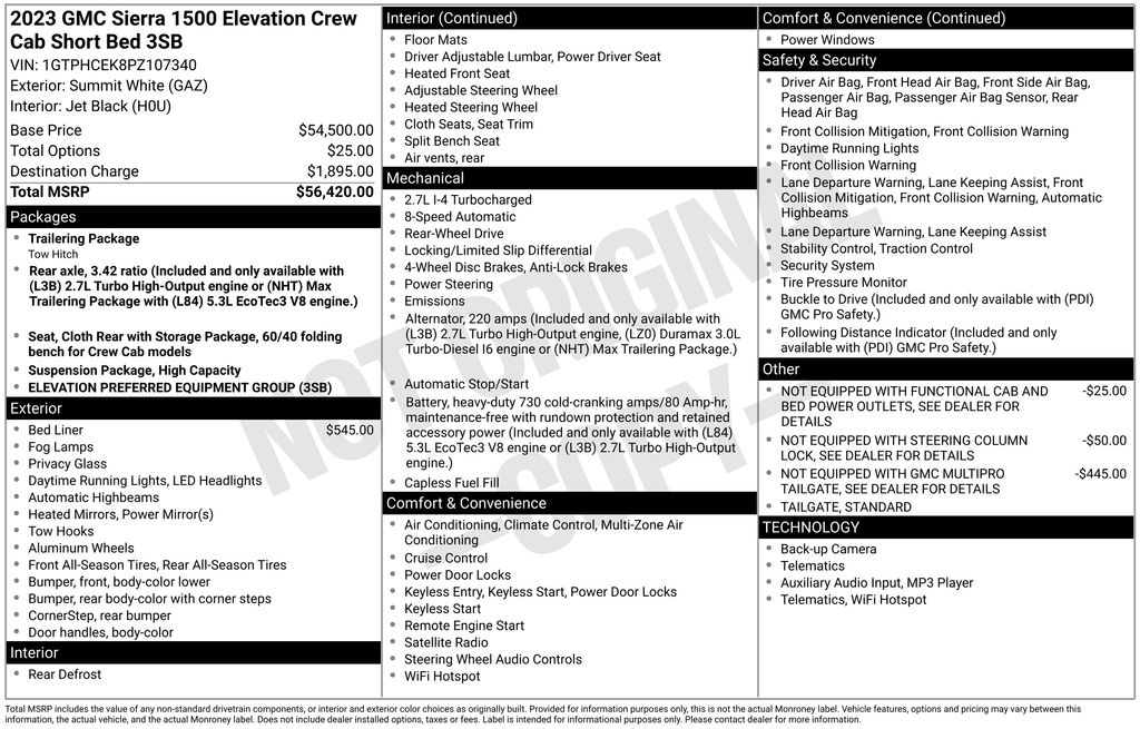 2023 GMC Sierra 1500 Elevation Summit White Elevation RWD 8-Speed Automatic 2.7L I4 Turbocharged DOHC 16V LEV3-ULEV50 310hp 8-Speed Automatic, Black Cloth, 10-Way Power Driver Seat Adjuster w/Lumbar, 120-Volt Bed Mounted Power Outlet, 120-Volt Instrument Panel Power Outlet, 2 Charge/Data USB Ports, 2 Type-C Charge-Only Rear USB Ports, 220 Amp Alternator, 4-Way Manual Passenger Seat Adjuster, 4-Wheel Disc Brakes, 6 Speakers, 6-Speaker Audio System Feature, ABS brakes, Air Conditioning, Alloy wheels, AM/FM radio, Apple CarPlay/Android Auto, Auto High-beam Headlights, Auto-Locking Rear Differential, Automatic Emergency Braking, Automatic temperature control, Body Color Header w/Gloss Black Mesh Grille Bars, Brake assist, Buckle to Drive, Bumpers: body-color, Cloth Rear Seat w/Storage Package, Cloth Seat Trim, Color-Keyed Carpeting Floor Covering, Compass, Deep-Tinted Glass, Delay-off headlights, Driver door bin, Driver vanity mirror, Dual front impact airbags, Dual front side impact airbags, Electric Rear-Window Defogger, Electrical Steering Column Lock, Electronic Stability Control, Emergency communication system: OnStar and GMC connected services capable, Following Distance Indicator, Forward Collision Alert, Front 40/20/40 Split-Bench Seat, Front anti-roll bar, Front Center Armrest w/Storage, Front dual zone A/C, Front fog lights, Front Frame-Mounted Black Recovery Hooks, Front Pedestrian Braking, Front reading lights, Front Rubberized-Vinyl Floor Mats, Front wheel independent suspension, Fully automatic headlights, GMC Connected Access Capable, HD Rear Vision Camera, Heated door mirrors, Heated Driver & Front Outboard Passenger Seating, Heated front seats, Heated steering wheel, High Capacity Suspension Package, Hitch Guidance, Illuminated entry, IntelliBeam Automatic High Beam On/Off, Keyless Open & Start, Lane Keep Assist w/Lane Departure Warning, LED Cargo Area Lighting, Low tire pressure warning, Manual Tilt-Wheel & Telescoping Steering Column, Navigation System, Not Equipped w/Functional Cab & Bed Power Outlets, Not Equipped w/Steering Column Lock, Not Equipped with GMC MultiPro Tailgate, Occupant sensing airbag, OnStar & GMC Connected Services Capable, Outside temperature display, Overhead airbag, Overhead console, Panic alarm, Passenger door bin, Passenger vanity mirror, Power Door Locks, Power door mirrors, Power driver seat, Power Front Windows w/Driver Express Up/Down, Power Front Windows w/Passenger Express Down, Power Rear Windows w/Express Down, Power steering, Power windows, Preferred Equipment Group 3SB, Premium audio system: GMC Infotainment System, Push Button Start, Radio data system, Radio: Premium GMC Infotainment Audio System, Rear reading lights, Rear Rubberized-Vinyl Floor Mats, Rear seat center armrest, Rear step bumper, Rear window defroster, Remote keyless entry, Remote Vehicle Starter System, Security system, SiriusXM w/360L, Speed control, Speed-sensing steering, Split folding rear seat, Spray-On Pickup Bed Liner w/GMC Logo, Standard Tailgate, Steering Wheel Audio Controls, Steering wheel mounted audio controls, Tachometer, Telescoping steering wheel, Theft Deterrent System (Unauthorized Entry), Tilt steering wheel, Traction control, Trailering Package, Trip computer, Variably intermittent wipers, Voltmeter, Wheels: 20" x 9" High Gloss Black Painted Aluminum, Wi-Fi Hotspot Capable, Wireless Phone Projection, 8-Speed Automatic, Black Cloth.
