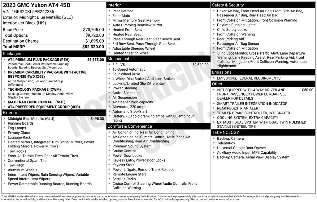 2023 GMC Yukon AT4 Midnight Blue Metallic AT4 4WD 10-Speed Automatic with Overdrive EcoTec3 6.2L V8 4WD, 15" Diagonal Multi-Color Head-Up Display, 2 Presets For Outside Rearview Mirrors, 3 Years of GMC Connected Services, 3 Years of OnStar Safety & Security, 3 Years of OnStar Safety & Security (DISC), 3.23 Rear Axle Ratio, 3rd Row 60/40 Power-Folding Split-Bench Seat, 3rd row seats: split-bench, 4-Wheel Disc Brakes, 9 Speakers, ABS brakes, Adaptive suspension, Air Conditioning, Air Ride Adaptive Suspension, Alloy wheels, AM/FM radio: SiriusXM with 360L, AM/FM Stereo, Apple CarPlay/Android Auto, AT4 Premium Plus Package, Auto High-beam Headlights, Auto-dimming door mirrors, Auto-dimming Rear-View mirror, Auto-leveling suspension, Automatic Emergency Braking, Automatic temperature control, Black Roof-Mounted Luggage Rack Side Rails, Bose 9-Speaker Stereo Audio System Feature, Brake assist, Bright Front & Rear Door Sill Plates, Bumpers: body-color, Compass, Delay-off headlights, Driver door bin, Driver vanity mirror, Dual Exhaust System, Dual front impact airbags, Dual front side impact airbags, Dual-Pane Panoramic Power Sunroof, Electronic Limited Slip Differential (eLSD), Electronic Stability Control, Emergency communication system: OnStar and GMC connected services capable, Extra Capacity Cooling System, Following Distance Indicator, Forward Collision Alert, Four wheel independent suspension, Front & Rear Park Assist, Front anti-roll bar, Front Bucket Seats, Front Center Armrest, Front dual zone A/C, Front fog lights, Front High-Approach Angle Fascia, Front Pedestrian Braking, Front reading lights, Fully automatic headlights, Garage door transmitter, Hands-Free Power Programmable Rear Liftgate, HD Surround Vision, Heated & Ventilated Driver & Front Passenger Seats, Heated 2nd Row Outboard Position Seats, Heated door mirrors, Heated Driver & Front Passenger Seats, Heated front seats, Heated rear seats, Heated Steering Wheel, Heated steering wheel, Heavy-Duty Air Filter, Hill Descent Control, Hitch Guidance w/Hitch View, Illuminated entry, Inside Rear-View Auto-Dimming Mirror, Integrated Trailer Brake Controller, IntelliBeam Automatic High Beam On/Off, Lane Change Alert w/Side Blind Zone Alert, Lane Keep Assist w/Lane Departure Warning, Low tire pressure warning, Magnetic Ride Control Suspension, Max Trailering Package, Memory seat, Navigation System, Not Equipped w/4-Way Driver & Fr Pass Pwr Lumbar, Occupant sensing airbag, Outside Heated Power-Adjustable Mirrors, Outside temperature display, Overhead airbag, Overhead console, Panic alarm, Passenger door bin, Passenger vanity mirror, Perforated Leather Seating Surfaces, Power door mirrors, Power driver seat, Power Liftgate, Power passenger seat, Power Release 2nd Row 60/40 Split-Folding Bench Seat, Power steering, Power Tilt & Telescopic Steering Column, Power windows, Power-Retractable Assist Steps, Preferred Equipment Group 4SB, Premium Capability Package w/Active Response 4WD, Rain sensing wipers, Rear air conditioning, Rear anti-roll bar, Rear Cross Traffic Alert, Rear Pedestrian Alert, Rear reading lights, Rear seat center armrest, Rear window defroster, Rear window wiper, Red Horizontal-Mounted Recovery Hooks, Remote keyless entry, Roof rack: rails only, Safety Alert Seat, Security system, SiriusXM w/360L, Smart Trailer Integration Indicator, Speed control, Speed-sensing steering, Split folding rear seat, Spoiler, Steering wheel memory, Steering wheel mounted audio controls, Tachometer, Technology Package, Telescoping steering wheel, Tilt steering wheel, Traction control, Trailer Side Blind Zone Alert, Trip computer, Turn signal indicator mirrors, Universal Home Remote, Variably intermittent wipers, Ventilated front seats, Voltmeter, Wheels: 20" x 9" 6-Spoke Machined Aluminum, Wireless Charging, 4WD.