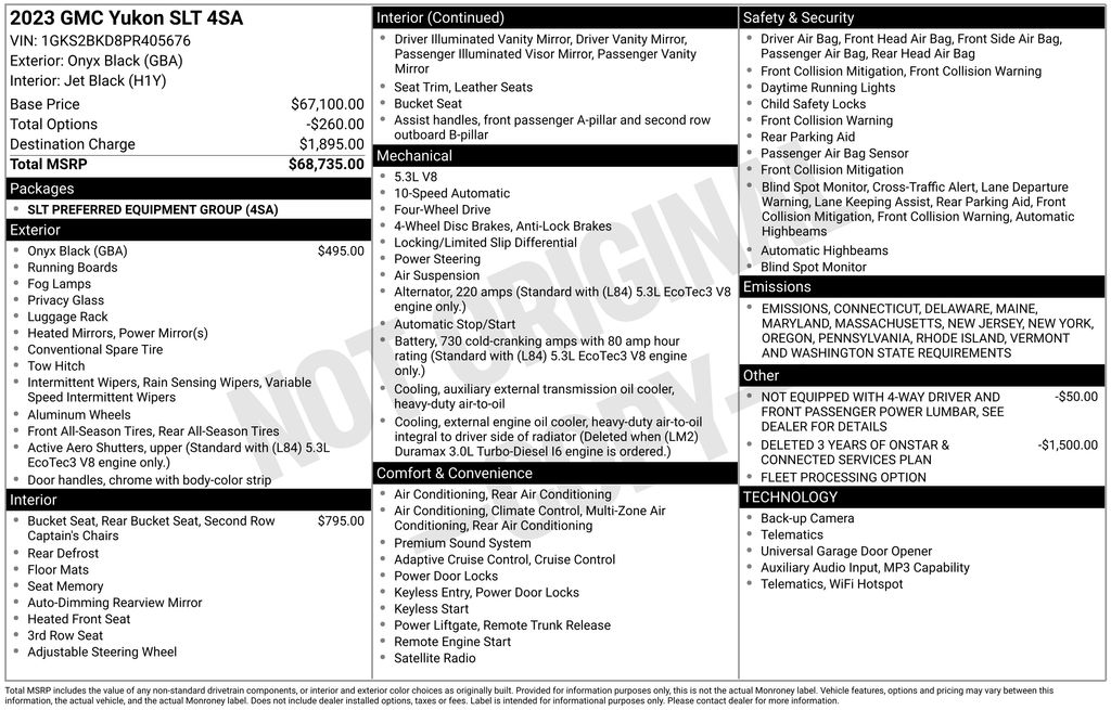 2023 GMC Yukon SLT Certified. Onyx Black SLT 4WD 10-Speed Automatic with Overdrive EcoTec3 5.3L V8 GM Certified, 4WD, 2 Presets For Power Driver Seat, 2nd Row Manual-Folding Bucket Seats, 3.23 Rear Axle Ratio, 3rd row seats: split-bench, 4-Wheel Disc Brakes, 9 Speakers, ABS brakes, Air Conditioning, Alloy wheels, AM/FM radio: SiriusXM with 360L, AM/FM Stereo, Apple CarPlay/Android Auto, Auto High-beam Headlights, Auto-dimming Rear-View mirror, Automatic Emergency Braking, Automatic temperature control, Bodyside moldings, Bose 9-Speaker Stereo Audio System Feature, Brake assist, Bright Chrome Bodyside Moldings, Bright Front & Rear Door Sill Plates, Bumpers: body-color, Chrome Door Handles w/Body-Color Strip, Compass, Delay-off headlights, Deleted 3 Years of OnStar & Connected Services Plan, Driver door bin, Driver vanity mirror, Dual front impact airbags, Dual front side impact airbags, Electronic Stability Control, Emergency communication system: OnStar and GMC connected services capable, Following Distance Indicator, Forward Collision Alert, Four wheel independent suspension, Front & Rear Park Assist, Front anti-roll bar, Front Bucket Seats, Front Center Armrest, Front dual zone A/C, Front fog lights, Front Pedestrian Braking, Front reading lights, Fully automatic headlights, Garage door transmitter, Hands-Free Power Programmable Rear Liftgate, Heated & Ventilated Driver & Front Passenger Seats, Heated door mirrors, Heated Driver & Front Passenger Seats, Heated front seats, Illuminated entry, Inside Rear-View Auto-Dimming Mirror, IntelliBeam Automatic High Beam On/Off, Lane Change Alert w/Side Blind Zone Alert, Lane Keep Assist w/Lane Departure Warning, Low tire pressure warning, Memory seat, Navigation System, Not Equipped w/4-Way Driver & Fr Pass Pwr Lumbar, Occupant sensing airbag, Outside temperature display, Overhead airbag, Overhead console, Panic alarm, Passenger door bin, Passenger vanity mirror, Perforated Leather-Appointed Seating, Power door mirrors, Power driver seat, Power Liftgate, Power passenger seat, Power steering, Power windows, Preferred Equipment Group 4SA, Premium Smooth Ride Suspension, Rain sensing wipers, Rear air conditioning, Rear anti-roll bar, Rear Cross Traffic Alert, Rear reading lights, Rear seat center armrest, Rear window defroster, Rear window wiper, Remote keyless entry, Roof rack: rails only, Safety Alert Seat, Security system, SiriusXM w/360L, Speed control, Speed-sensing steering, Split folding rear seat, Spoiler, Steering wheel mounted audio controls, Tachometer, Telescoping steering wheel, Tilt steering wheel, Traction control, Trip computer, Universal Home Remote, Variably intermittent wipers, Ventilated front seats, Voltmeter, Wheels: 20" x 9" 6-Spoke Polished Aluminum, Wireless Charging, 4WD.