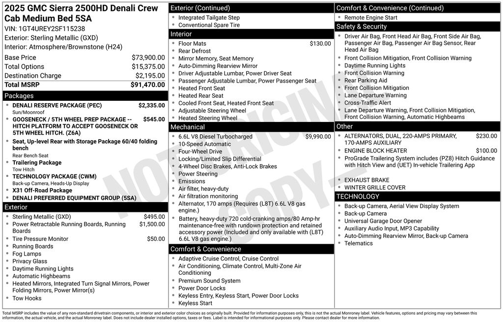 2025 GMC Sierra 2500HD Denali Sterling Metallic Denali 4WD 10-Speed Automatic Duramax 6.6L V8 Turbodiesel 10-Speed Automatic, 4WD, Atmosphere/Brownstone Leather, 12-Way Power Driver Seat Adjuster w/Lumbar, 12-Way Power Passenger Seat Adjuster w/Lumbar, 120-Volt Bed Mounted Power Outlet, 120-Volt Instrument Panel Power Outlet, 2 Charge-Only Rear USB Ports, 2 Charge/Data USB Ports Inside Center Console, 2 USB Ports, 2-Speed Active Transfer Case, 4-Wheel Disc Brakes, 7 Speakers, ABS brakes, Air Conditioning, Alloy wheels, AM/FM radio: SiriusXM with 360L, Apple CarPlay/Android Auto, Auto High-beam Headlights, Auto-dimming door mirrors, Auto-dimming Rear-View mirror, Automatic Emergency Braking, Automatic temperature control, Bed View Camera w/2 Trailer Camera Provisions, Bose Premium 7-Speaker Sound System, Brake assist, Buckle to Drive, Bumpers: body-color, Compass, Deep-Tinted Glass, Delay-off headlights, Denali Reserve Package, Driver door bin, Driver Memory, Driver vanity mirror, Dual 220-Amps Primary/170-Amps Aux Alternators, Dual front impact airbags, Dual front side impact airbags, Electric Rear-Window Defogger, Electronic Stability Control, Emergency communication system: OnStar, Engine Block Heater, Exhaust Brake, Floor-Mounted Center Console, Following Distance Indicator, Forge Perforated Leather-Appointed Front Seat Trim, Forward Collision Alert, Front anti-roll bar, Front Bucket Seats, Front Center Armrest, Front dual zone A/C, Front fog lights, Front Pedestrian Braking, Front Prem Floor Liners w/Removable Carpet Insert, Front Rain-Sensing Wipers, Front reading lights, Front wheel independent suspension, Fully automatic headlights, Garage door transmitter, Genuine wood dashboard insert, Genuine wood door panel insert, Gooseneck/5th Wheel Prep Package, HD Surround Vision, Heated 2nd Row Outboard Seats, Heated door mirrors, Heated Driver & Front Outboard Passenger Seats, Heated front seats, Heated rear seats, Heated steering wheel, Heavy-Duty 80 Amp Battery, Hill Descent Control, Hitch Guidance w/Hitch View, Illuminated entry, In-Vehicle Trailering System App, Inside Rearview Auto-Dimming Rear Camera Mirror, IntelliBeam Automatic High Beam On/Off, Keyless Open & Start, Lane Departure Warning System, LED Cargo Area Lighting, LED Smoked Amber Roof Marker Lamps, Low tire pressure warning, Manual Tilt-Wheel/Telescoping Steering Column, Memory seat, Multicolor 15" Diagonal Head-Up Display, Occupant sensing airbag, Off-Road Suspension, OnStar Services Capable, Outside temperature display, Overhead airbag, Overhead console, Panic alarm, Passenger door bin, Passenger vanity mirror, Pickup Box, Polished Exhaust Tip, Power door mirrors, Power driver seat, Power Front Passenger Windows w/Express Up/Down, Power passenger seat, Power Sliding Rear Window w/Defogger, Power steering, Power Sunroof, Power windows, Power-Retractable Assist Steps, Preferred Equipment Group 5SA, Push Button Start, Radio: AM/FM w/Premium GMC Infotainment System, Rain sensing wipers, Rear Cross Traffic Alert, Rear Prem Floor Liners w/Removable Carpet Insert, Rear reading lights, Rear seat center armrest, Rear step bumper, Rear Wheelhouse Liners, Rear window defroster, Remote keyless entry, Remote Vehicle Starter System, Safety Alert Seat, Security system, Signature Chrome Denali Grille, SiriusXM w/360L Trial Subscription, Speed control, Speed-sensing steering, Split folding rear seat, Spray-On Pickup Bedliner w/GMC Logo, Steering Wheel Audio Controls, Steering wheel mounted audio controls, Tachometer, Technology Package, Telescoping steering wheel, Tilt steering wheel, Traction control, Trailer Cam Provisions & Trailer Viewing Software, Trailer Side Blind Zone Alert, Trailer Tire Pressure Monitor Sensors, Trip computer, Turn signal indicator mirrors, Ultrasonic Front & Rear Park Assist, Unauthorized Entry Theft-Deterrent System, Universal Home Remote, Variably intermittent wipers, Ventilated Driver & Front Passenger Seats, Ventilated front seats, Voltmeter, W