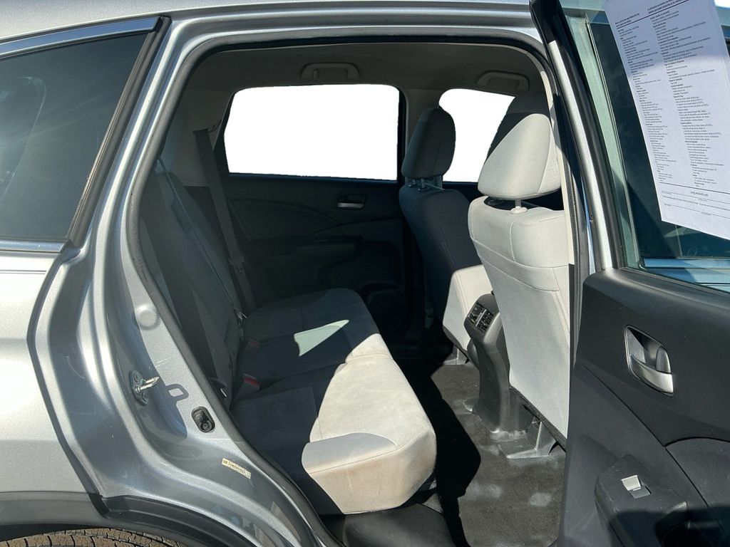 2015 Honda CR-V LX Silver LX FWD CVT 2.4L I4 DOHC 16V i-VTEC 16" Styled Steel Wheels, 4 Speakers, 4-Wheel Disc Brakes, 5.048 Axle Ratio, ABS brakes, Air Conditioning, AM/FM radio, AM/FM/CD Audio System w/4 Speakers, Brake assist, Bumpers: body-color, CD player, Cloth Seat Trim, Compass, Delay-off headlights, Driver door bin, Driver vanity mirror, Dual front impact airbags, Dual front side impact airbags, Electronic Stability Control, Exterior Parking Camera Rear, Four wheel independent suspension, Front anti-roll bar, Front Bucket Seats, Front Center Armrest, Front reading lights, Illuminated entry, Low tire pressure warning, Occupant sensing airbag, Outside temperature display, Overhead airbag, Overhead console, Panic alarm, Passenger door bin, Passenger vanity mirror, Power door mirrors, Power steering, Power windows, Radio data system, Rear anti-roll bar, Rear seat center armrest, Rear window defroster, Rear window wiper, Remote keyless entry, Speed control, Speed-sensing steering, Split folding rear seat, Steering wheel mounted audio controls, Tachometer, Telescoping steering wheel, Tilt steering wheel, Traction control, Trip computer.