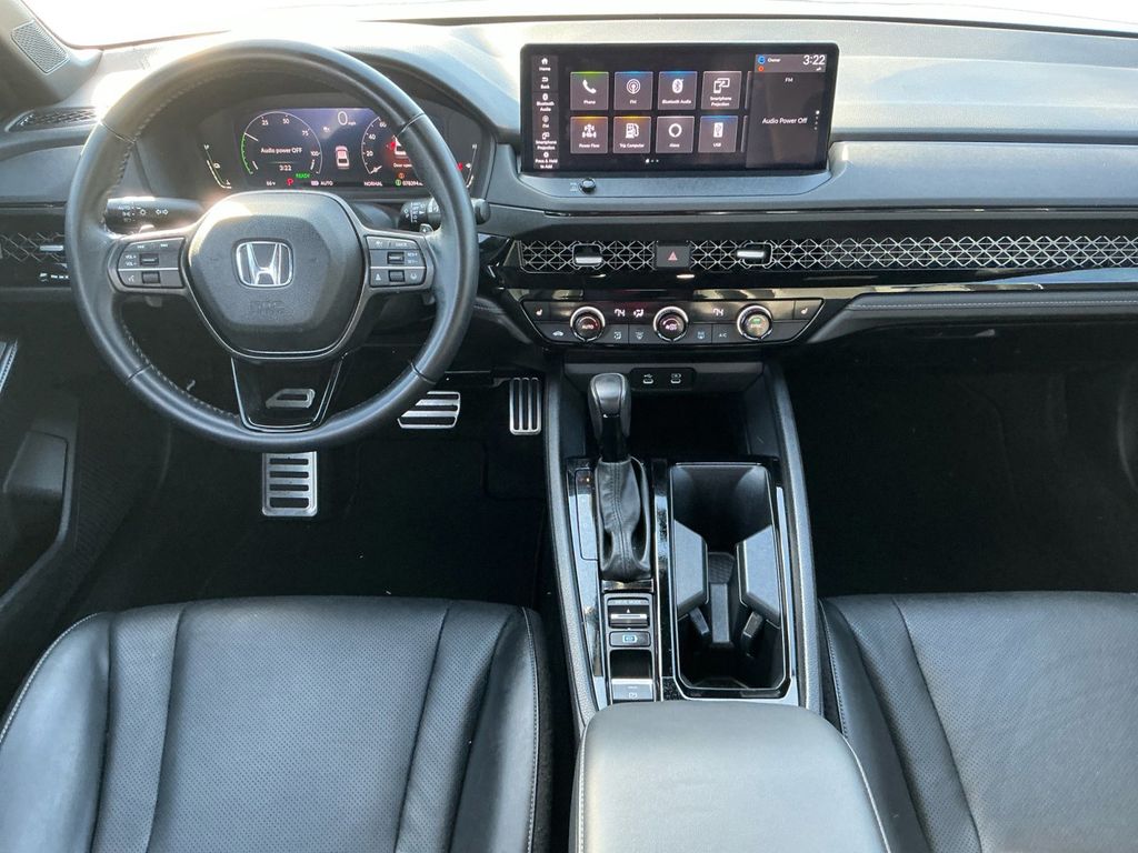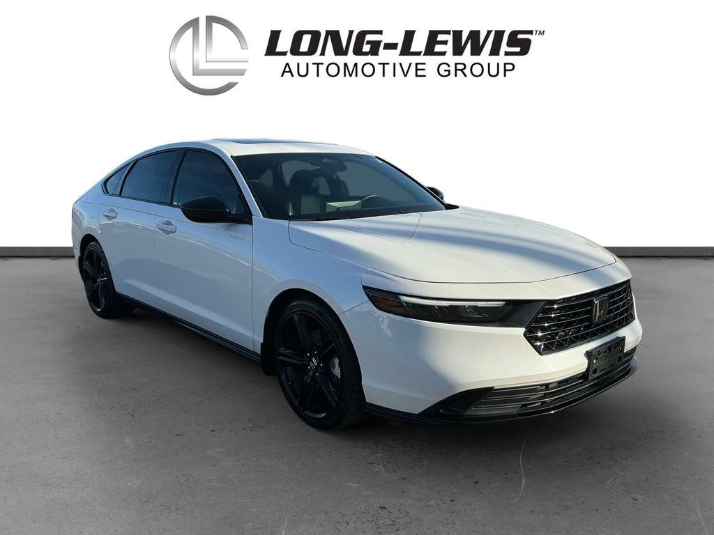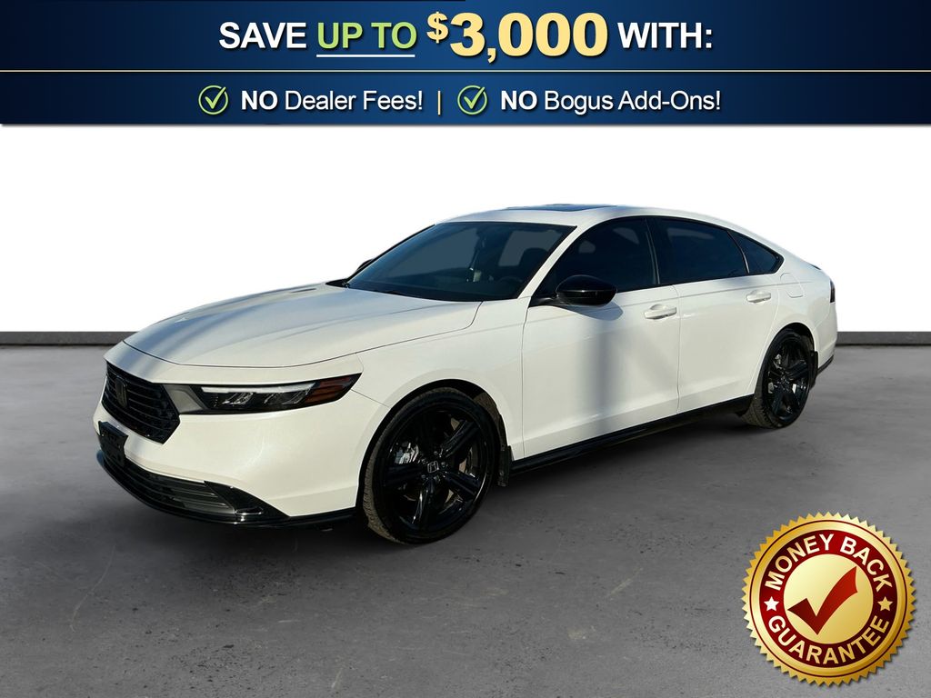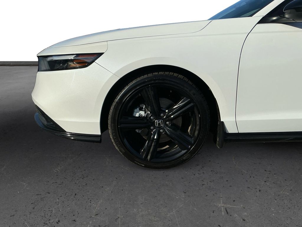 2023 Honda Accord Hybrid Sport-L White Sport-L FWD eCVT 2.0L 16V DOHC 2.0L 16V DOHC, 4-Wheel Disc Brakes, 8 Speakers, ABS brakes, Adaptive Cruise Control: Adaptive Cruise Control (ACC) with Low-Speed Follow, Air Conditioning, Alloy wheels, AM/FM radio, Apple CarPlay/Android Auto, Auto High-beam Headlights, Automatic temperature control, Brake assist, Bumpers: body-color, Compass, Delay-off headlights, Driver door bin, Driver vanity mirror, Dual front impact airbags, Dual front side impact airbags, Electronic Stability Control, Emergency communication system: HondaLink, Exterior Parking Camera Rear, Four wheel independent suspension, Front anti-roll bar, Front Bucket Seats, Front Center Armrest, Front dual zone A/C, Front reading lights, Fully automatic headlights, Heated Front Bucket Seats, Heated front seats, Illuminated entry, Knee airbag, Lane departure: Lane Keeping Assist System (LKAS) active, Leather Shift Knob, Leather steering wheel, Leather-Trimmed Seat Trim, Low tire pressure warning, Memory seat, Occupant sensing airbag, Outside temperature display, Overhead airbag, Overhead console, Panic alarm, Passenger door bin, Passenger vanity mirror, Power door mirrors, Power driver seat, Power moonroof, Power passenger seat, Power steering, Power windows, Radio data system, Radio: 180-Watt Audio System, Rear anti-roll bar, Rear reading lights, Rear seat center armrest, Rear side impact airbag, Rear window defroster, Remote keyless entry, Security system, Speed control, Speed-sensing steering, Speed-Sensitive Wipers, Split folding rear seat, Spoiler, Steering wheel mounted audio controls, Telescoping steering wheel, Tilt steering wheel, Traction control, Trip computer, Variably intermittent wipers, Wheels: 19" x 8.5J Matte Berlina Black, 2.0L 16V DOHC.