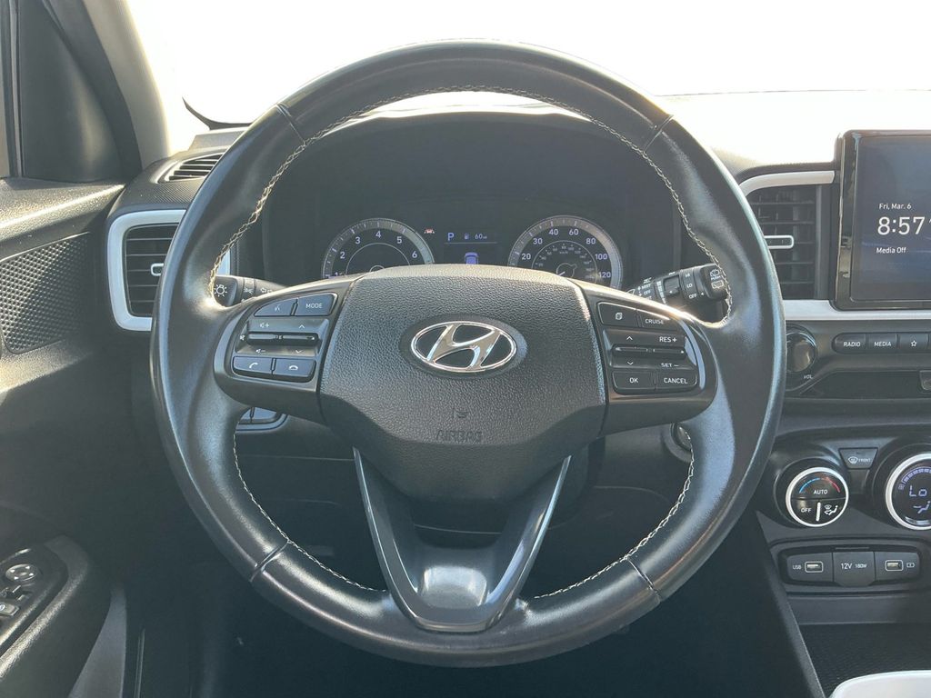 2022 Hyundai Venue Limited Intense Blue Limited FWD CVT I4 4-Wheel Disc Brakes, 6 Speakers, 6.483 Axle Ratio, 6.5J x 17" Alloy Wheels, ABS brakes, Air Conditioning, Alloy wheels, AM/FM radio: SiriusXM, Apple CarPlay & Android Auto, Auto High-beam Headlights, Automatic temperature control, Brake assist, Bumpers: body-color, Cargo Tray, Carpeted Floor Mats, Cloth Seat Trim, Delay-off headlights, Driver door bin, Driver vanity mirror, Dual front impact airbags, Dual front side impact airbags, Electronic Stability Control, Emergency communication system, Front anti-roll bar, Front Bucket Seats, Front Center Armrest, Front reading lights, Front wheel independent suspension, Fully automatic headlights, Heated door mirrors, Heated Front Bucket Seats, Heated front seats, Illuminated entry, Leather Shift Knob, Leather steering wheel, Low tire pressure warning, Navigation System, Occupant sensing airbag, Option Group 01, Outside temperature display, Overhead airbag, Overhead console, Panic alarm, Passenger door bin, Passenger vanity mirror, Power door mirrors, Power steering, Power windows, Radio: AM/FM/HD/SiriusXM Display Audio, Rear Bumper Applique, Rear Seat Cup Holder, Rear window defroster, Rear window wiper, Remote keyless entry, Roof rack: rails only, Security system, Speed control, Speed-sensing steering, Split folding rear seat, Spoiler, Steering wheel mounted audio controls, Tachometer, Telescoping steering wheel, Tilt steering wheel, Traction control, Trip computer, Variably intermittent wipers, Wheel Locks.
