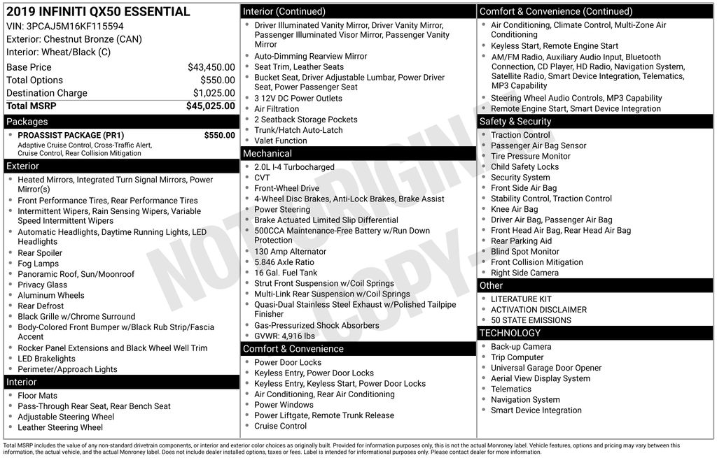 2019 INFINITI QX50 ESSENTIAL Chestnut Bronze ESSENTIAL FWD CVT I4 4-Wheel Disc Brakes, 5.846 Axle Ratio, 6 Speakers, ABS brakes, Activation Disclaimer, Air Conditioning, Alloy wheels, AM/FM radio: SiriusXM, AM/FM/CD Audio System, Anti-whiplash front head restraints, Auto-dimming Rear-View mirror, Automatic temperature control, Back-Up Collision Intervention (BCI), Brake assist, Bumpers: body-color, CD player, Delay-off headlights, Distance Control Assist, Driver door bin, Driver vanity mirror, Dual front impact airbags, Dual front side impact airbags, Electronic Stability Control, Emergency communication system: INFINITI Connection, Exterior Parking Camera Rear, Floor Mats, Four wheel independent suspension, Front anti-roll bar, Front Bucket Seats, Front Center Armrest, Front dual zone A/C, Front fog lights, Front reading lights, Garage door transmitter: HomeLink, Heated door mirrors, Illuminated entry, Intelligent Cruise Control, Knee airbag, Leather Shift Knob, Literature Kit, Low tire pressure warning, Navigation system: INFINITI InTouch Navigation, Occupant sensing airbag, Outside temperature display, Overhead airbag, Overhead console, Panic alarm, Passenger door bin, Passenger vanity mirror, Power door mirrors, Power driver seat, Power Liftgate, Power moonroof, Power passenger seat, Power steering, Power windows, ProASSIST Package, Radio data system, Rain sensing wipers, Rear air conditioning, Rear anti-roll bar, Rear Cross Traffic Alert, Rear reading lights, Rear seat center armrest, Rear window defroster, Rear window wiper, Remote keyless entry, Roof rack: rails only, Security system, Speed control, Speed-sensing steering, Speed-Sensitive Wipers, Split folding rear seat, Spoiler, Standard Leather Seat Trim, Steering wheel mounted audio controls, Tachometer, Telescoping steering wheel, Tilt steering wheel, Traction control, Trip computer, Turn signal indicator mirrors, Variably intermittent wipers, Wheels: 19" x 7.5J Silver Painted Aluminum Alloy.