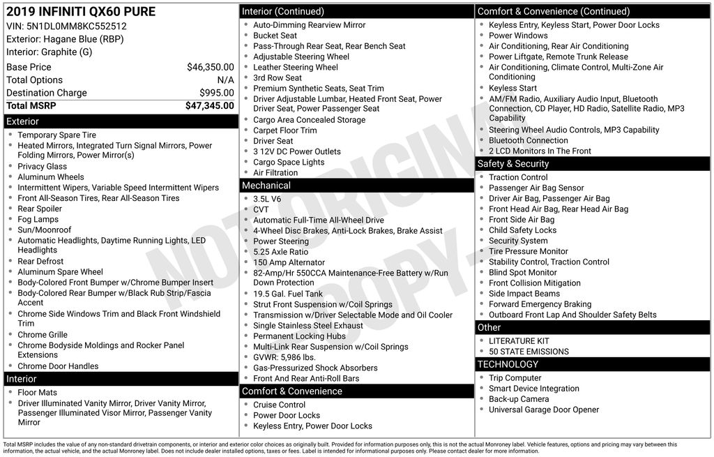 2019 INFINITI QX60 PURE Hagane Blue PURE AWD CVT 3.5L V6 3rd row seats: bench, 4-Wheel Disc Brakes, 5.25 Axle Ratio, 6 Speakers, ABS brakes, Air Conditioning, Alloy wheels, AM/FM radio: SiriusXM, AM/FM/CD Audio System, Anti-whiplash front head restraints, Auto-dimming Rear-View mirror, Automatic temperature control, Bodyside moldings, Brake assist, Bumpers: body-color, Carpeted Floor Mats (4-Piece Set), CD player, Delay-off headlights, Driver door bin, Driver vanity mirror, Dual front impact airbags, Dual front side impact airbags, Electronic Stability Control, Four wheel independent suspension, Front anti-roll bar, Front Bucket Seats, Front Center Armrest w/Storage, Front dual zone A/C, Front fog lights, Front reading lights, Fully automatic headlights, Garage door transmitter: HomeLink, Heated door mirrors, Heated Front Seats, Heated front seats, Illuminated entry, Leather steering wheel, Leatherette Seat Trim, Literature Kit, Low tire pressure warning, Occupant sensing airbag, Outside temperature display, Overhead airbag, Overhead console, Panic alarm, Passenger door bin, Passenger vanity mirror, Power door mirrors, Power driver seat, Power Liftgate, Power moonroof, Power passenger seat, Power steering, Power windows, Radio data system, Rear air conditioning, Rear anti-roll bar, Rear reading lights, Rear seat center armrest, Rear window defroster, Rear window wiper, Reclining 3rd row seat, Remote keyless entry, Security system, Speed control, Speed-sensing steering, Speed-Sensitive Wipers, Split folding rear seat, Spoiler, Steering wheel mounted audio controls, Tachometer, Telescoping steering wheel, Tilt steering wheel, Traction control, Trip computer, Turn signal indicator mirrors, Variably intermittent wipers, Wheels: 18" Triple 5-Spoke Aluminum-Alloy.