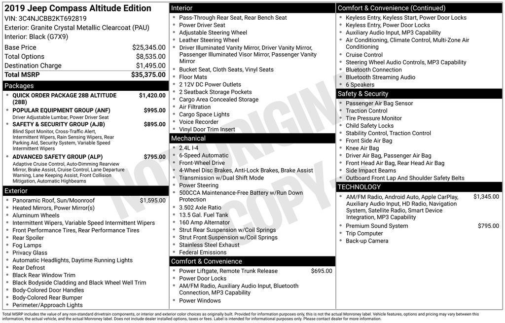 2019 Jeep Compass Altitude Granite Crystal Metallic Clearcoat Altitude FWD 6-Speed Aisin Automatic 2.4L I4 1-Year SiriusXM Guardian Trial, 3.502 Axle Ratio, 4-Way Power Lumbar Adjust, 4-Wheel Disc Brakes, 6 Speakers, 8.4" Touch Screen Display, ABS brakes, Adaptive Cruise Control w/Stop & Go, Advanced Brake Assist, Advanced Safety Group, Air Conditioning, Alloy wheels, Altitude Special Edition, AM/FM radio, Anti-whiplash front head restraints, Apple CarPlay, Auto High Beam Headlamp Control, Auto-Dimming Rear-View Mirror, Automatic temperature control, Beats Premium Audio System, Black Day Light Opening Moldings, Black Grille w/Black Rings, Black Roof, Blind Spot & Cross Path Detection, Bluetooth Integrated Voice Command, Bluetooth® Streaming Audio, Brake assist, Bright Exhaust Tip, Bumpers: body-color, Cluster 7.0" Color Driver Info Display, Compass, Delay-off headlights, Driver door bin, Driver vanity mirror, Dual front impact airbags, Dual front side impact airbags, Electronic Stability Control, Four wheel independent suspension, Front anti-roll bar, Front Bucket Seats, Front Center Armrest w/Storage, Front dual zone A/C, Front fog lights, Front reading lights, Full Speed FWD Collision Warn Plus, Fully automatic headlights, Gloss Black Compass Badge, Gloss Black Fog Lamp Bezels, Gloss Black Jeep Badge, Gloss Black Lower Rear Fascia Valance, Google Android Auto, GPS Antenna Input, GPS Navigation, HD Radio, Heated door mirrors, Illuminated entry, Knee airbag, Lane Departure Warning Plus, Leather Shift Knob, Low tire pressure warning, Media Hub (USB, AUX), Occupant sensing airbag, Outside temperature display, Overhead airbag, Overhead console, Panic alarm, ParkSense Rear Park Assist System, ParkView Rear Back-Up Camera, Passenger door bin, Passenger vanity mirror, Piano Black Interior Accents, Popular Equipment Group, Power 8-Way Driver/Manual 6-Way Passenger Seats, Power door mirrors, Power Front/Fixed Rear Full Sunroof, Power Liftgate, Power steering, Power windows, Premium Cloth/Vinyl Bucket Seats, Quick Order Package 28B Altitude, Radio: Uconnect 4 w/7" Display, Radio: Uconnect 4C Nav w/8.4" Display, Rain Sensitive/Intermittent Wipers, Rear anti-roll bar, Rear seat center armrest, Rear window defroster, Rear window wiper, Remote keyless entry, Roof rack: rails only, Safety & Security Group, Security Alarm, SiriusXM Traffic Plus, SiriusXM Travel Link, Speed control, Split folding rear seat, Spoiler, Steering wheel mounted audio controls, Tachometer, Telescoping steering wheel, Tilt steering wheel, Traction control, Trip computer, USB Host Flip, Variably intermittent wipers, Wheels: 17" x 7.0" Silver Painted Aluminum, Wheels: 18" x 7.0" Black Aluminum.